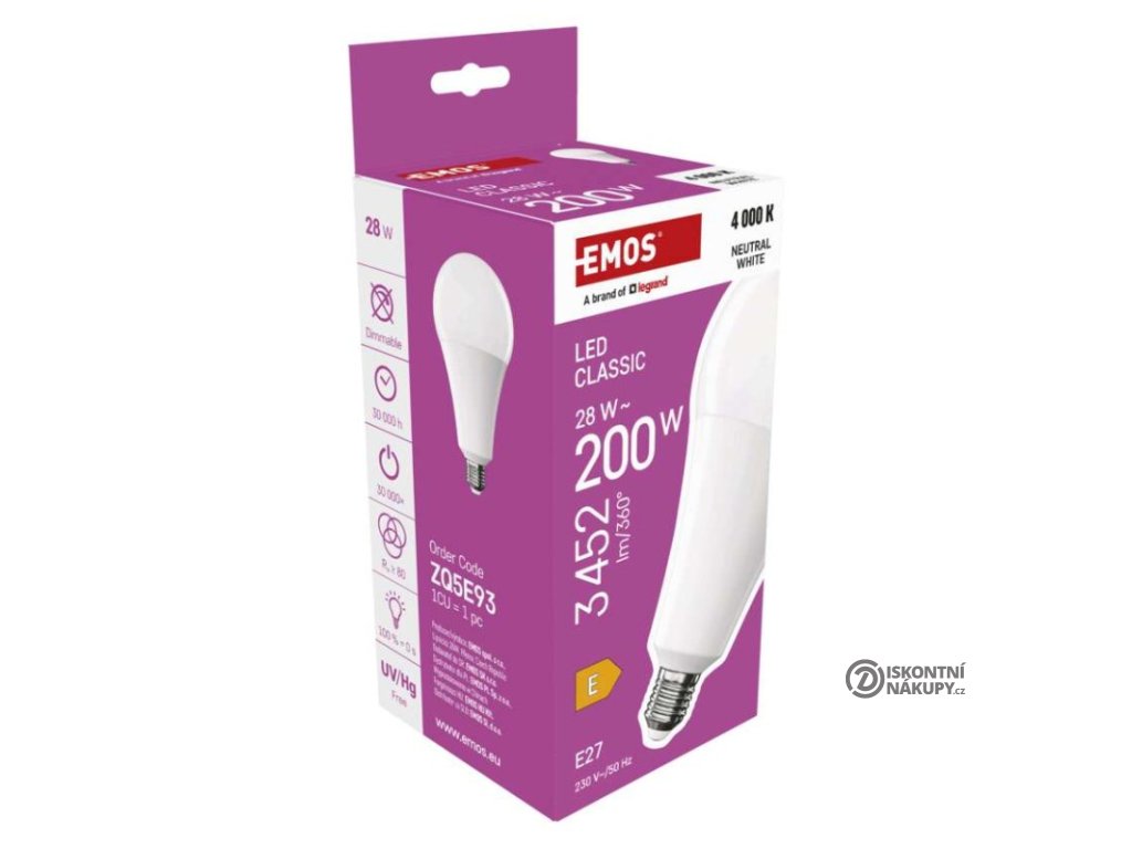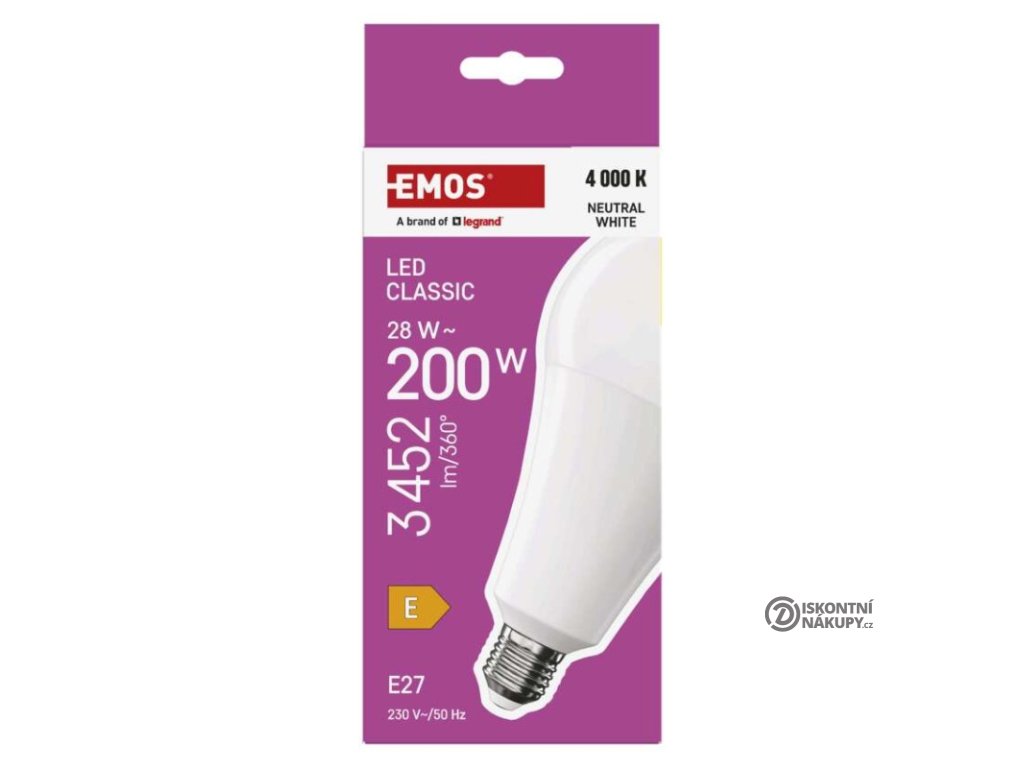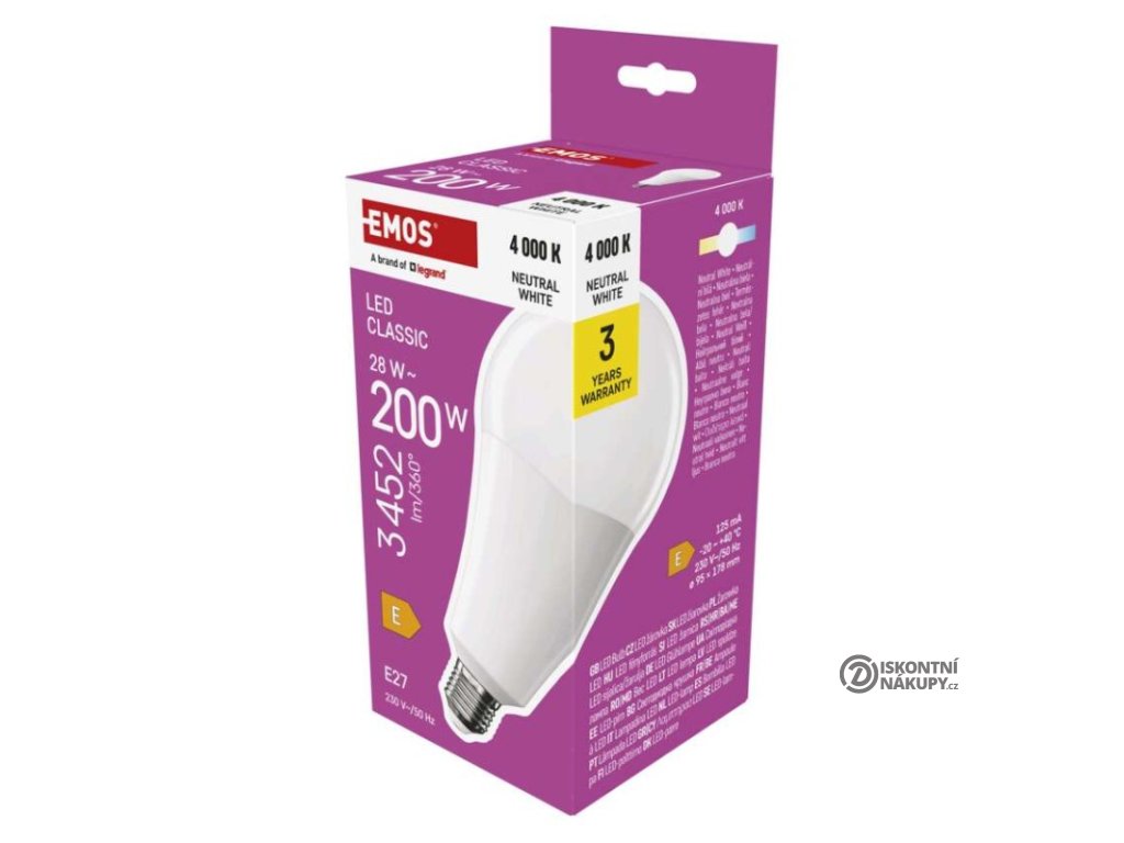 barva světla: neutrální bílá|energetická třída: E|index podání barev (CRI): 80|kompatibilita: neuvádí se|náhrada za žárovku: 200 W|napětí: 230 V~/50 Hz|notifikace do mobilní aplikace: neuvádí se|ovládání hlasovými asistenty: neuvádí se|patice (uchycení žárovky): E27|počet čipů: neuvádí se|počet spínacích cyklů: 30 000|podporované OS: neuvádí se|přenosová frekvence: neuvádí se|příkon: 28 W|prodejní obal: 1 ks, krabička|protokol: neuvádí se|řada: CLASSIC|rozměr: 95 × 95 × 178 mm|stmívatelná: ne|světelná účinnost: 123 lm/W|světelný tok: 3 452 lm|technologie: LED|teplota chromatičnosti: 4 000 K|tvar: A95|typ čipů: SMD|účiník: 0,90|úhel vyzařování: 180°|záruční doba: 3 roky|životnost: 30 000 hodinDoplňkové parametry