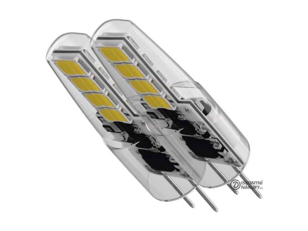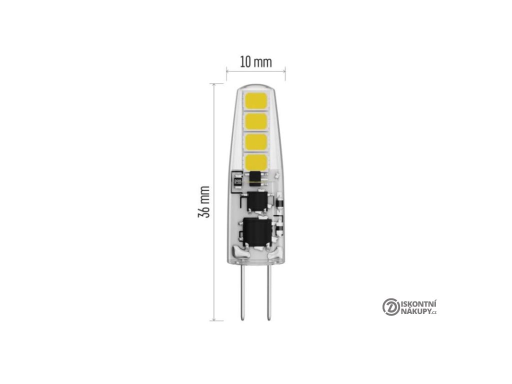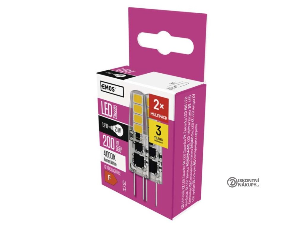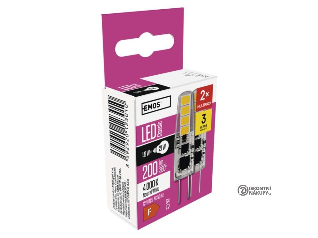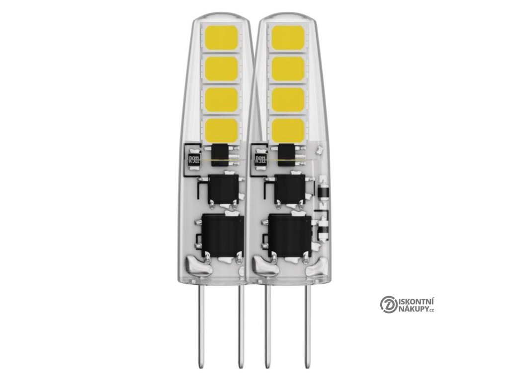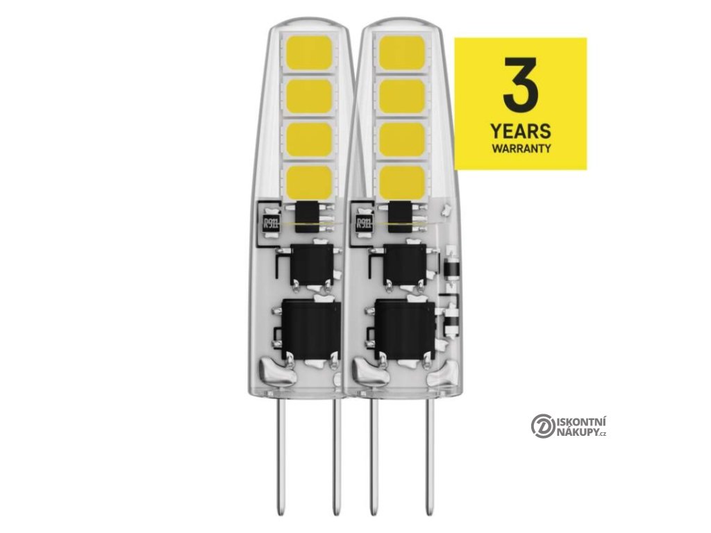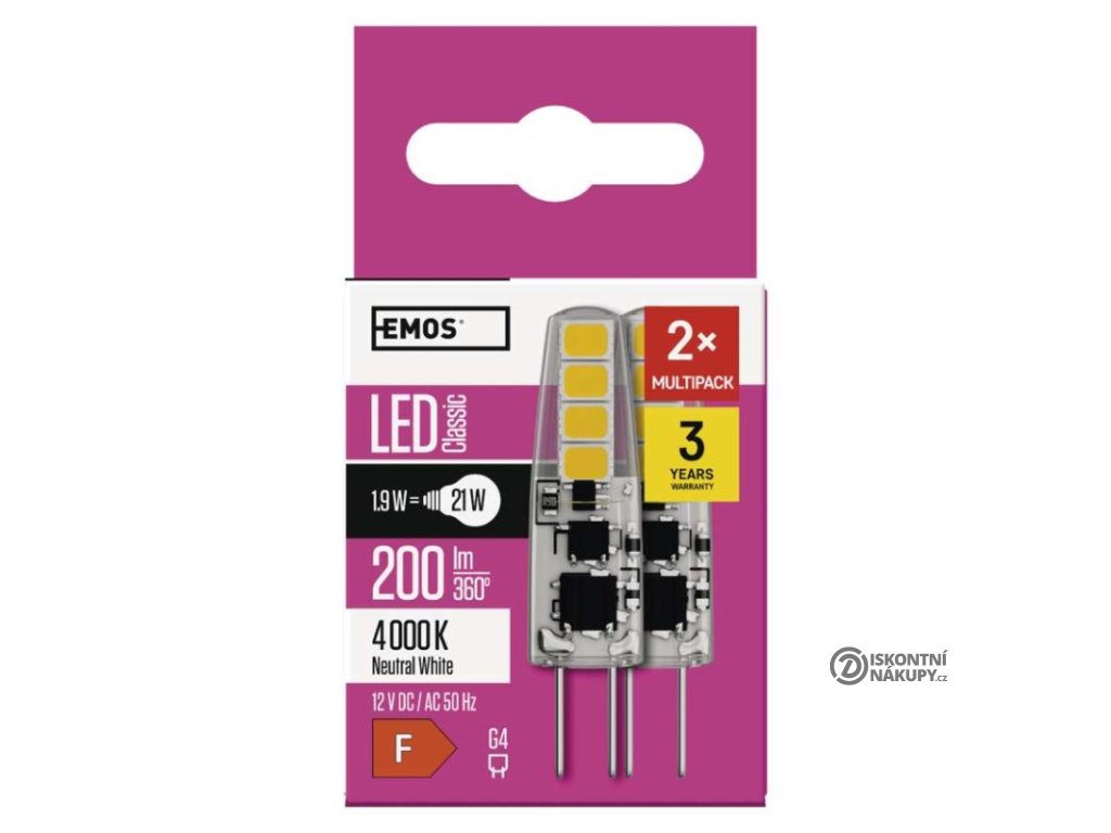 barva světla: neutrální bílá|energetická třída: F|index podání barev (CRI): 80|kompatibilita: neuvádí se|náhrada za žárovku: 21 W|napětí: 12 V|notifikace do mobilní aplikace: neuvádí se|ovládání hlasovými asistenty: neuvádí se|patice (uchycení žárovky): G4|počet čipů: neuvádí se|počet spínacích cyklů: 25 000|podporované OS: neuvádí se|přenosová frekvence: neuvádí se|příkon: 1,9 W|prodejní obal: 2 ks, krabička|protokol: neuvádí se|řada: CLASSIC|rozměr: 36 × 10 × 10 mm|stmívatelná: ne|světelná účinnost: 105 lm/W|světelný tok: 200 lm|technologie: LED|teplota chromatičnosti: 4 000 K|tvar: JC|typ čipů: SMD|účiník: 0,69|úhel vyzařování: 300°|záruční doba: 3 roky|životnost: 30 000 hodinDoplňkové parametry