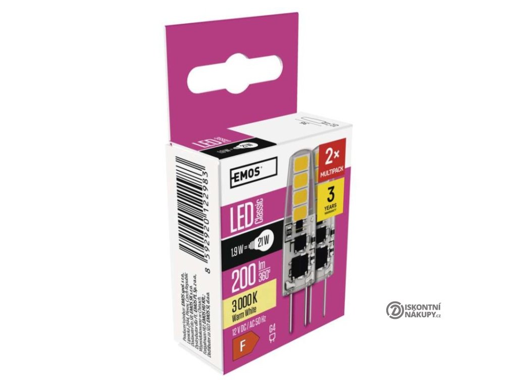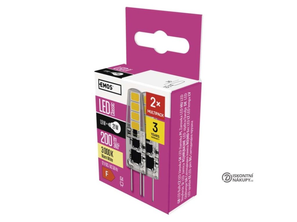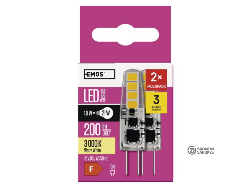 barva světla: teplá bílá|energetická třída: F|index podání barev (CRI): 80|kompatibilita: neuvádí se|náhrada za žárovku: 21 W|napětí: 12 V|notifikace do mobilní aplikace: neuvádí se|ovládání hlasovými asistenty: neuvádí se|patice (uchycení žárovky): G4|počet čipů: neuvádí se|počet spínacích cyklů: 25 000|podporované OS: neuvádí se|přenosová frekvence: neuvádí se|příkon: 1,9 W|prodejní obal: 2 ks, krabička|protokol: neuvádí se|řada: CLASSIC|rozměr: 36 × 10 × 10 mm|stmívatelná: ne|světelná účinnost: 105 lm/W|světelný tok: 200 lm|technologie: LED|teplota chromatičnosti: 3 000 K|tvar: JC|typ čipů: SMD|účiník: 0,71|úhel vyzařování: 300°|záruční doba: 3 roky|životnost: 30 000 hodinDoplňkové parametry