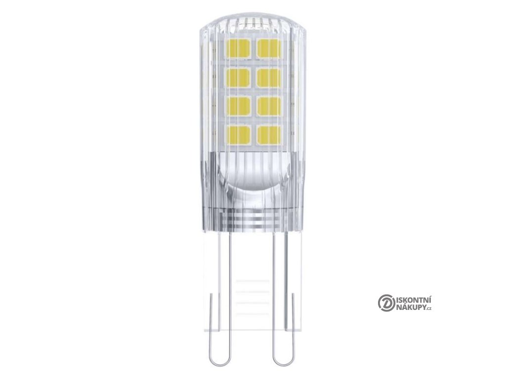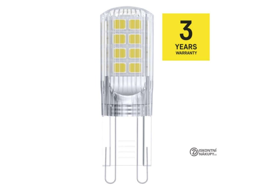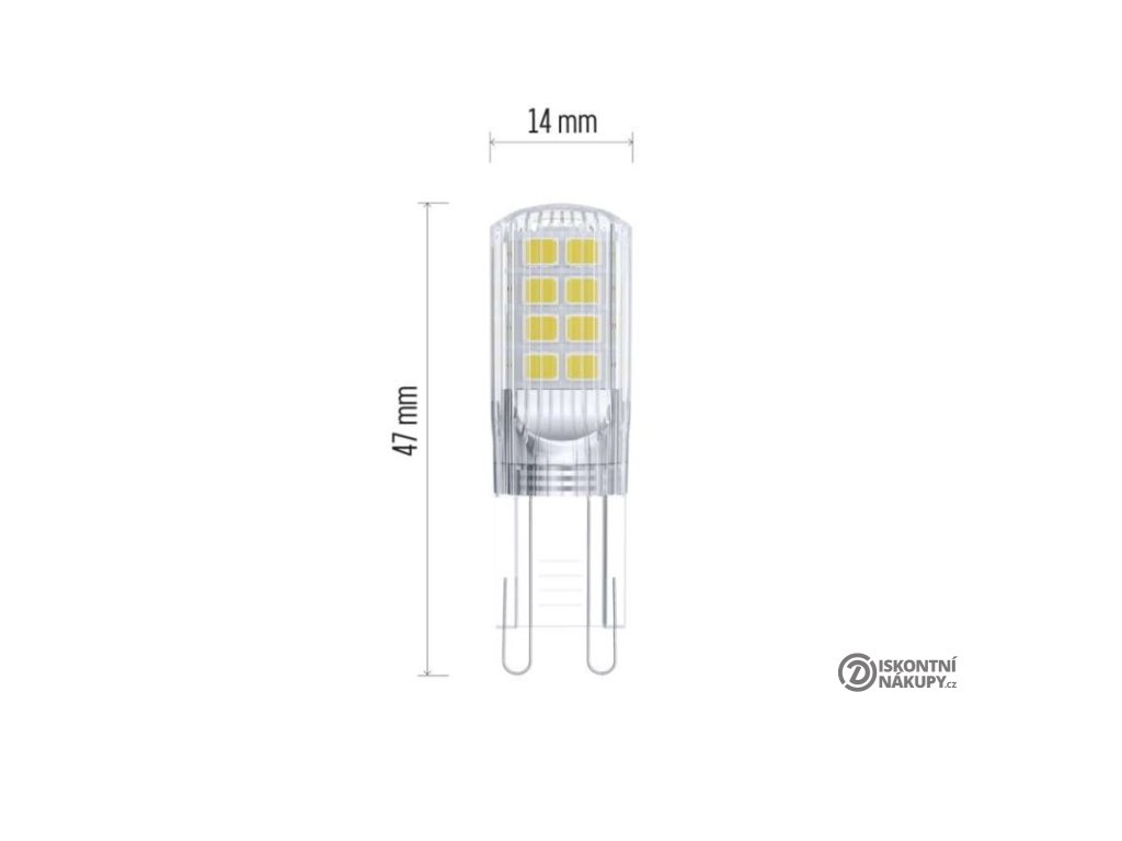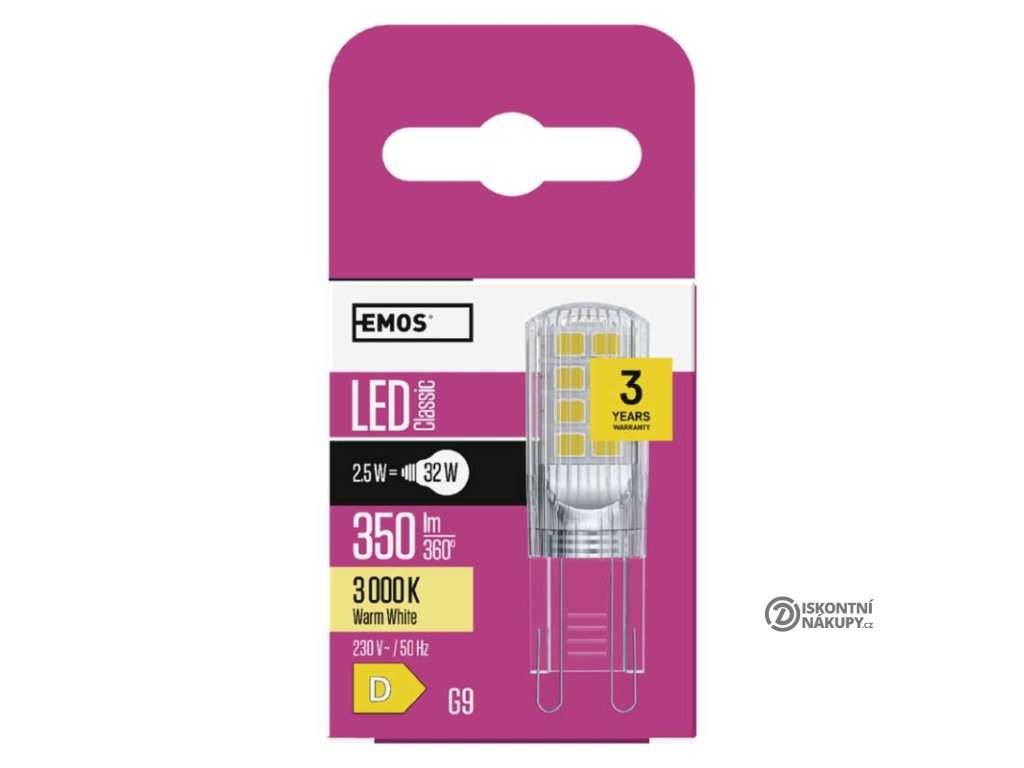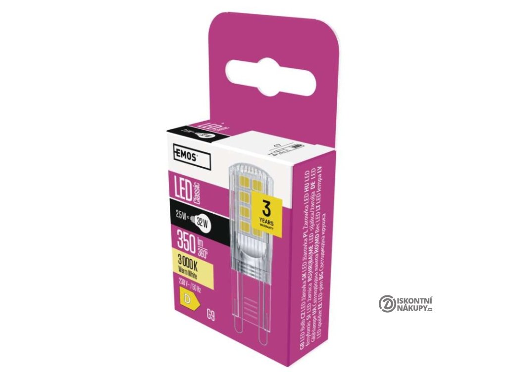 barva světla: teplá bílá|energetická třída: D|index podání barev (CRI): 80|kompatibilita: –|náhrada za žárovku: 32 W|napětí: 230 V~/50 Hz|notifikace do mobilní aplikace: –|ovládání hlasovými asistenty: –|patice (uchycení žárovky): G9|počet čipů: 18|počet spínacích cyklů: 25 000|podporované OS: –|přenosová frekvence: –|příkon: 2,5 W|prodejní obal: 1 ks, krabička|protokol: –|řada: CLASSIC|rozměr: 47 × 14 × 14 mm|stmívatelná: ne|světelná účinnost: 140 lm/W|světelný tok: 350 lm|technologie: LED|teplota chromatičnosti: 3 000 K|tvar: JC|typ čipů: SMD|účiník: 0,59|úhel vyzařování: 320°|záruční doba: 3 roky|životnost: 30 000 hodinDoplňkové parametry