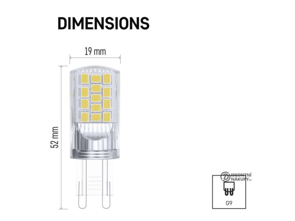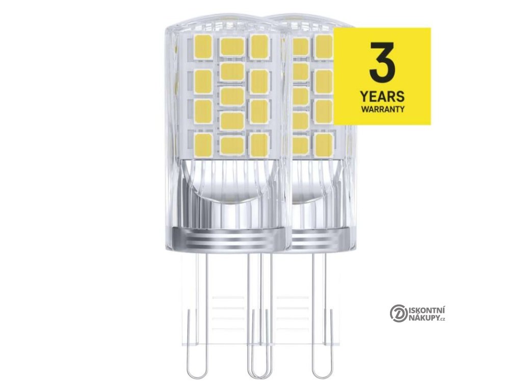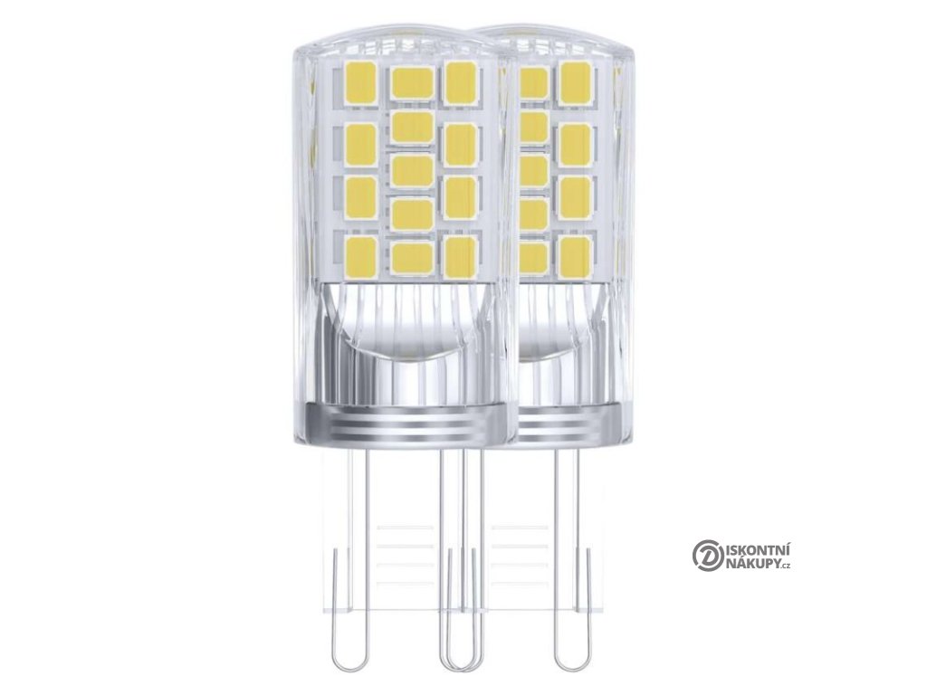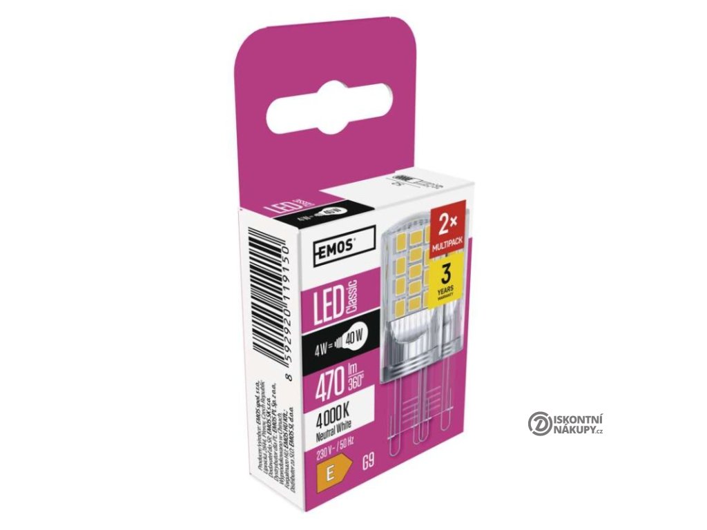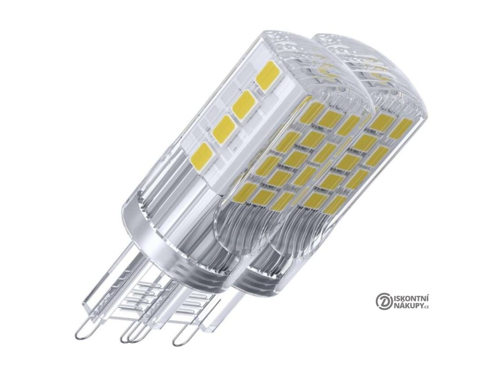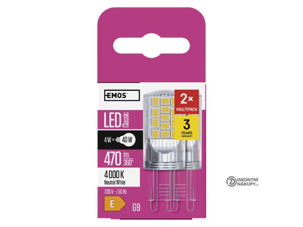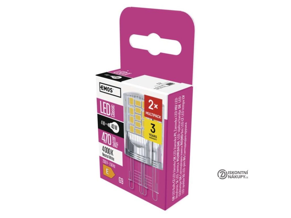 barva světla: neutrální bílá|energetická třída: E|index podání barev (CRI): 80|kompatibilita: –|náhrada za žárovku: 40 W|napětí: 230 V~/50 Hz|notifikace do mobilní aplikace: –|ovládání hlasovými asistenty: –|patice (uchycení žárovky): G9|počet čipů: 34|počet spínacích cyklů: 25 000|podporované OS: –|přenosová frekvence: –|příkon: 4 W|prodejní obal: 2 ks, krabička|protokol: –|řada: CLASSIC|rozměr: 52 × 19 × 19 mm|stmívatelná: ne|světelná účinnost: 118 lm/W|světelný tok: 470 lm|technologie: LED|teplota chromatičnosti: 4 000 K|tvar: JC|typ čipů: SMD|účiník: 0,47|úhel vyzařování: 320°|záruční doba: 3 roky|životnost: 30 000 hodinDoplňkové parametry