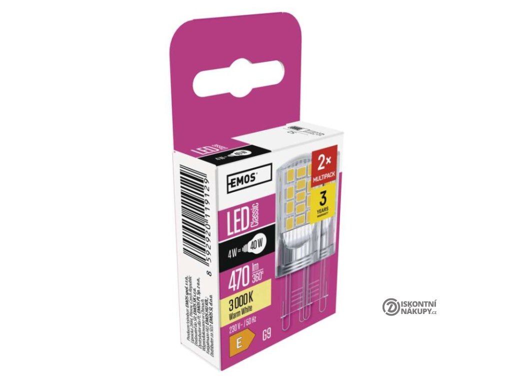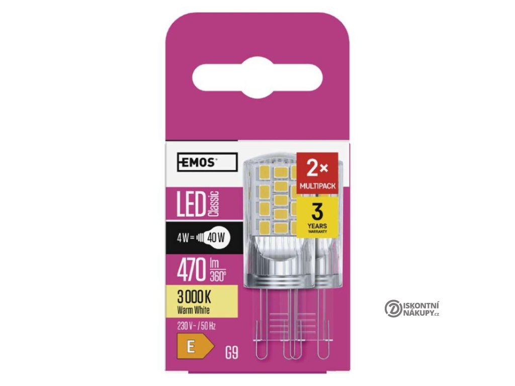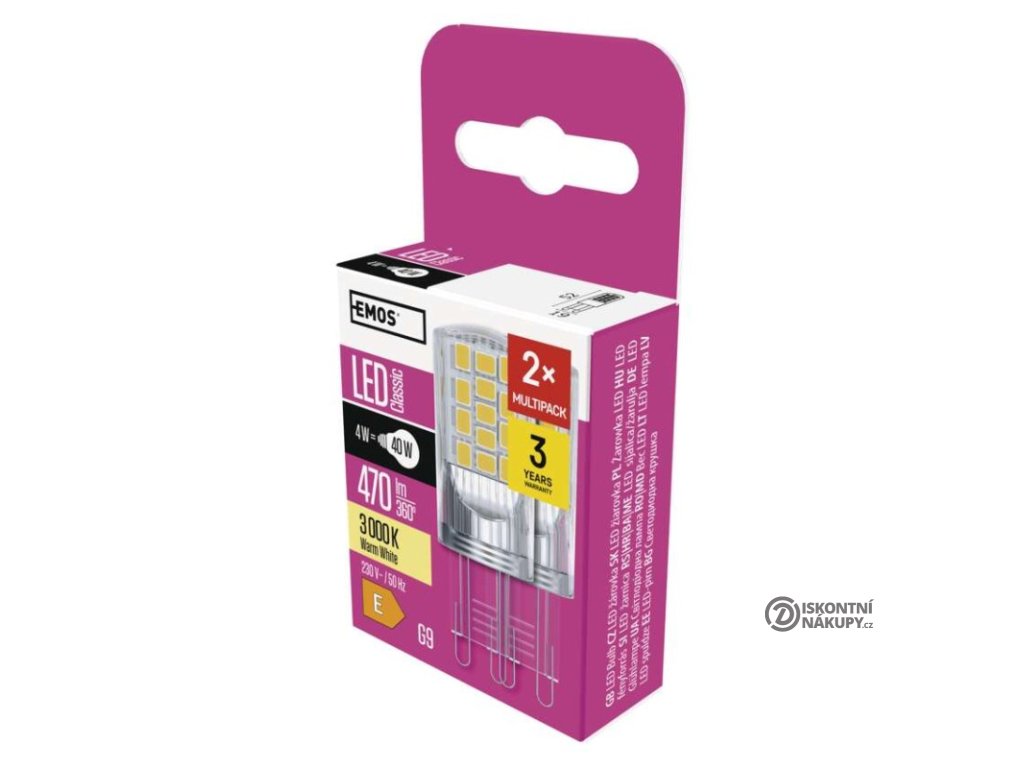 barva světla: teplá bílá|energetická třída: E|index podání barev (CRI): 80|kompatibilita: –|náhrada za žárovku: 40 W|napětí: 230 V~/50 Hz|notifikace do mobilní aplikace: –|ovládání hlasovými asistenty: –|patice (uchycení žárovky): G9|počet čipů: 34|počet spínacích cyklů: 25 000|podporované OS: –|přenosová frekvence: –|příkon: 4 W|prodejní obal: 2 ks, krabička|protokol: –|řada: CLASSIC|rozměr: 52 × 19 × 19 mm|stmívatelná: ne|světelná účinnost: 118 lm/W|světelný tok: 470 lm|technologie: LED|teplota chromatičnosti: 3 000 K|tvar: JC|typ čipů: SMD|účiník: 0,47|úhel vyzařování: 320°|záruční doba: 3 roky|životnost: 30 000 hodinDoplňkové parametry