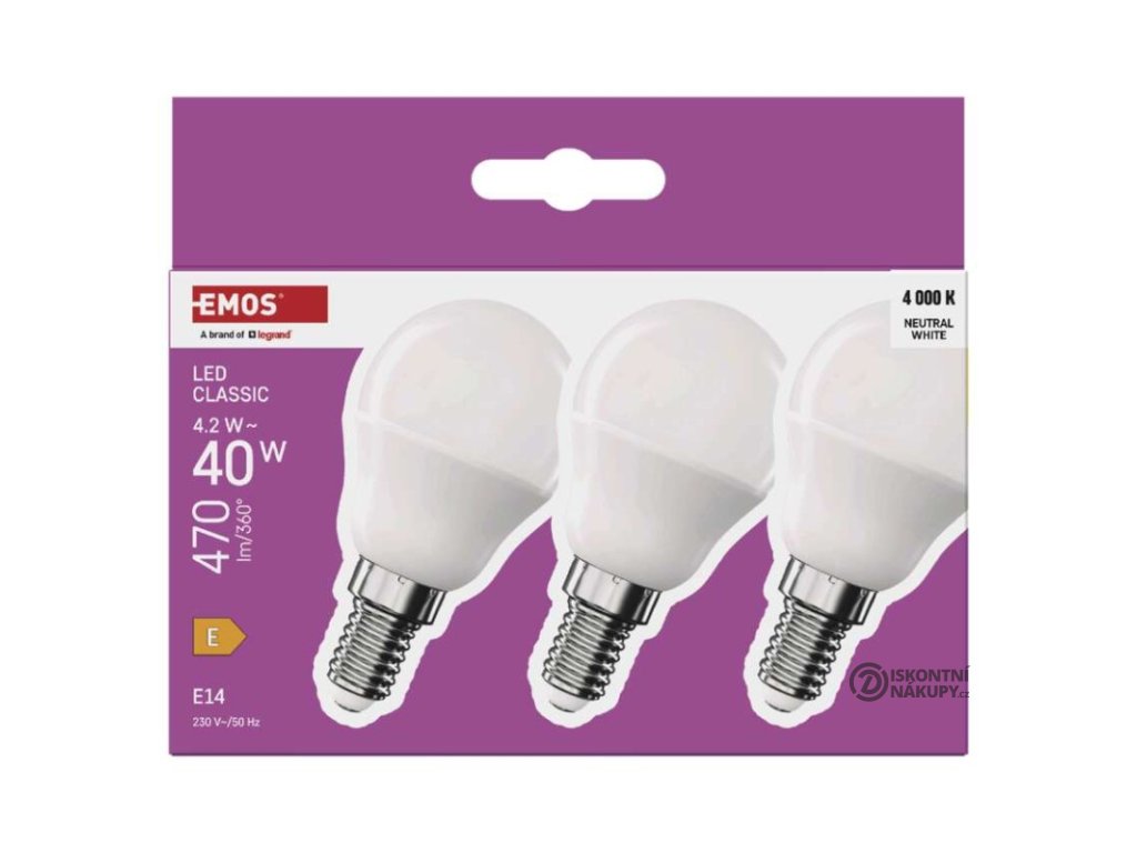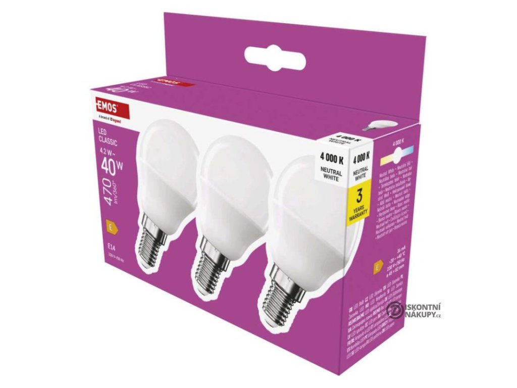 barva světla: neutrální bílá|energetická třída: E|index podání barev (CRI): 80|kompatibilita: –|náhrada za žárovku: 40 W|napětí: 230 V~/50 Hz|notifikace do mobilní aplikace: ne|ovládání hlasovými asistenty: ne|patice (uchycení žárovky): E14|počet čipů: neuvádí se|počet spínacích cyklů: 30 000|podporované OS: –|přenosová frekvence: –|příkon: 4,2 W|prodejní obal: 3 ks, krabička|protokol: –|řada: CLASSIC|rozměr: 45 × 45 × 82 mm|stmívatelná: ne|světelná účinnost: 112 lm/W|světelný tok: 470 lm|technologie: LED|teplota chromatičnosti: 4 000 K|tvar: Mini Globe|typ čipů: SMD|účiník: 0,50|úhel vyzařování: 150°|záruční doba: 3 roky|životnost: 30 000 hodinDoplňkové parametry
