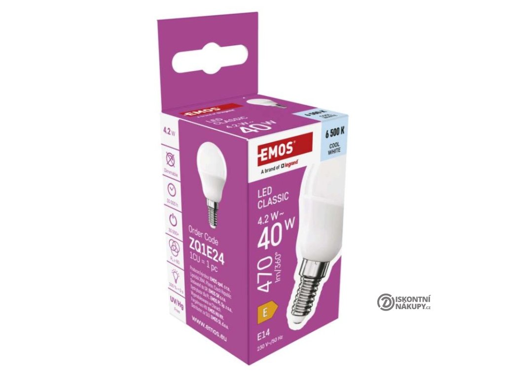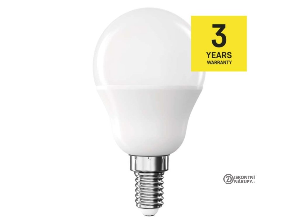 barva světla: studená bílá|energetická třída: E|index podání barev (CRI): 80|kompatibilita: –|náhrada za žárovku: 40 W|napětí: 230 V~/50 Hz|notifikace do mobilní aplikace: ne|ovládání hlasovými asistenty: ne|patice (uchycení žárovky): E14|počet čipů: neuvádí se|počet spínacích cyklů: 30 000|podporované OS: –|přenosová frekvence: –|příkon: 4,2 W|prodejní obal: 1 ks, krabička|protokol: –|řada: CLASSIC|rozměr: 45 × 45 × 82 mm|stmívatelná: ne|světelná účinnost: 112 lm/W|světelný tok: 470 lm|technologie: LED|teplota chromatičnosti: 6 500 K|tvar: Mini Globe|typ čipů: SMD|účiník: 0,50|úhel vyzařování: 150°|záruční doba: 3 roky|životnost: 30 000 hodinDoplňkové parametry
