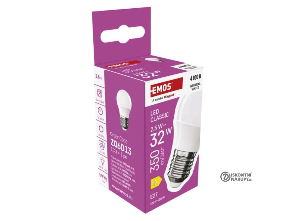 barva světla: neutrální bílá|energetická třída: D|index podání barev (CRI): 80|kompatibilita: –|náhrada za žárovku: 32 W|napětí: 230 V~/50 Hz|notifikace do mobilní aplikace: ne|ovládání hlasovými asistenty: ne|patice (uchycení žárovky): E27|počet čipů: neuvádí se|počet spínacích cyklů: 30 000|podporované OS: –|přenosová frekvence: –|příkon: 2,5 W|prodejní obal: 1 ks, krabička|protokol: –|řada: CLASSIC|rozměr: 45 × 45 × 77 mm|stmívatelná: ne|světelná účinnost: 140 lm/W|světelný tok: 350 lm|technologie: LED|teplota chromatičnosti: 4 000 K|tvar: Mini Globe|typ čipů: SMD|účiník: 0,50|úhel vyzařování: 150°|záruční doba: 3 roky|životnost: 30 000 hodinDoplňkové parametry