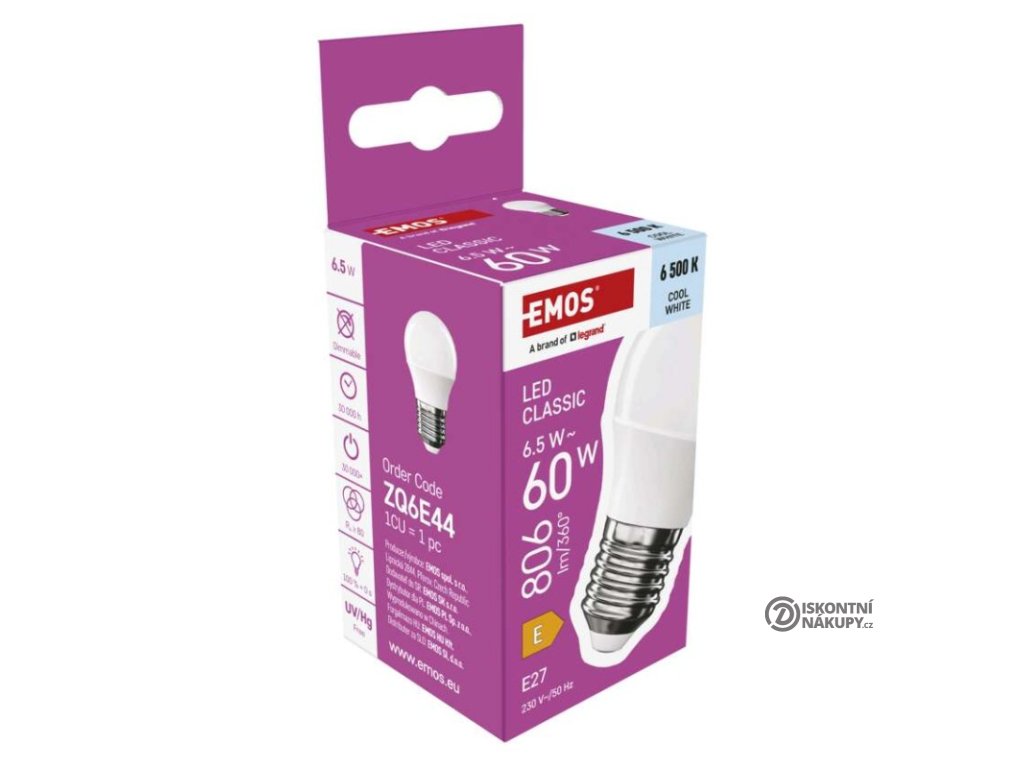 barva světla: studená bílá|energetická třída: E|index podání barev (CRI): 80|kompatibilita: –|náhrada za žárovku: 60 W|napětí: 230 V~/50 Hz|notifikace do mobilní aplikace: ne|ovládání hlasovými asistenty: ne|patice (uchycení žárovky): E27|počet čipů: neuvádí se|počet spínacích cyklů: 30 000|podporované OS: –|přenosová frekvence: –|příkon: 6,5 W|prodejní obal: 1 ks, krabička|protokol: –|řada: CLASSIC|rozměr: 45 × 45 × 77 mm|stmívatelná: ne|světelná účinnost: 124 lm/W|světelný tok: 806 lm|technologie: LED|teplota chromatičnosti: 6 500 K|tvar: Mini Globe|typ čipů: SMD|účiník: 0,50|úhel vyzařování: 150°|záruční doba: 3 roky|životnost: 30 000 hodinDoplňkové parametry