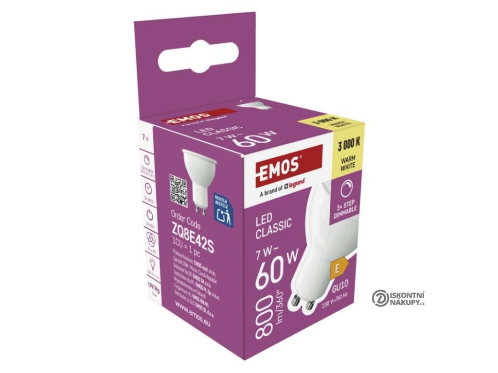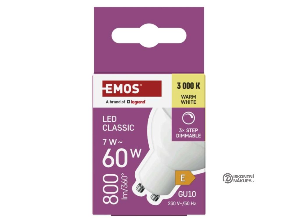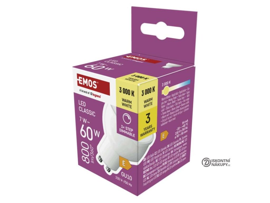 barva světla: teplá bílá|energetická třída: E|index podání barev (CRI): 80|kompatibilita: neuvádí se|náhrada za žárovku: 60 W|napětí: 230 V~/50 Hz|notifikace do mobilní aplikace: neuvádí se|ovládání hlasovými asistenty: neuvádí se|patice (uchycení žárovky): GU10|počet čipů: neuvádí se|počet spínacích cyklů: 25 000|podporované OS: neuvádí se|přenosová frekvence: neuvádí se|příkon: 7 W|prodejní obal: 1 ks, krabička|protokol: neuvádí se|řada: CLASSIC|rozměr: 50 × 50 × 58 mm|stmívatelná: ano|světelná účinnost: 114 lm/W|světelný tok: 800 lm|technologie: LED|teplota chromatičnosti: 3 000 K|tvar: MR16|typ čipů: SMD|účiník: 0,58|úhel vyzařování: 100°|záruční doba: 3 roky|životnost: 25 000 hodinDoplňkové parametry