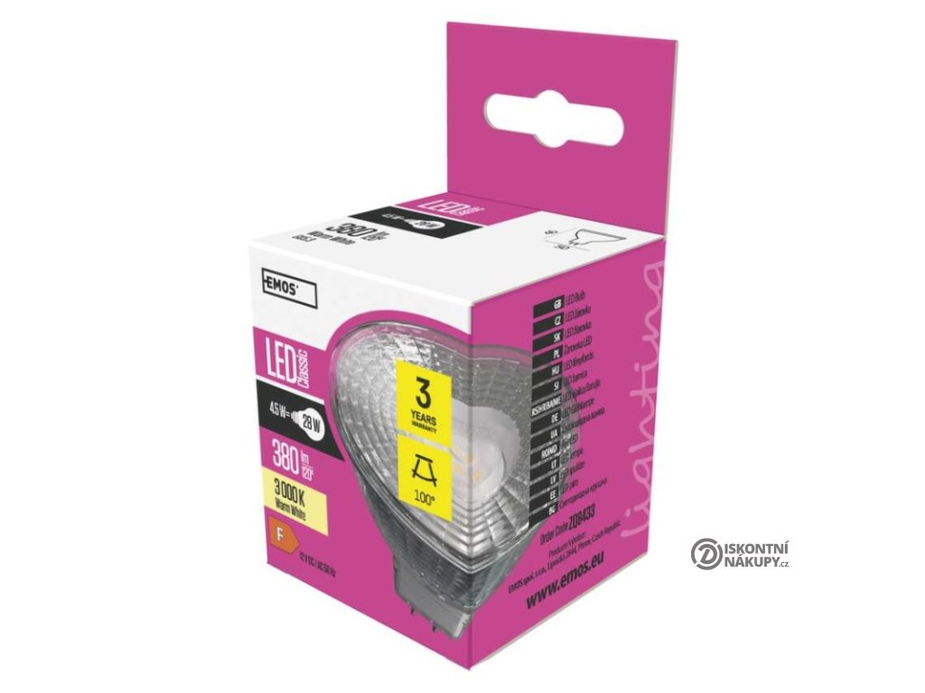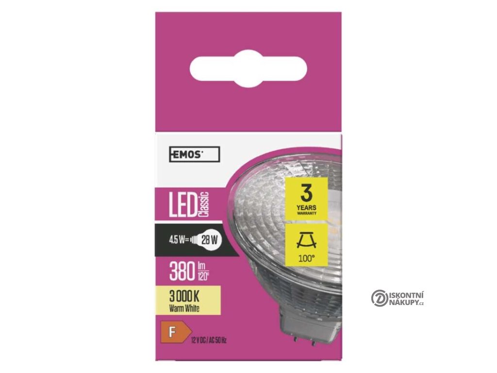 barva světla: teplá bílá|energetická třída: F|index podání barev (CRI): 80|kompatibilita: –|náhrada za žárovku: 28 W|napětí: 12 V|notifikace do mobilní aplikace: –|ovládání hlasovými asistenty: –|patice (uchycení žárovky): GU5,3|počet čipů: neuvádí se|počet spínacích cyklů: 25 000|podporované OS: –|přenosová frekvence: –|příkon: 4,5 W|prodejní obal: 1 ks, krabička|protokol: –|řada: CLASSIC|rozměr: 46 × 50 × 50 mm|stmívatelná: ne|světelná účinnost: 99 lm/W|světelný tok: 380 lm|technologie: LED|teplota chromatičnosti: 3 000 K|tvar: MR16|typ čipů: SMD|účiník: 0,72|úhel vyzařování: 100°|záruční doba: 3 roky|životnost: 30 000 hodinPopis produktu