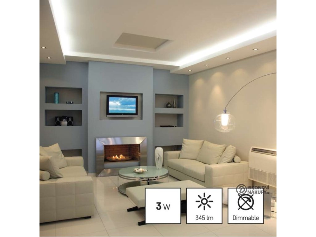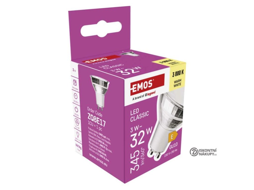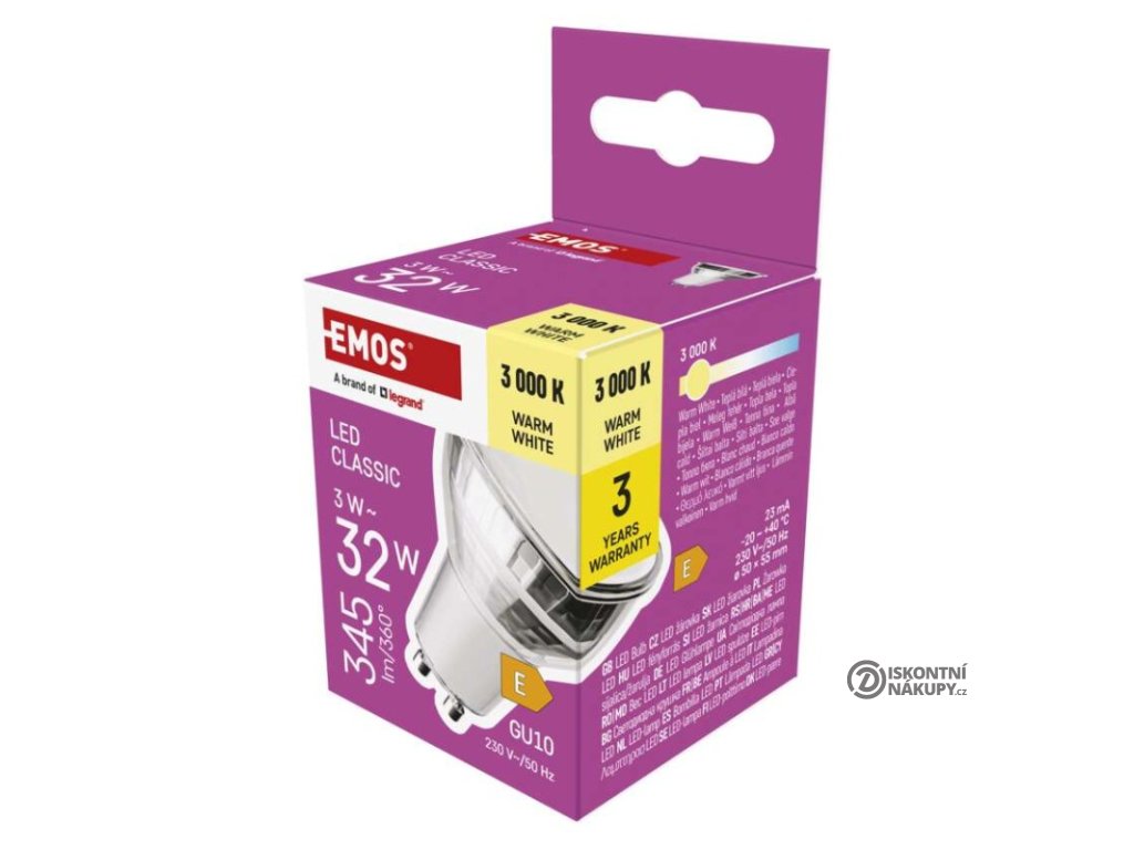 barva světla: teplá bílá|energetická třída: E|index podání barev (CRI): 80|kompatibilita: –|náhrada za žárovku: 32 W|napětí: 230 V~/50 Hz|notifikace do mobilní aplikace: ne|ovládání hlasovými asistenty: ne|patice (uchycení žárovky): GU10|počet čipů: neuvádí se|počet spínacích cyklů: 30 000|podporované OS: –|přenosová frekvence: –|příkon: 3 W|prodejní obal: 1 ks, krabička|protokol: –|řada: CLASSIC|rozměr: 50 × 50 × 55 mm|stmívatelná: ne|světelná účinnost: 115 lm/W|světelný tok: 345 lm|technologie: LED|teplota chromatičnosti: 3 000 K|tvar: MR16|typ čipů: SMD|účiník: 0,40|úhel vyzařování: 100°|záruční doba: 3 roky|životnost: 30 000 hodinDoplňkové parametry