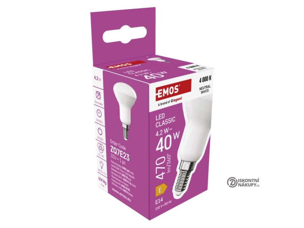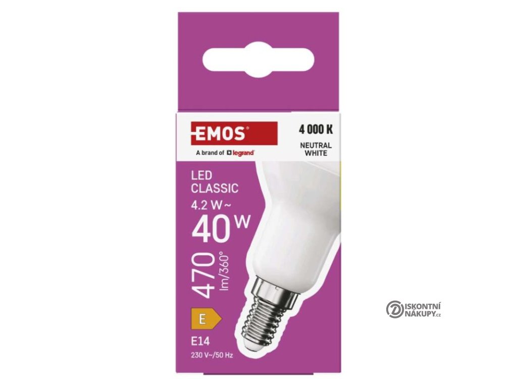 barva světla: neutrální bílá|energetická třída: E|index podání barev (CRI): 80|kompatibilita: –|náhrada za žárovku: 40 W|napětí: 230 V~/50 Hz|notifikace do mobilní aplikace: ne|ovládání hlasovými asistenty: ne|patice (uchycení žárovky): E14|počet čipů: neuvádí se|počet spínacích cyklů: 30 000|podporované OS: –|přenosová frekvence: –|příkon: 4,2 W|prodejní obal: 1 ks, krabička|protokol: –|řada: CLASSIC|rozměr: 50 × 50 × 83 mm|stmívatelná: ne|světelná účinnost: 112 lm/W|světelný tok: 470 lm|technologie: LED|teplota chromatičnosti: 4 000 K|tvar: R50|typ čipů: SMD|účiník: 0,50|úhel vyzařování: 120°|záruční doba: 3 roky|životnost: 30 000 hodinDoplňkové parametry