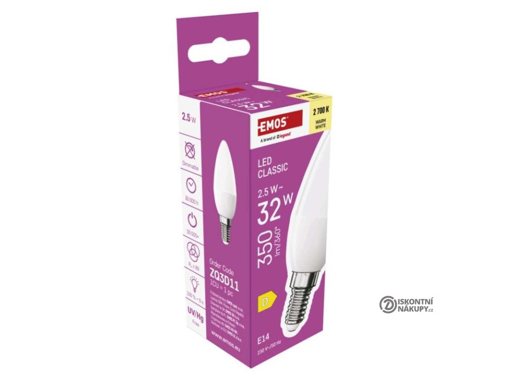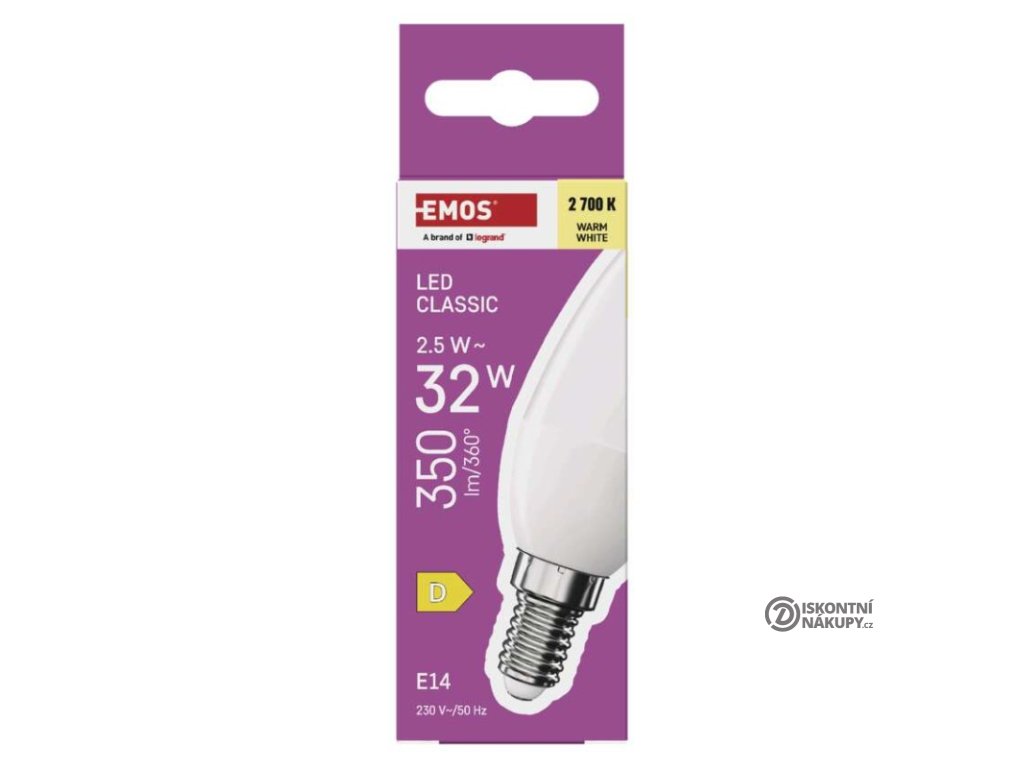 barva světla: teplá bílá|energetická třída: D|index podání barev (CRI): 80|kompatibilita: –|náhrada za žárovku: 32 W|napětí: 230 V~/50 Hz|notifikace do mobilní aplikace: ne|ovládání hlasovými asistenty: ne|patice (uchycení žárovky): E14|počet čipů: neuvádí se|počet spínacích cyklů: 30 000|podporované OS: –|přenosová frekvence: –|příkon: 2,5 W|prodejní obal: 1 ks, krabička|protokol: –|řada: CLASSIC|rozměr: 35 × 35 × 103 mm|stmívatelná: ne|světelná účinnost: 140 lm/W|světelný tok: 350 lm|technologie: LED|teplota chromatičnosti: 2 700 K|tvar: svíčka|typ čipů: SMD|účiník: 0,50|úhel vyzařování: 240°|záruční doba: 3 roky|životnost: 30 000 hodinDoplňkové parametry