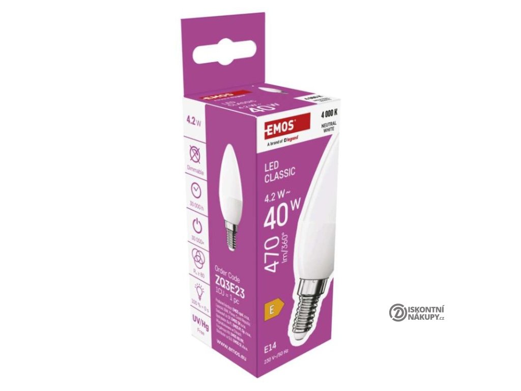 barva světla: neutrální bílá|energetická třída: E|index podání barev (CRI): 80|kompatibilita: –|náhrada za žárovku: 40 W|napětí: 230 V~/50 Hz|notifikace do mobilní aplikace: ne|ovládání hlasovými asistenty: ne|patice (uchycení žárovky): E14|počet čipů: neuvádí se|počet spínacích cyklů: 30 000|podporované OS: –|přenosová frekvence: –|příkon: 4,2 W|prodejní obal: 1 ks, krabička|protokol: –|řada: CLASSIC|rozměr: 35 × 35 × 103 mm|stmívatelná: ne|světelná účinnost: 112 lm/W|světelný tok: 470 lm|technologie: LED|teplota chromatičnosti: 4 000 K|tvar: svíčka|typ čipů: SMD|účiník: 0,50|úhel vyzařování: 240°|záruční doba: 3 roky|životnost: 30 000 hodinDoplňkové parametry