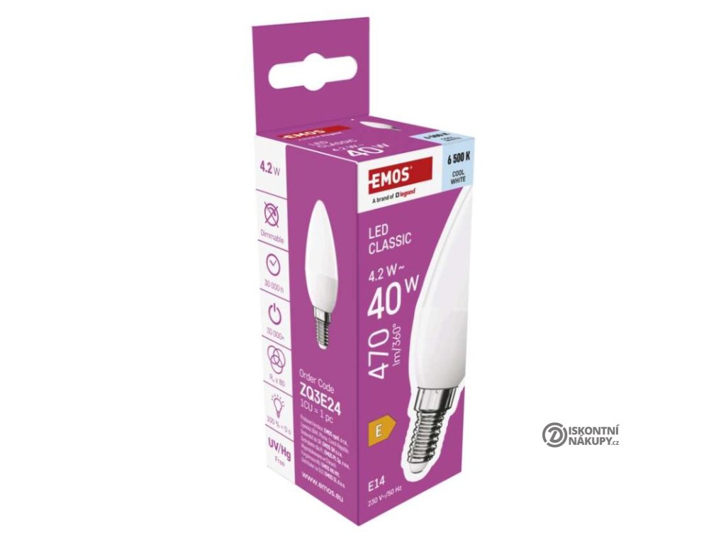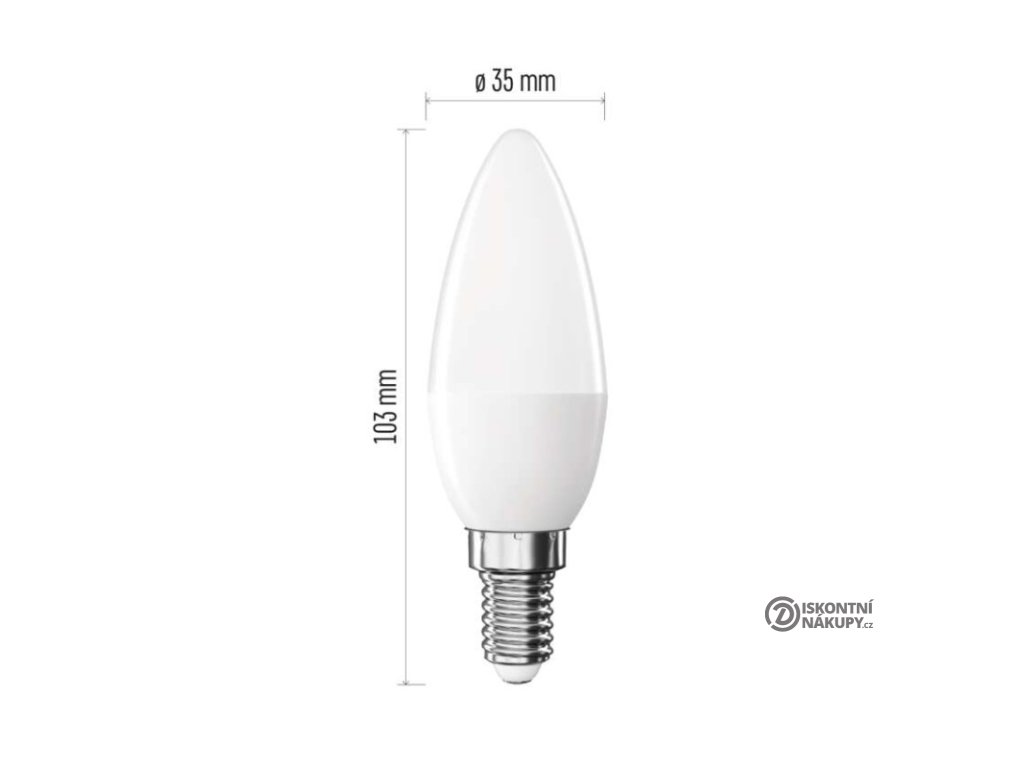 barva světla: studená bílá|energetická třída: E|index podání barev (CRI): 80|kompatibilita: –|náhrada za žárovku: 40 W|napětí: 230 V~/50 Hz|notifikace do mobilní aplikace: ne|ovládání hlasovými asistenty: ne|patice (uchycení žárovky): E14|počet čipů: neuvádí se|počet spínacích cyklů: 30 000|podporované OS: –|přenosová frekvence: –|příkon: 4,2 W|prodejní obal: 1 ks, krabička|protokol: –|řada: CLASSIC|rozměr: 35 × 35 × 103 mm|stmívatelná: ne|světelná účinnost: 112 lm/W|světelný tok: 470 lm|technologie: LED|teplota chromatičnosti: 6 500 K|tvar: svíčka|typ čipů: SMD|účiník: 0,50|úhel vyzařování: 240°|záruční doba: 3 roky|životnost: 30 000 hodinDoplňkové parametry