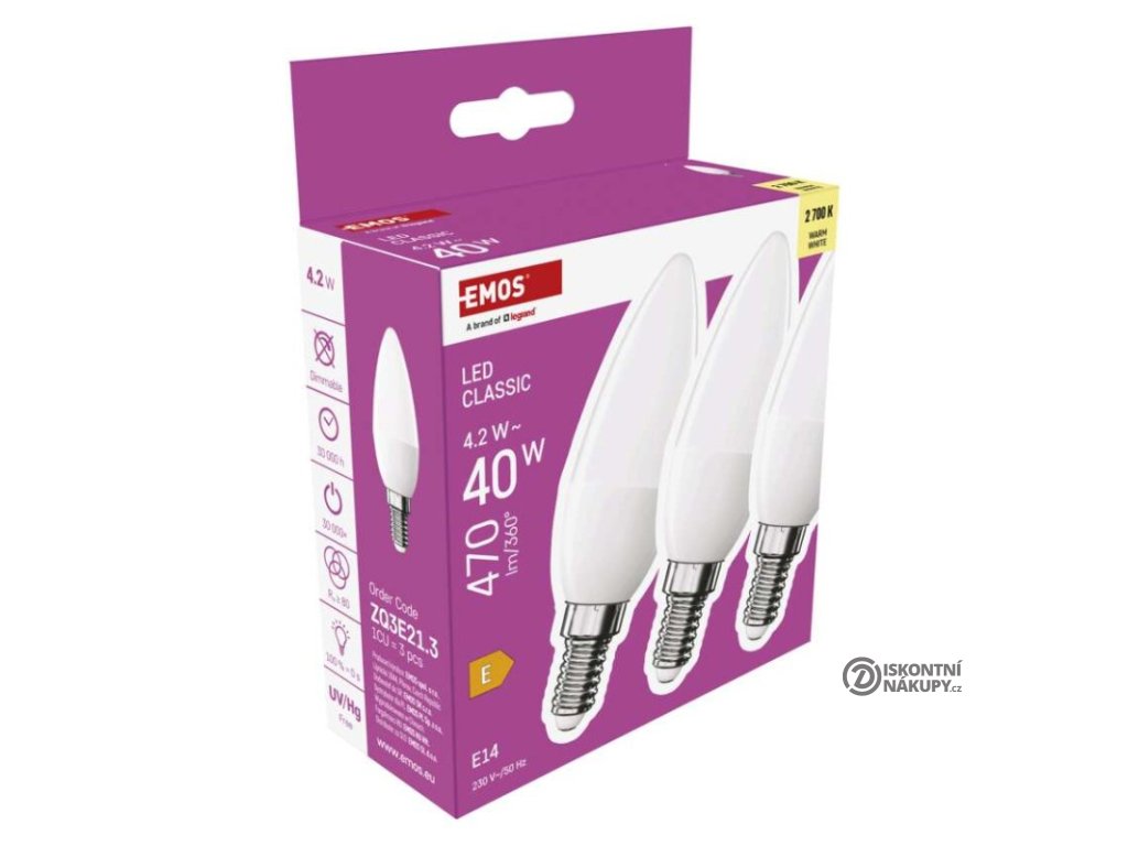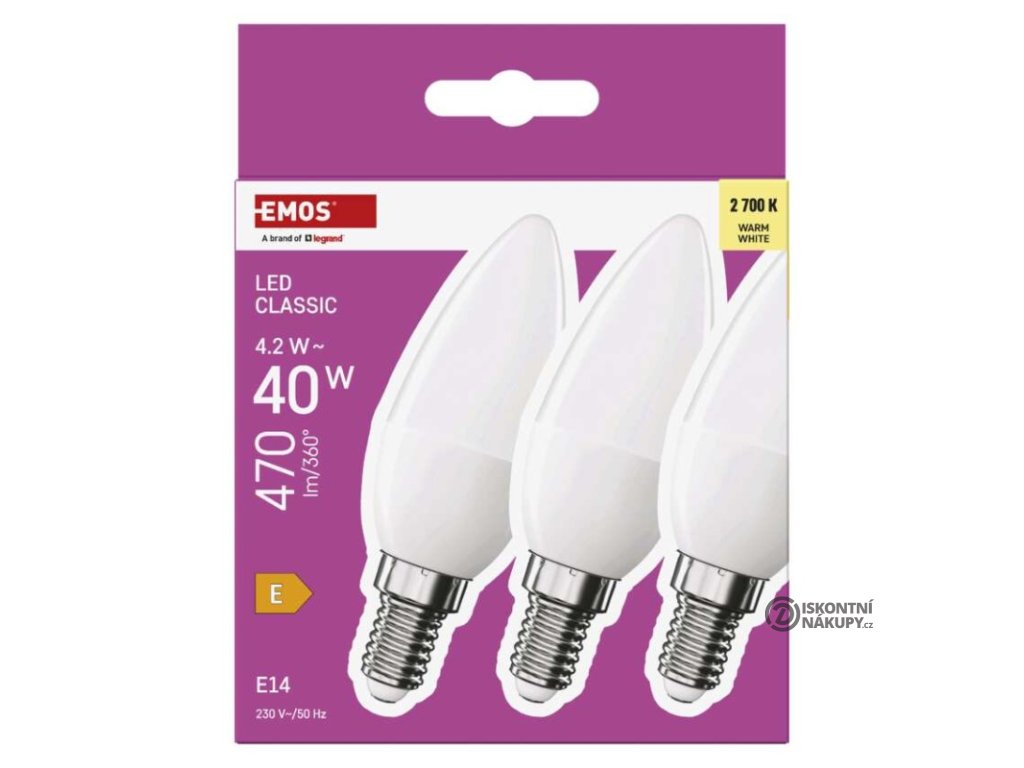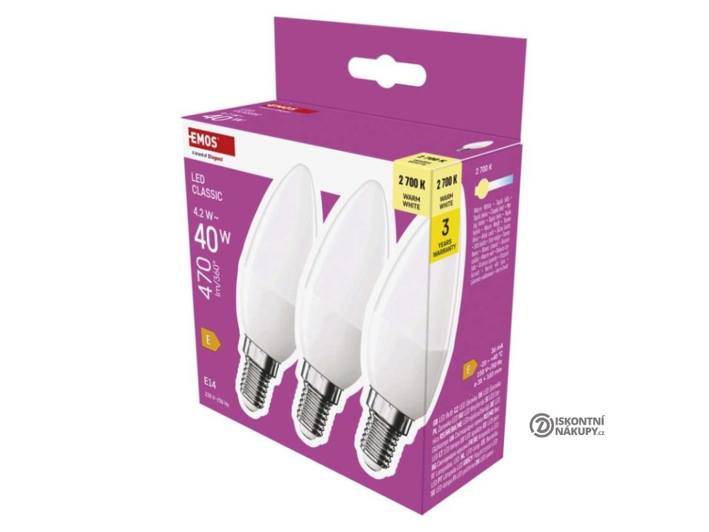 barva světla: teplá bílá|energetická třída: E|index podání barev (CRI): 80|kompatibilita: –|náhrada za žárovku: 40 W|napětí: 230 V~/50 Hz|notifikace do mobilní aplikace: ne|ovládání hlasovými asistenty: ne|patice (uchycení žárovky): E14|počet čipů: neuvádí se|počet spínacích cyklů: 30 000|podporované OS: –|přenosová frekvence: –|příkon: 4,2 W|prodejní obal: 3 ks, krabička|protokol: –|řada: CLASSIC|rozměr: 35 × 35 × 103 mm|stmívatelná: ne|světelná účinnost: 112 lm/W|světelný tok: 470 lm|technologie: LED|teplota chromatičnosti: 2 700 K|tvar: svíčka|typ čipů: SMD|účiník: 0,50|úhel vyzařování: 240°|záruční doba: 3 roky|životnost: 30 000 hodinDoplňkové parametry