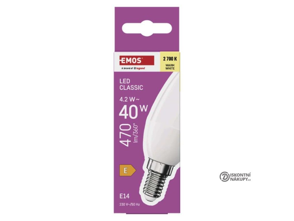 barva světla: teplá bílá|energetická třída: E|index podání barev (CRI): 80|kompatibilita: –|náhrada za žárovku: 40 W|napětí: 230 V~/50 Hz|notifikace do mobilní aplikace: ne|ovládání hlasovými asistenty: ne|patice (uchycení žárovky): E14|počet čipů: neuvádí se|počet spínacích cyklů: 30 000|podporované OS: –|přenosová frekvence: –|příkon: 4,2 W|prodejní obal: 1 ks, krabička|protokol: –|řada: CLASSIC|rozměr: 35 × 35 × 103 mm|stmívatelná: ne|světelná účinnost: 112 lm/W|světelný tok: 470 lm|technologie: LED|teplota chromatičnosti: 2 700 K|tvar: svíčka|typ čipů: SMD|účiník: 0,50|úhel vyzařování: 240°|záruční doba: 3 roky|životnost: 30 000 hodinDoplňkové parametry