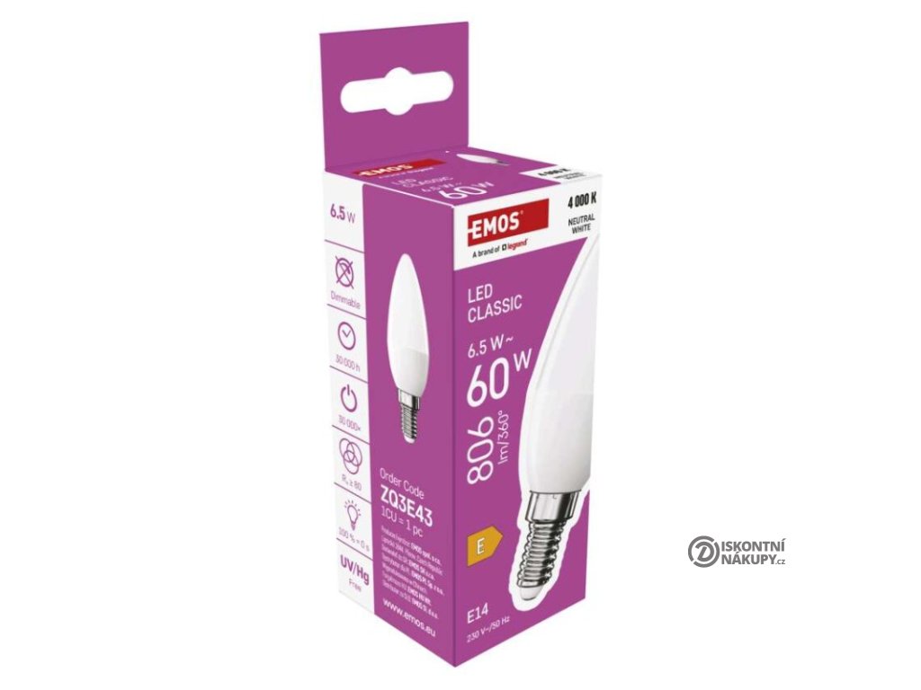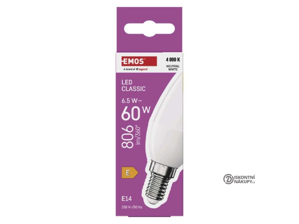 barva světla: neutrální bílá|energetická třída: E|index podání barev (CRI): 80|kompatibilita: –|náhrada za žárovku: 60 W|napětí: 230 V~/50 Hz|notifikace do mobilní aplikace: ne|ovládání hlasovými asistenty: ne|patice (uchycení žárovky): E14|počet čipů: neuvádí se|počet spínacích cyklů: 30 000|podporované OS: –|přenosová frekvence: –|příkon: 6,5 W|prodejní obal: 1 ks, krabička|protokol: –|řada: CLASSIC|rozměr: 35 × 35 × 103 mm|stmívatelná: ne|světelná účinnost: 124 lm/W|světelný tok: 806 lm|technologie: LED|teplota chromatičnosti: 4 000 K|tvar: svíčka|typ čipů: SMD|účiník: 0,50|úhel vyzařování: 240°|záruční doba: 3 roky|životnost: 30 000 hodinDoplňkové parametry