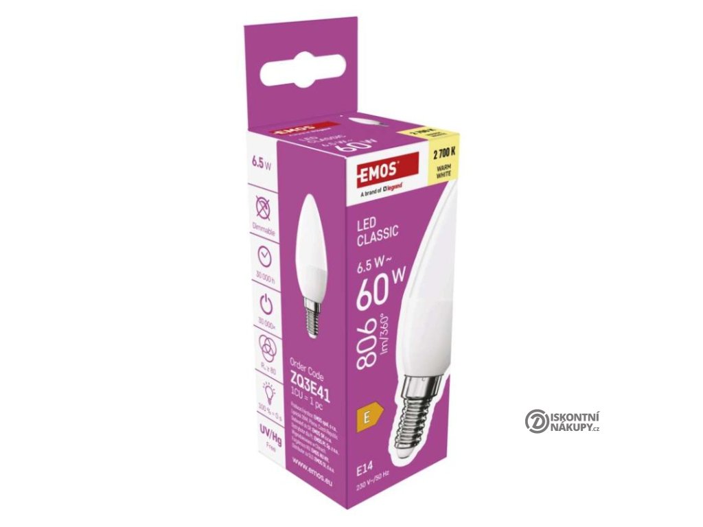 barva světla: teplá bílá|energetická třída: E|index podání barev (CRI): 80|kompatibilita: –|náhrada za žárovku: 60 W|napětí: 230 V~/50 Hz|notifikace do mobilní aplikace: ne|ovládání hlasovými asistenty: ne|patice (uchycení žárovky): E14|počet čipů: neuvádí se|počet spínacích cyklů: 30 000|podporované OS: –|přenosová frekvence: –|příkon: 6,5 W|prodejní obal: 1 ks, krabička|protokol: –|řada: CLASSIC|rozměr: 35 × 35 × 103 mm|stmívatelná: ne|světelná účinnost: 124 lm/W|světelný tok: 806 lm|technologie: LED|teplota chromatičnosti: 2 700 K|tvar: svíčka|typ čipů: SMD|účiník: 0,50|úhel vyzařování: 240°|záruční doba: 3 roky|životnost: 30 000 hodinDoplňkové parametry