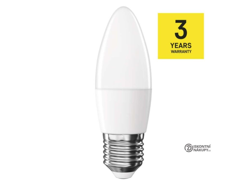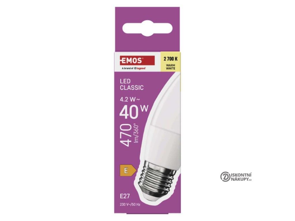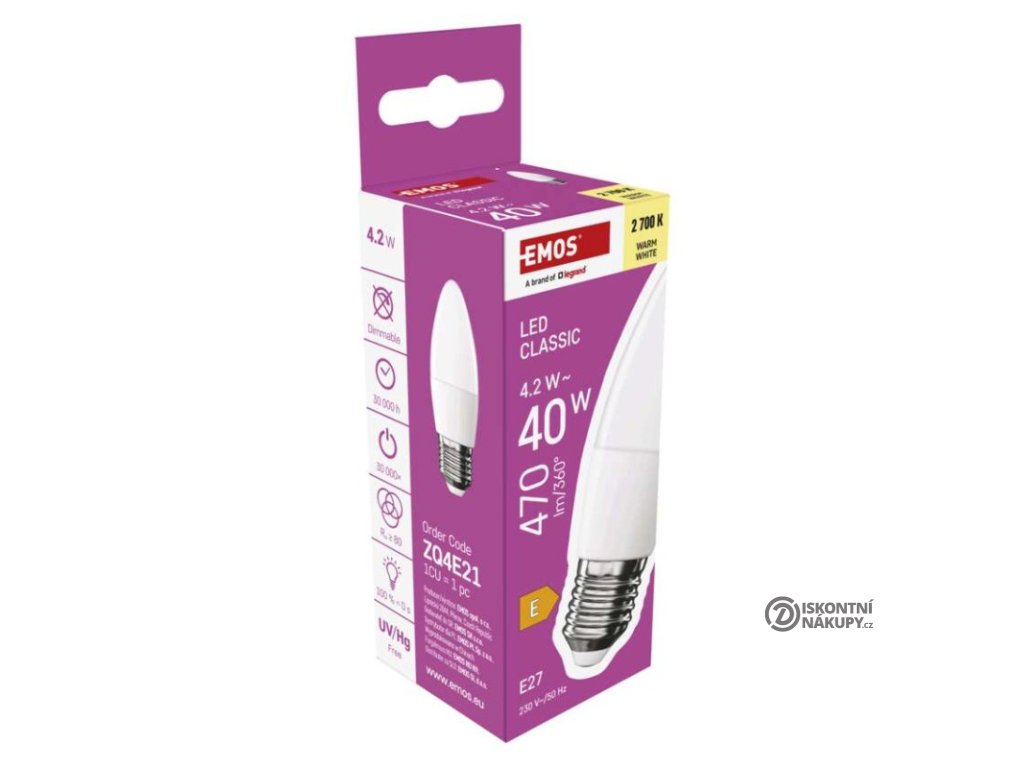 barva světla: teplá bílá|energetická třída: E|index podání barev (CRI): 80|kompatibilita: –|náhrada za žárovku: 40 W|napětí: 230 V~/50 Hz|notifikace do mobilní aplikace: ne|ovládání hlasovými asistenty: ne|patice (uchycení žárovky): E27|počet čipů: neuvádí se|počet spínacích cyklů: 30 000|podporované OS: –|přenosová frekvence: –|příkon: 4,2 W|prodejní obal: 1 ks, krabička|protokol: –|řada: CLASSIC|rozměr: 35 × 35 × 105 mm|stmívatelná: ne|světelná účinnost: 112 lm/W|světelný tok: 470 lm|technologie: LED|teplota chromatičnosti: 2 700 K|tvar: svíčka|typ čipů: SMD|účiník: 0,50|úhel vyzařování: 240°|záruční doba: 3 roky|životnost: 30 000 hodinDoplňkové parametry