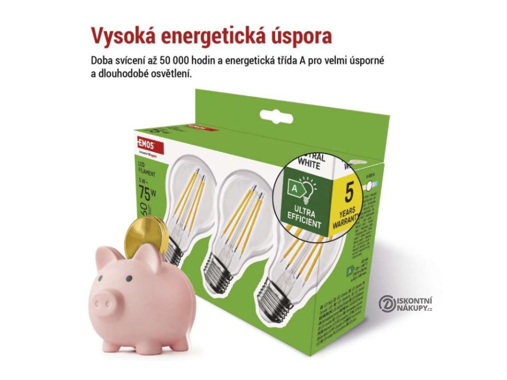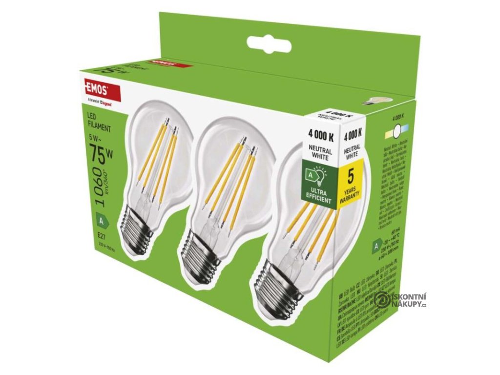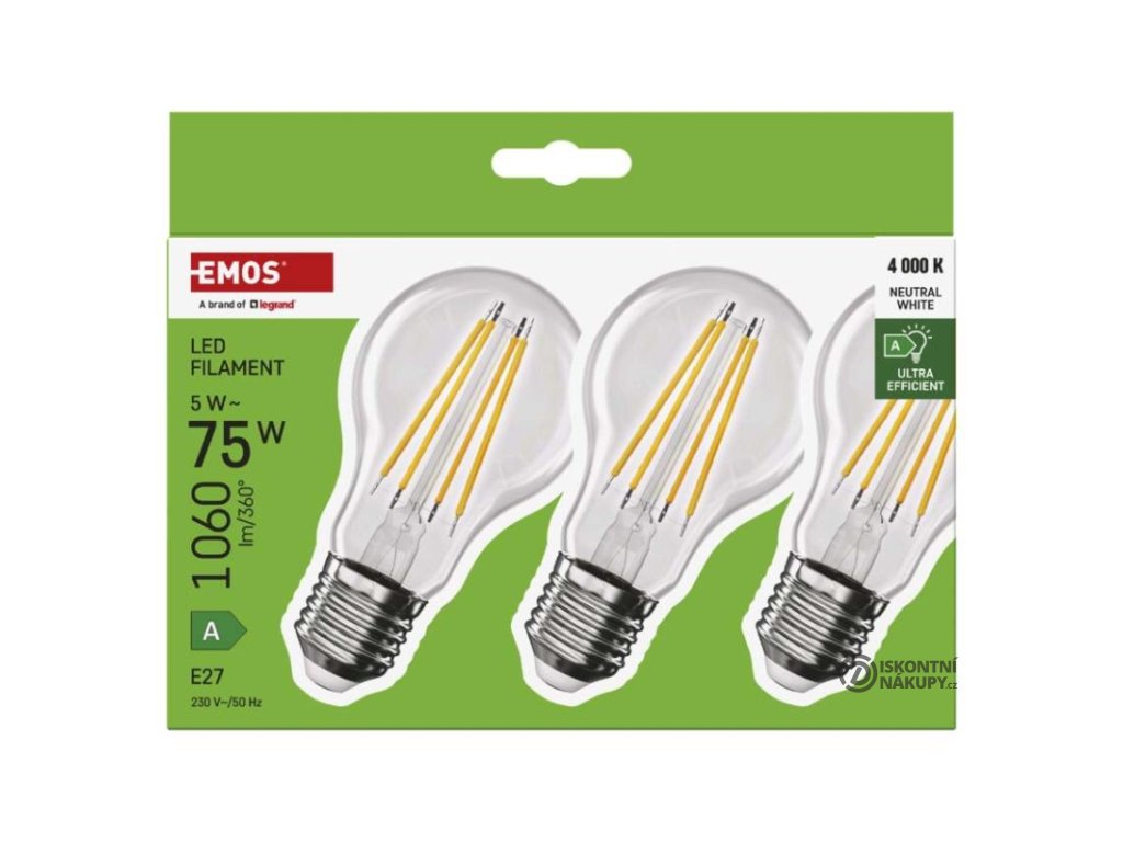 barva světla: neutrální bílá|energetická třída: A|index podání barev (CRI): 80|kompatibilita: –|náhrada za žárovku: 75 W|napětí: 230 V~/50 Hz|notifikace do mobilní aplikace: –|ovládání hlasovými asistenty: –|patice (uchycení žárovky): E27|počet čipů: 4|počet spínacích cyklů: 30 000|podporované OS: –|přenosová frekvence: –|příkon: 5 W|prodejní obal: 3 ks, krabička|protokol: –|řada: FILAMENT|rozměr: 60 × 60 × 108 mm|stmívatelná: ne|světelná účinnost: 212 lm/W|světelný tok: 1 060 lm|technologie: LED|teplota chromatičnosti: 4 000 K|tvar: A60|typ čipů: COB|účiník: 0,5|úhel vyzařování: 360°|záruční doba: 5 let|životnost: 50 000 hodinVýhody produktu