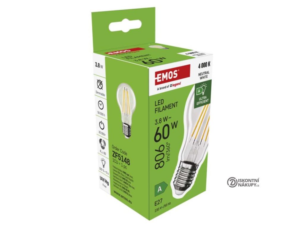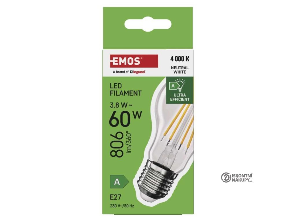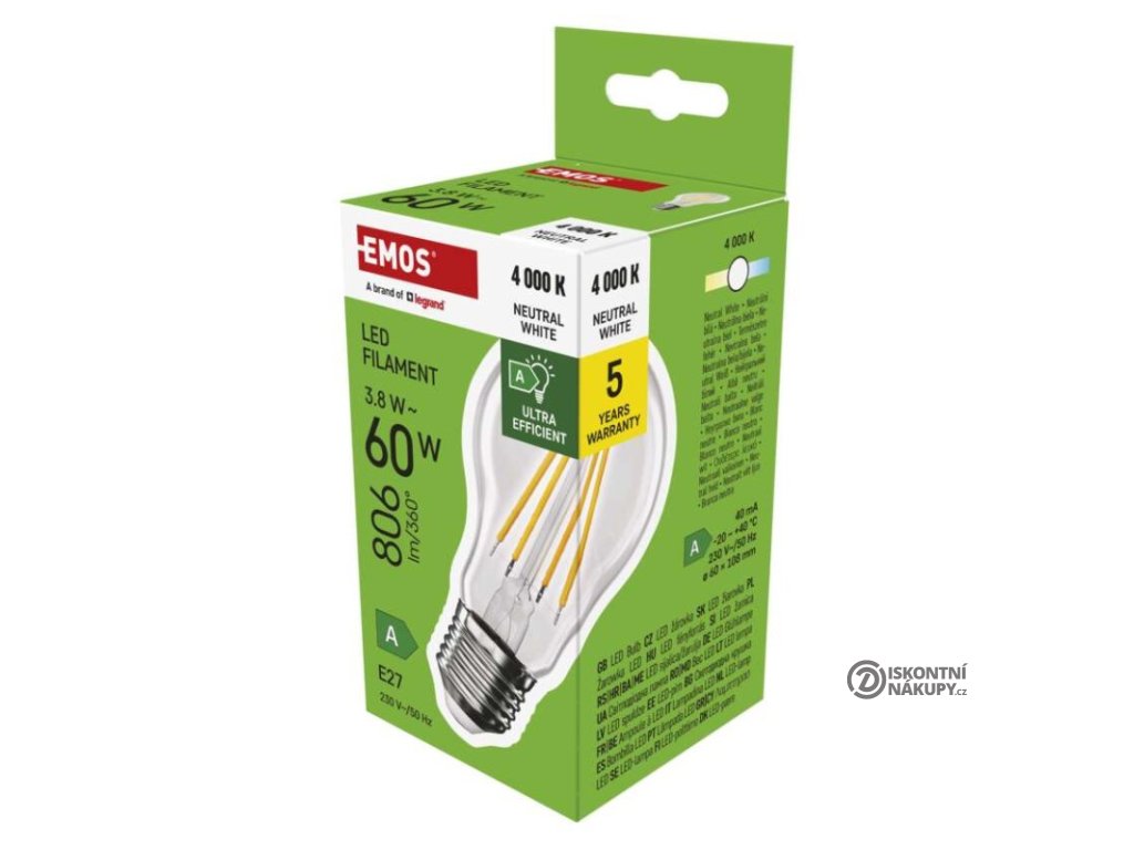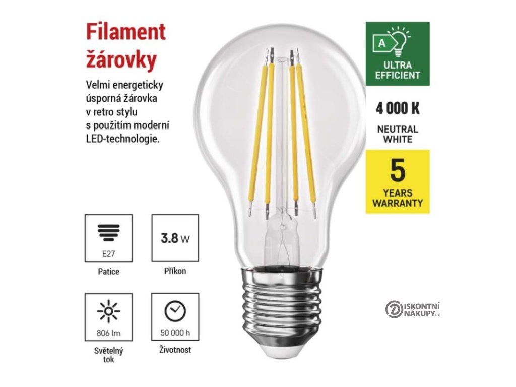 barva světla: neutrální bílá|energetická třída: A|index podání barev (CRI): 80|kompatibilita: –|náhrada za žárovku: 60 W|napětí: 230 V~/50 Hz|notifikace do mobilní aplikace: –|ovládání hlasovými asistenty: –|patice (uchycení žárovky): E27|počet čipů: 4|počet spínacích cyklů: 30 000|podporované OS: –|přenosová frekvence: –|příkon: 3,8 W|prodejní obal: 1 ks, krabička|protokol: –|řada: FILAMENT|rozměr: 60 × 60 × 108 mm|stmívatelná: ne|světelná účinnost: 212 lm/W|světelný tok: 806 lm|technologie: LED|teplota chromatičnosti: 4 000 K|tvar: A60|typ čipů: COB|účiník: 0,5|úhel vyzařování: 360°|záruční doba: 5 let|životnost: 50 000 hodinVýhody produktu