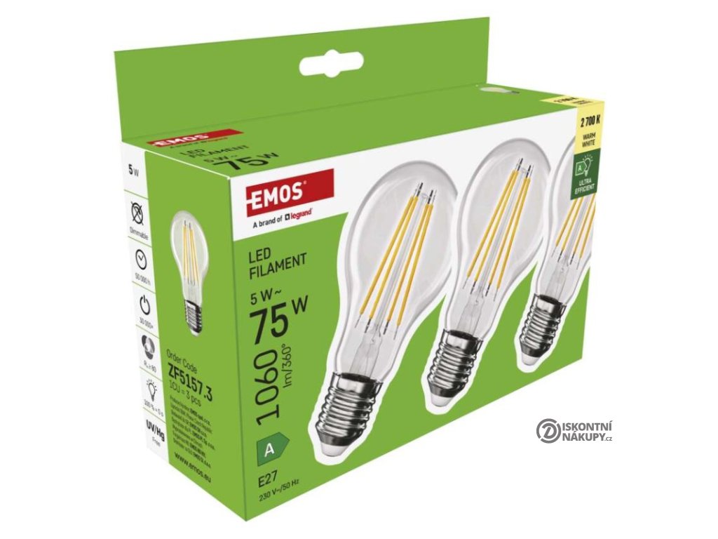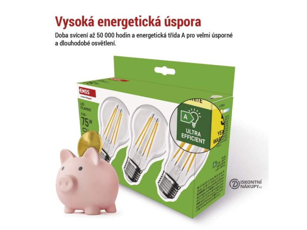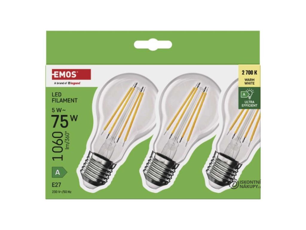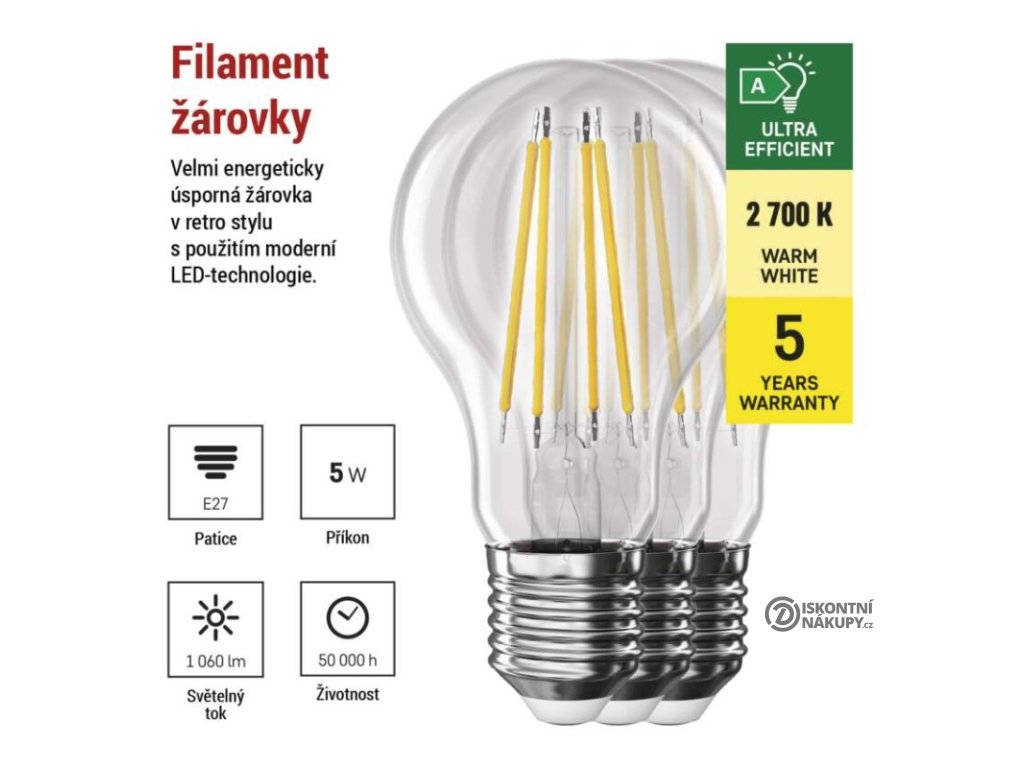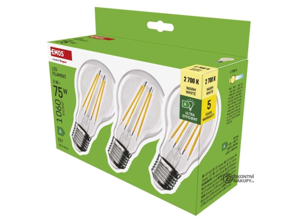barva světla: teplá bílá|energetická třída: A|index podání barev (CRI): 80|kompatibilita: –|náhrada za žárovku: 75 W|napětí: 230 V~/50 Hz|notifikace do mobilní aplikace: –|ovládání hlasovými asistenty: –|patice (uchycení žárovky): E27|počet čipů: 4|počet spínacích cyklů: 30 000|podporované OS: –|přenosová frekvence: –|příkon: 5 W|prodejní obal: 3 ks, krabička|protokol: –|řada: FILAMENT|rozměr: 60 × 60 × 108 mm|stmívatelná: ne|světelná účinnost: 212 lm/W|světelný tok: 1 060 lm|technologie: LED|teplota chromatičnosti: 2 700 K|tvar: A60|typ čipů: COB|účiník: 0,5|úhel vyzařování: 360°|záruční doba: 5 let|životnost: 50 000 hodinVýhody produktu