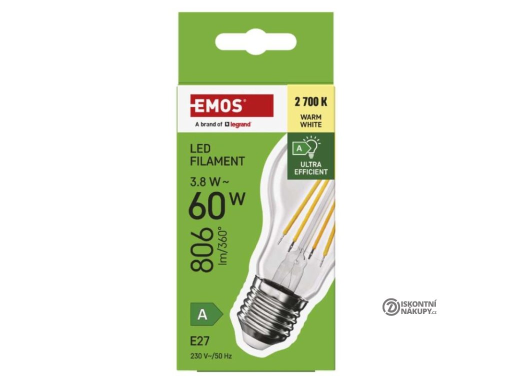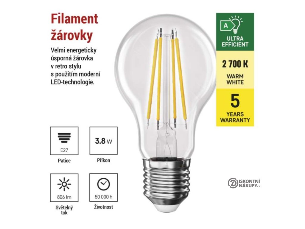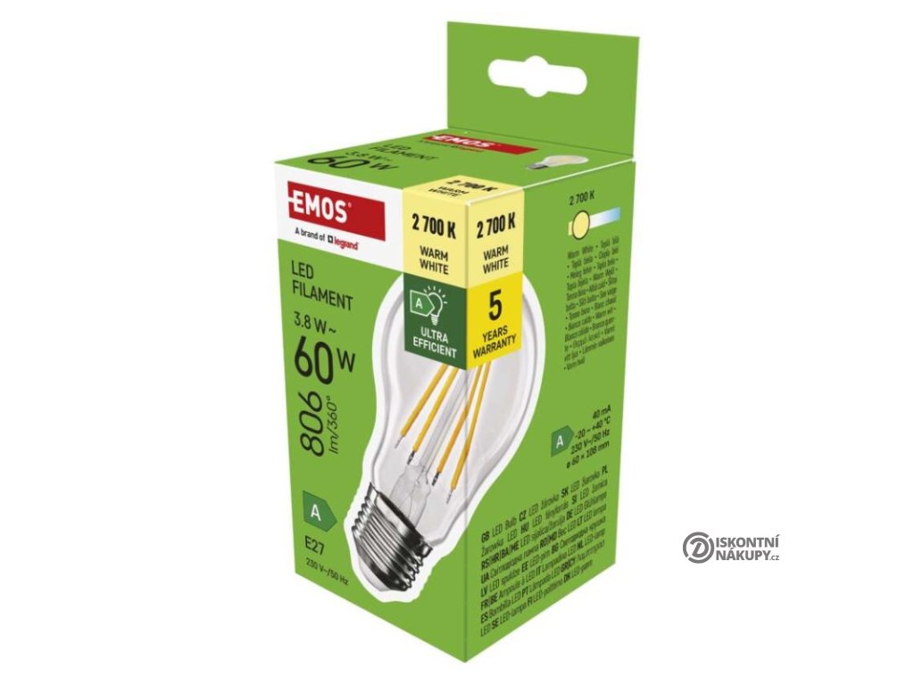 barva světla: teplá bílá|energetická třída: A|index podání barev (CRI): 80|kompatibilita: –|náhrada za žárovku: 60 W|napětí: 230 V~/50 Hz|notifikace do mobilní aplikace: –|ovládání hlasovými asistenty: –|patice (uchycení žárovky): E27|počet čipů: 4|počet spínacích cyklů: 30 000|podporované OS: –|přenosová frekvence: –|příkon: 3,8 W|prodejní obal: 1 ks, krabička|protokol: –|řada: FILAMENT|rozměr: 60 × 60 × 108 mm|stmívatelná: ne|světelná účinnost: 212 lm/W|světelný tok: 806 lm|technologie: LED|teplota chromatičnosti: 2 700 K|tvar: A60|typ čipů: COB|účiník: 0,5|úhel vyzařování: 360°|záruční doba: 5 let|životnost: 50 000 hodinVýhody produktu