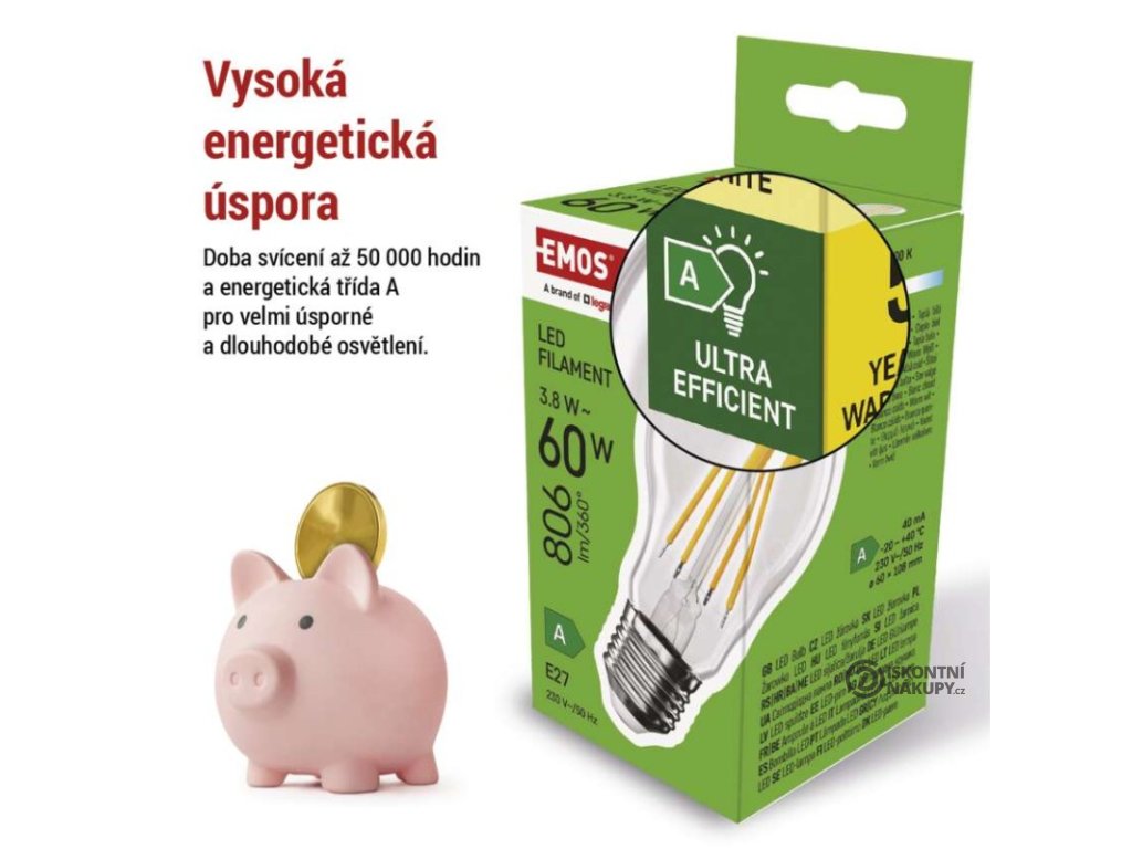 Ultra Efficient; Energetická třída A – úspora energie/peněz; Nová technologie kvalitnějších LED čipů; Záruka 5 let – jako první v sortimentu; Dlouhá životnost 50 000 h – vydrží až 2násobně oproti běžným filamentovým žárovkám; Úspora až 40 %.