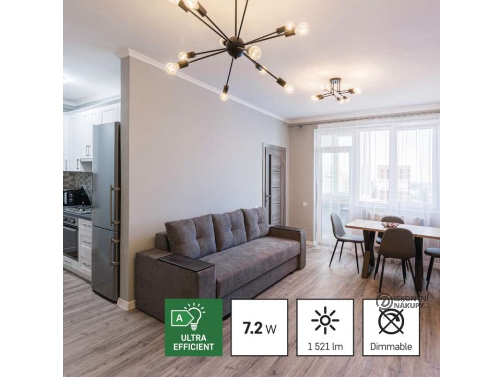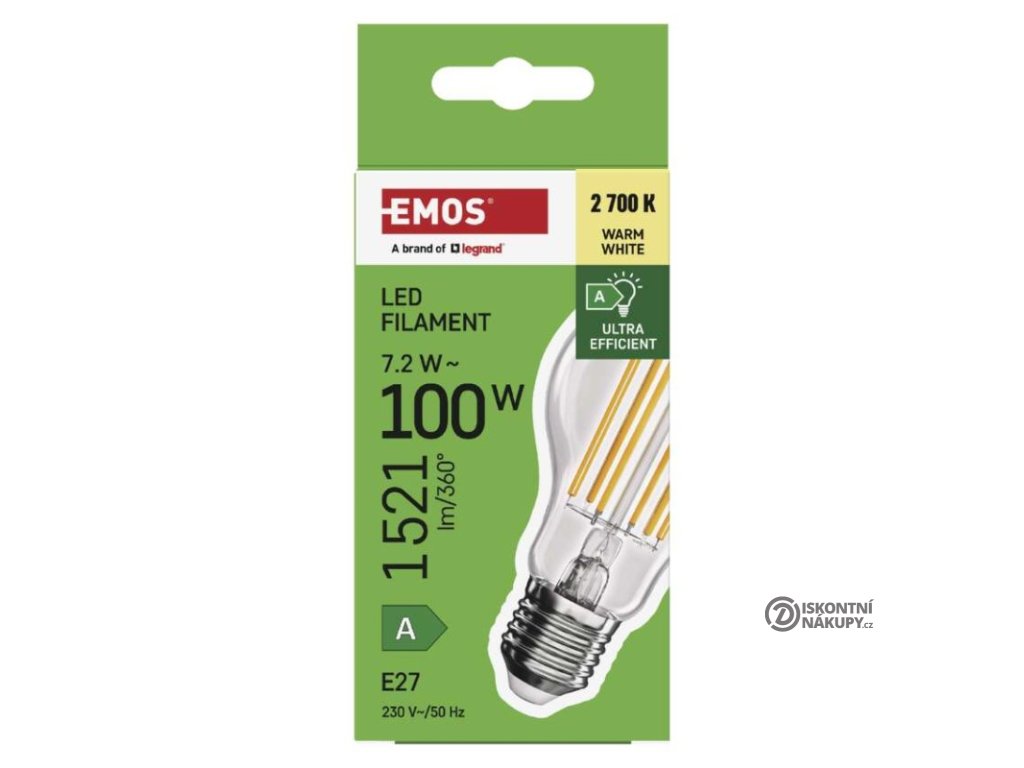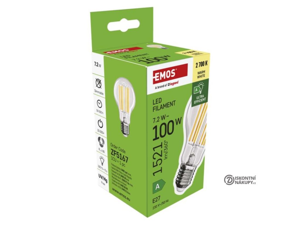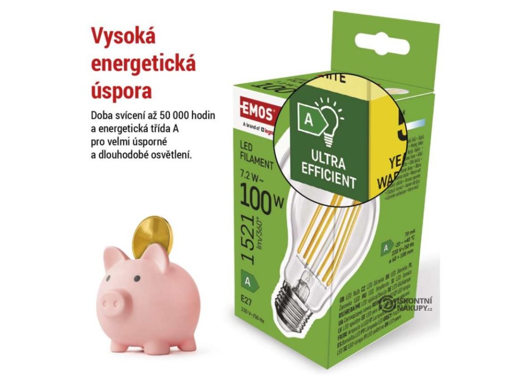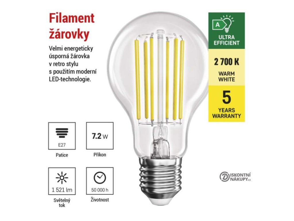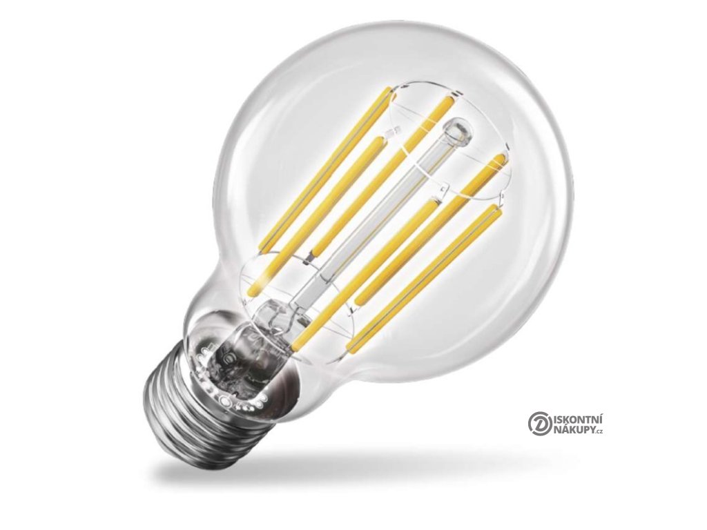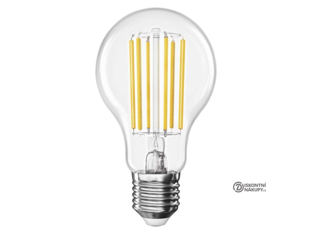 barva světla: teplá bílá|energetická třída: A|index podání barev (CRI): 80|kompatibilita: neuvádí se|náhrada za žárovku: 100 W|napětí: 230 V~/50 Hz|notifikace do mobilní aplikace: neuvádí se|ovládání hlasovými asistenty: neuvádí se|patice (uchycení žárovky): E27|počet čipů: neuvádí se|počet spínacích cyklů: 30 000|podporované OS: neuvádí se|přenosová frekvence: neuvádí se|příkon: 7,2 W|prodejní obal: 1 ks, krabička|protokol: neuvádí se|řada: FILAMENT|rozměr: 60 × 60 × 108 mm|stmívatelná: ne|světelná účinnost: 211 lm/W|světelný tok: 1 521 lm|technologie: LED|teplota chromatičnosti: 2 700 K|tvar: A60|typ čipů: COB|účiník: 0,58|úhel vyzařování: 360°|záruční doba: 5 let|životnost: 50 000 hodinDoplňkové parametry