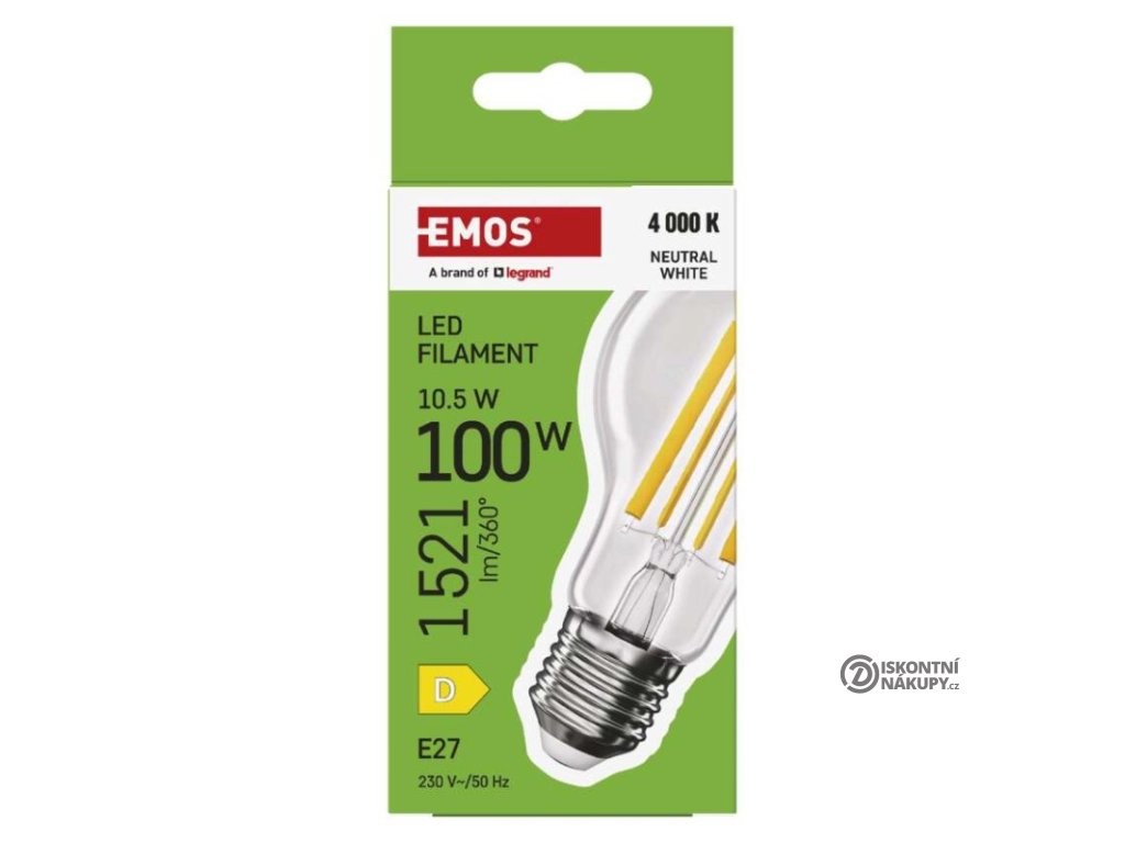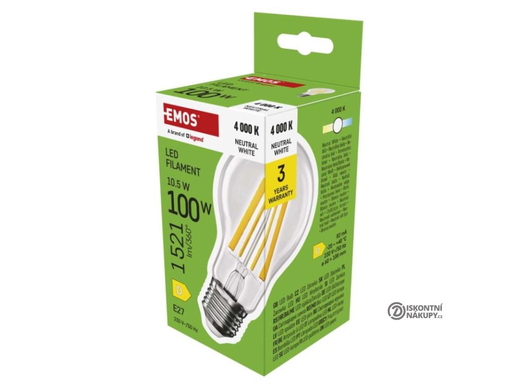 barva světla: neutrální bílá|energetická třída: D|index podání barev (CRI): 80|kompatibilita: –|náhrada za žárovku: 100 W|napětí: 230 V~/50 Hz|notifikace do mobilní aplikace: ne|ovládání hlasovými asistenty: ne|patice (uchycení žárovky): E27|počet čipů: 4|počet spínacích cyklů: 25 000|podporované OS: –|přenosová frekvence: –|příkon: 10,5 W|prodejní obal: 1 ks, krabička|protokol: –|řada: FILAMENT|rozměr: 108 × 60 × 60 mm|stmívatelná: ne|světelná účinnost: 145 lm/W|světelný tok: 1 521 lm|technologie: LED|teplota chromatičnosti: 4 000 K|tvar: A60|typ čipů: COB|účiník: 0,50|úhel vyzařování: 360°|záruční doba: 3 roky|životnost: 25 000 hodinDoplňkové parametry