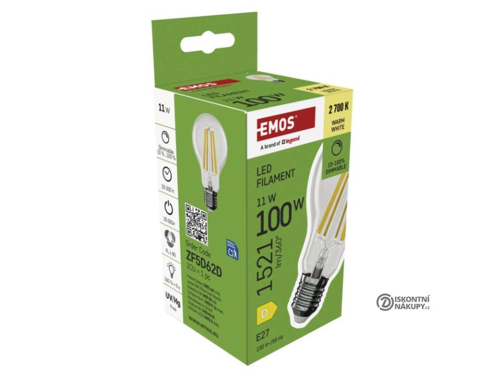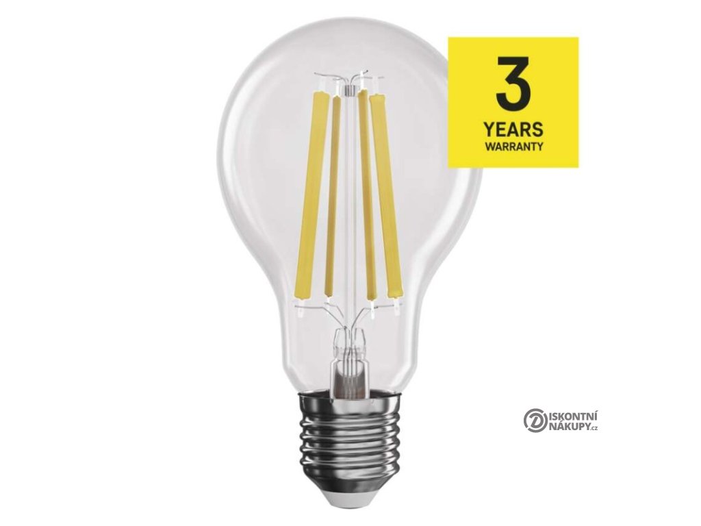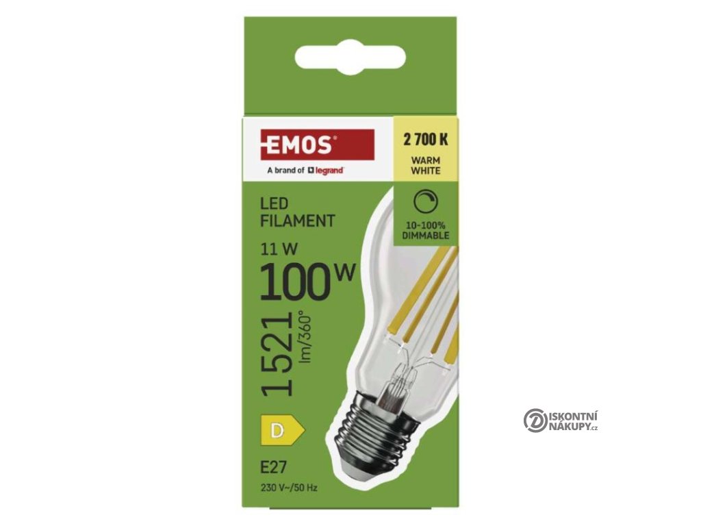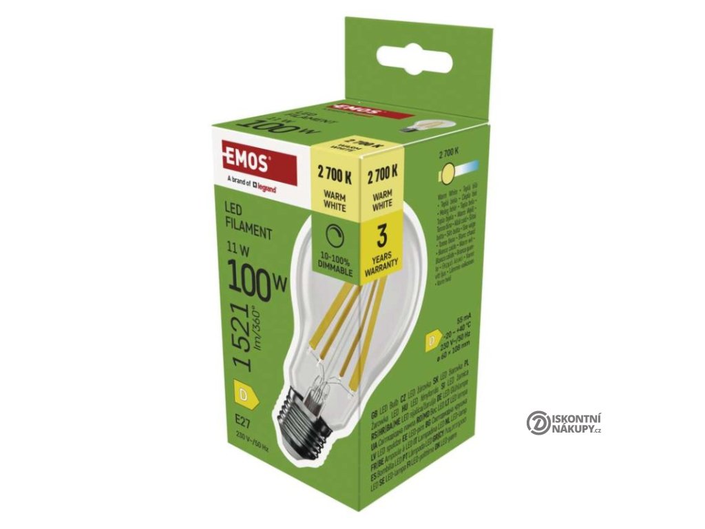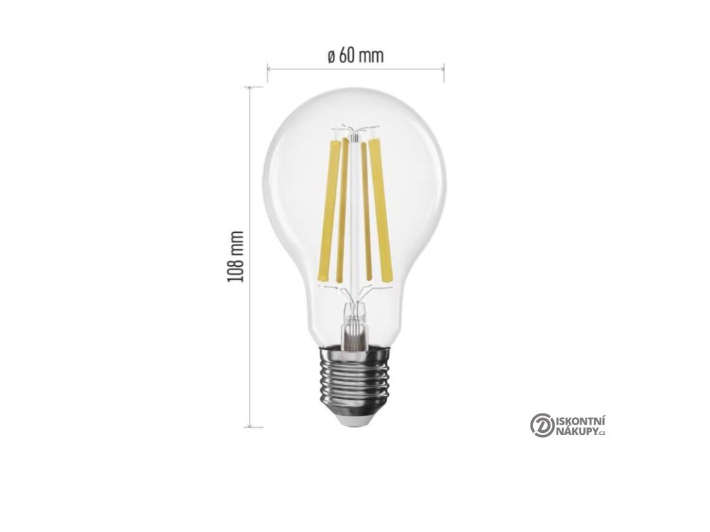 barva světla: teplá bílá|energetická třída: D|index podání barev (CRI): 80|kompatibilita: –|náhrada za žárovku: 100 W|napětí: 230 V~/50 Hz|notifikace do mobilní aplikace: –|ovládání hlasovými asistenty: –|patice (uchycení žárovky): E27|počet čipů: neuvádí se|počet spínacích cyklů: 25 000|podporované OS: –|přenosová frekvence: –|příkon: 11 W|prodejní obal: 1 ks, krabička|protokol: –|řada: FILAMENT|rozměr: 60 × 60 × 108 mm|stmívatelná: ano|světelná účinnost: 138 lm/W|světelný tok: 1 521 lm|technologie: LED|teplota chromatičnosti: 2 700 K|tvar: A60|typ čipů: COB|účiník: 0,94|úhel vyzařování: 320°|záruční doba: 3 roky|životnost: 25 000 hodinDoplňkové parametry
