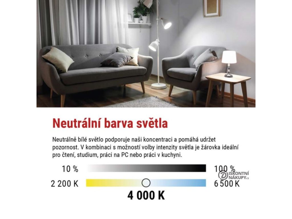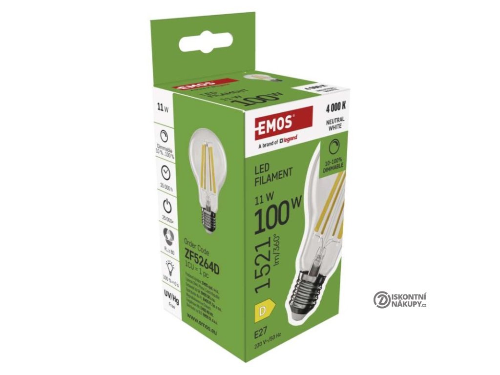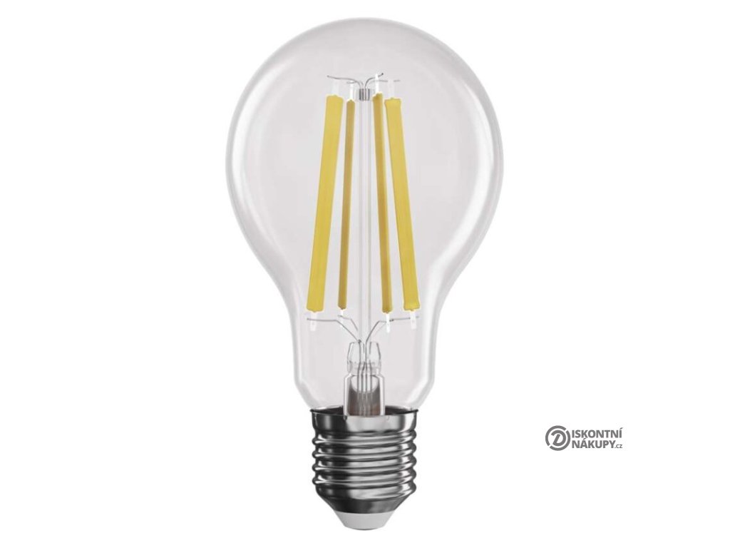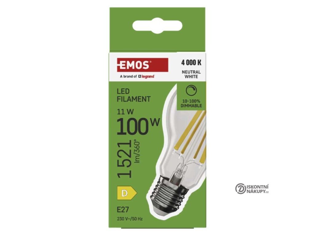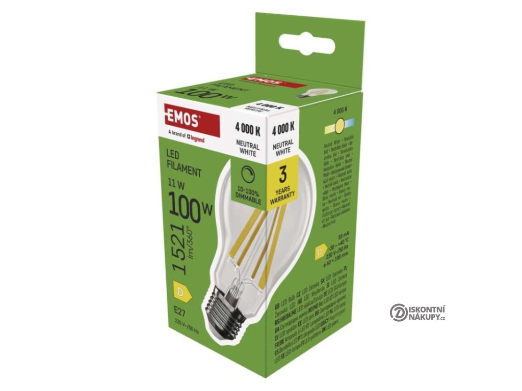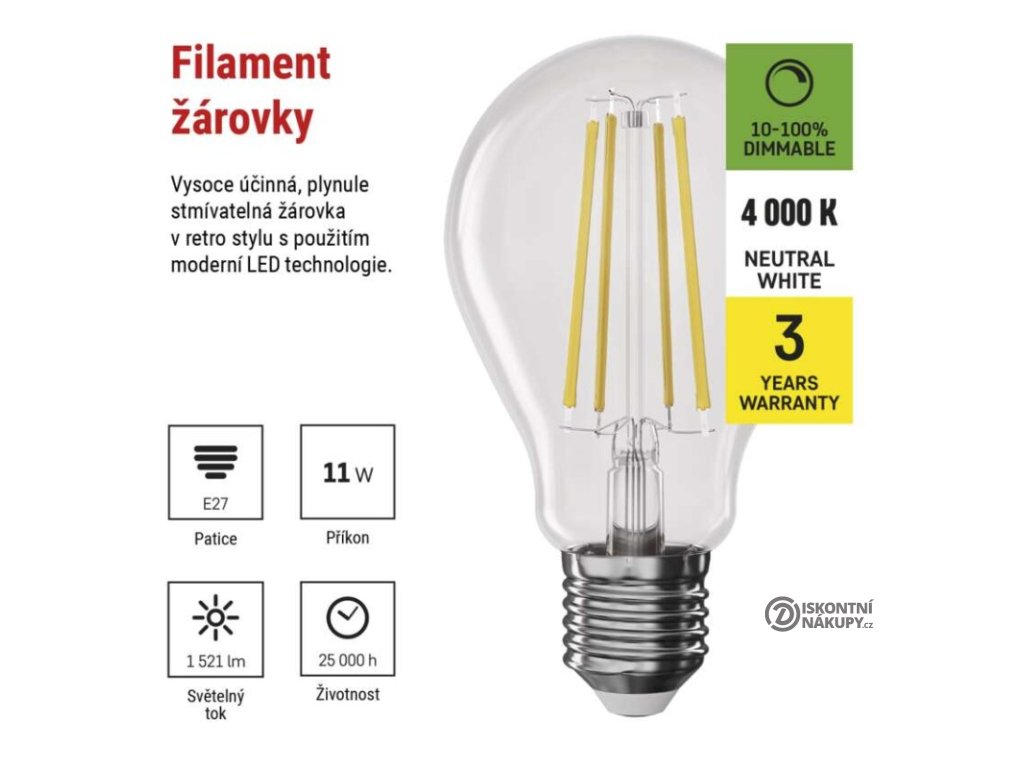 barva světla: neutrální bílá|energetická třída: D|index podání barev (CRI): 80|kompatibilita: –|náhrada za žárovku: 100 W|napětí: 230 V~/50 Hz|notifikace do mobilní aplikace: –|ovládání hlasovými asistenty: –|patice (uchycení žárovky): E27|počet čipů: neuvádí se|počet spínacích cyklů: 25 000|podporované OS: –|přenosová frekvence: –|příkon: 11 W|prodejní obal: 1 ks, krabička|protokol: –|řada: FILAMENT|rozměr: 60 × 60 × 108 mm|stmívatelná: ano|světelná účinnost: 138 lm/W|světelný tok: 1 521 lm|technologie: LED|teplota chromatičnosti: 4 000 K|tvar: A60|typ čipů: COB|účiník: 0,95|úhel vyzařování: 320°|záruční doba: 3 roky|životnost: 25 000 hodinDoplňkové parametry