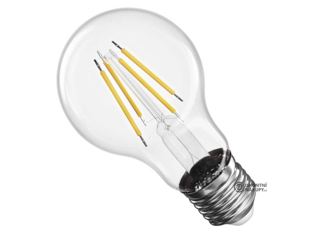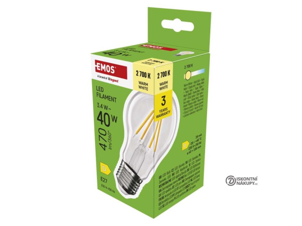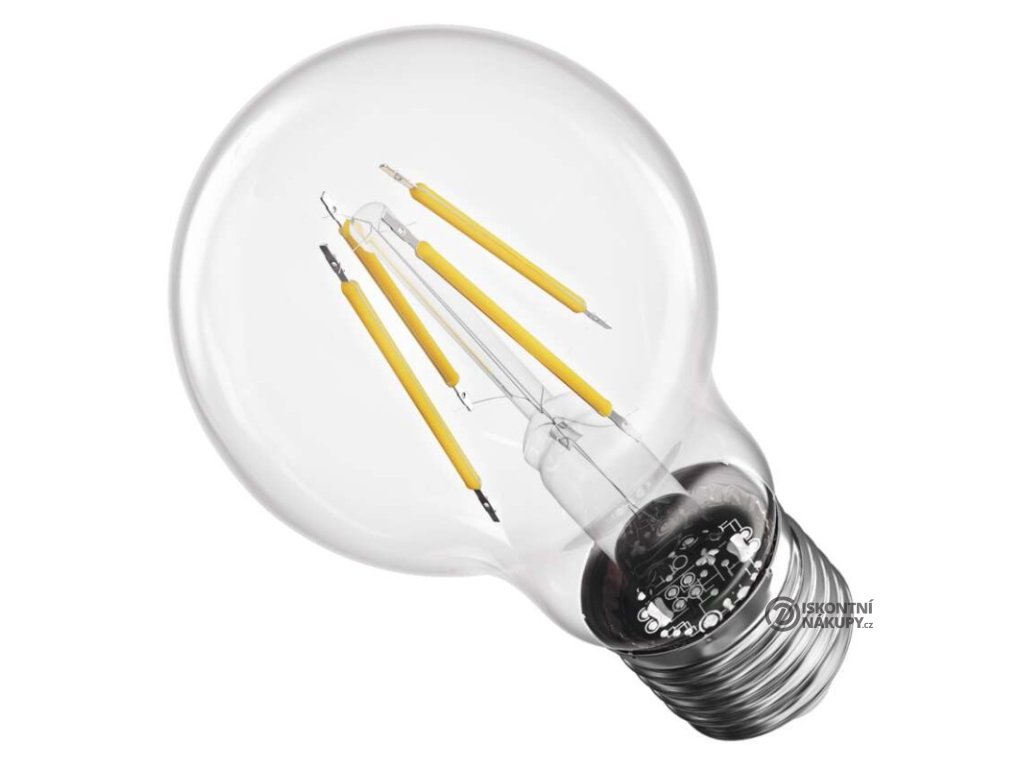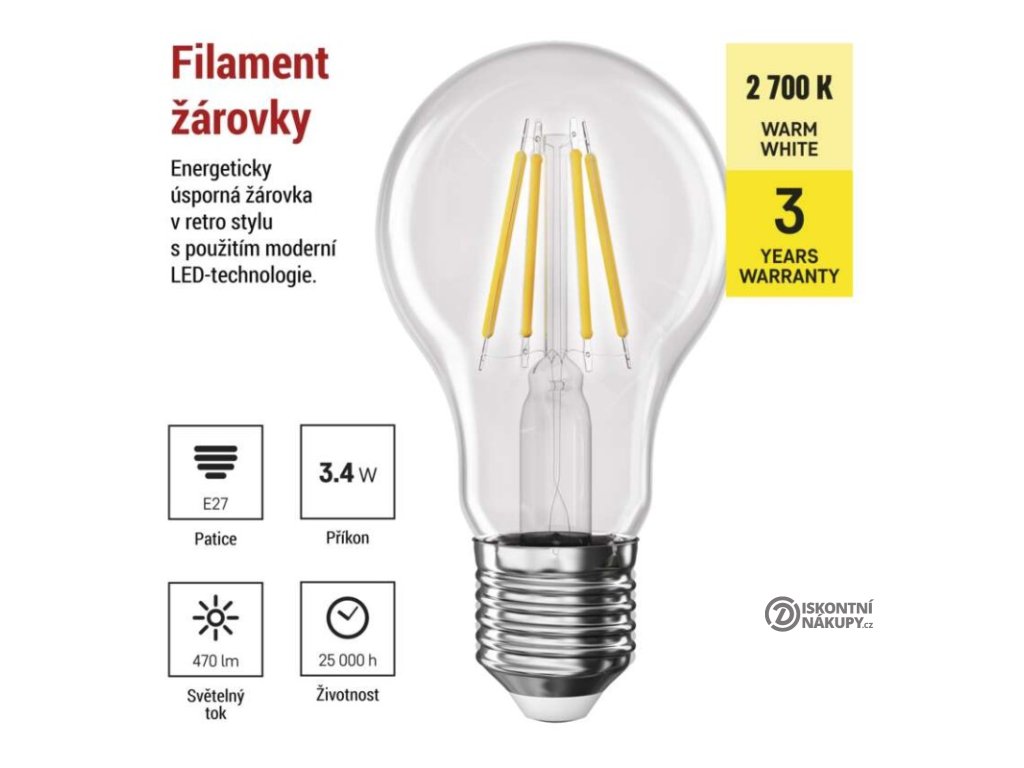 barva světla: teplá bílá|energetická třída: D|index podání barev (CRI): 80|kompatibilita: –|náhrada za žárovku: 40 W|napětí: 230 V~/50 Hz|notifikace do mobilní aplikace: ne|ovládání hlasovými asistenty: ne|patice (uchycení žárovky): E27|počet čipů: 4|počet spínacích cyklů: 25 000|podporované OS: –|přenosová frekvence: –|příkon: 3,4 W|prodejní obal: 1 ks, krabička|protokol: –|řada: FILAMENT|rozměr: 108 × 60 × 60 mm|stmívatelná: ne|světelná účinnost: 138 lm/W|světelný tok: 470 lm|technologie: LED|teplota chromatičnosti: 2 700 K|tvar: A60|typ čipů: COB|účiník: 0,50|úhel vyzařování: 360°|záruční doba: 3 roky|životnost: 25 000 hodinDoplňkové parametry