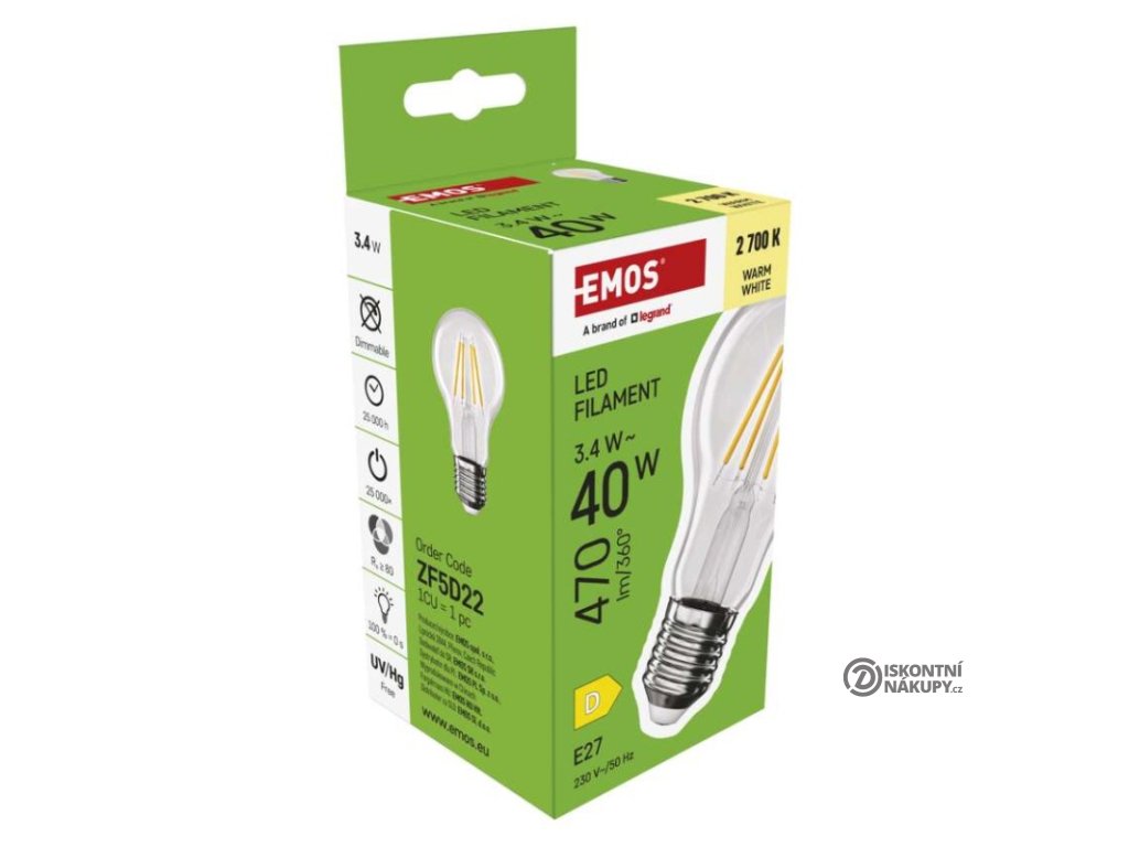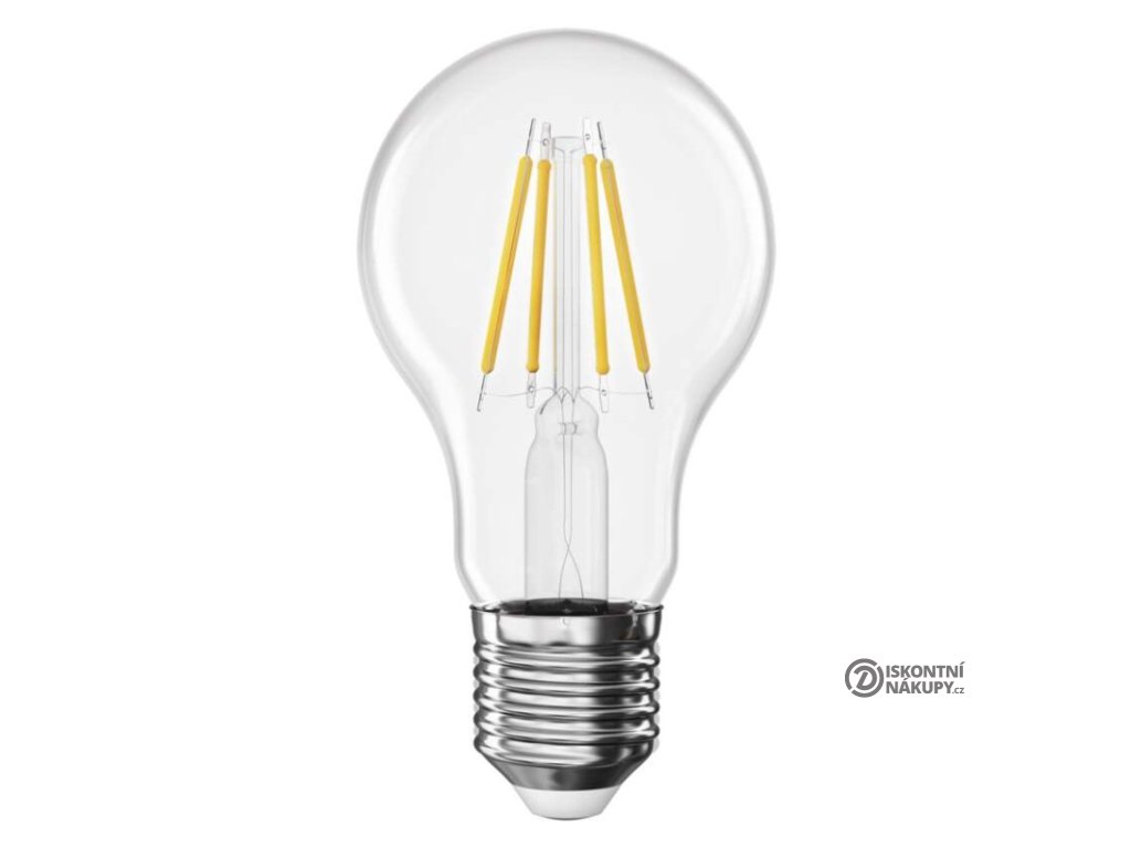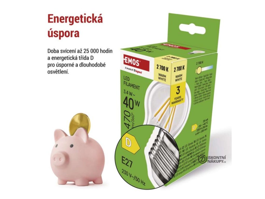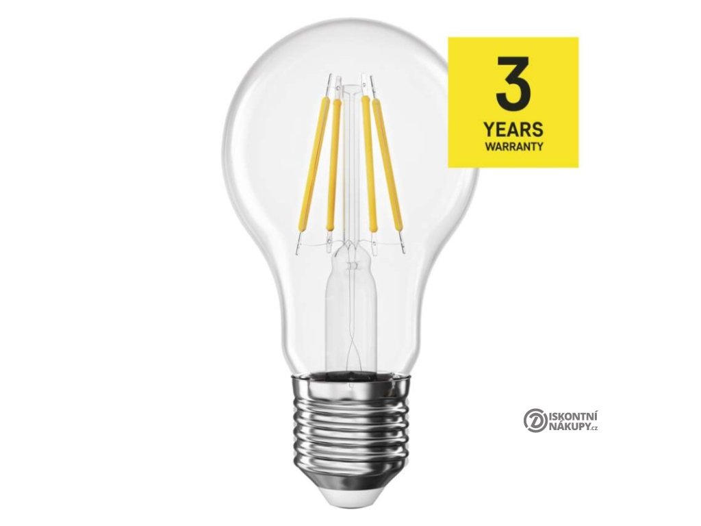 barva světla: teplá bílá|energetická třída: D|index podání barev (CRI): 80|kompatibilita: –|náhrada za žárovku: 40 W|napětí: 230 V~/50 Hz|notifikace do mobilní aplikace: ne|ovládání hlasovými asistenty: ne|patice (uchycení žárovky): E27|počet čipů: 4|počet spínacích cyklů: 25 000|podporované OS: –|přenosová frekvence: –|příkon: 3,4 W|prodejní obal: 1 ks, krabička|protokol: –|řada: FILAMENT|rozměr: 108 × 60 × 60 mm|stmívatelná: ne|světelná účinnost: 138 lm/W|světelný tok: 470 lm|technologie: LED|teplota chromatičnosti: 2 700 K|tvar: A60|typ čipů: COB|účiník: 0,50|úhel vyzařování: 360°|záruční doba: 3 roky|životnost: 25 000 hodinDoplňkové parametry
