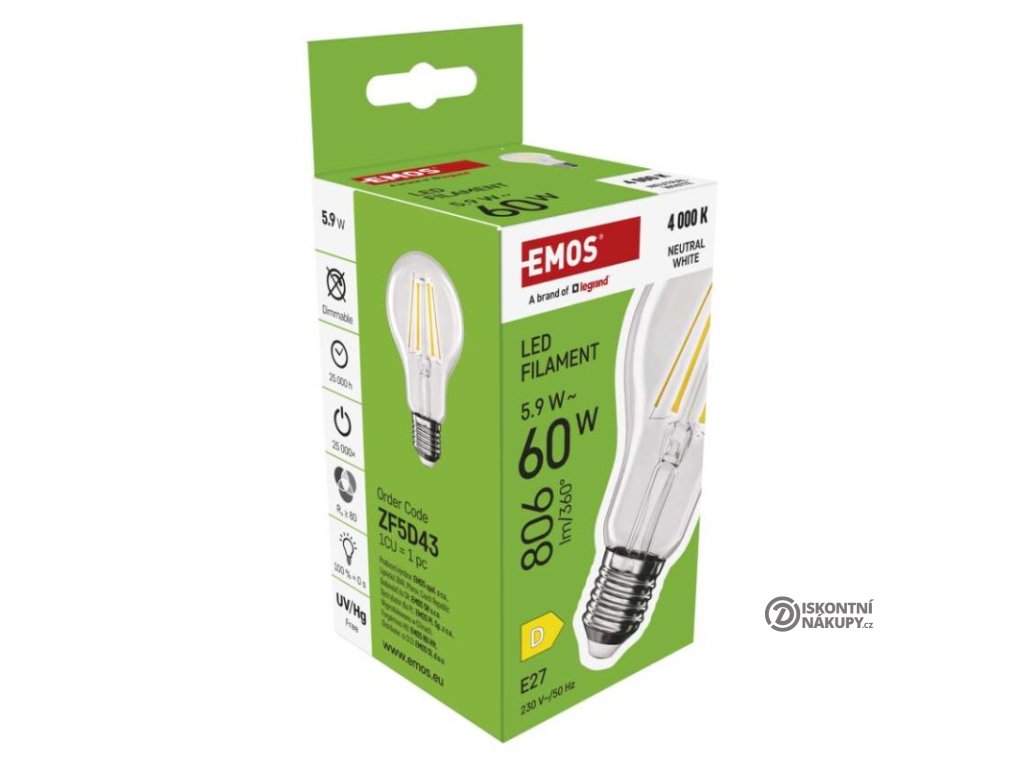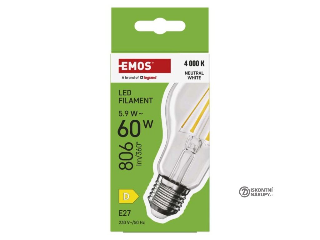 barva světla: neutrální bílá|energetická třída: D|index podání barev (CRI): 80|kompatibilita: –|náhrada za žárovku: 60 W|napětí: 230 V~/50 Hz|notifikace do mobilní aplikace: ne|ovládání hlasovými asistenty: ne|patice (uchycení žárovky): E27|počet čipů: 4|počet spínacích cyklů: 25 000|podporované OS: –|přenosová frekvence: –|příkon: 5,9 W|prodejní obal: 1 ks, krabička|protokol: –|řada: FILAMENT|rozměr: 108 × 60 × 60 mm|stmívatelná: ne|světelná účinnost: 137 lm/W|světelný tok: 806 lm|technologie: LED|teplota chromatičnosti: 4 000 K|tvar: A60|typ čipů: COB|účiník: 0,50|úhel vyzařování: 360°|záruční doba: 3 roky|životnost: 25 000 hodinDoplňkové parametry