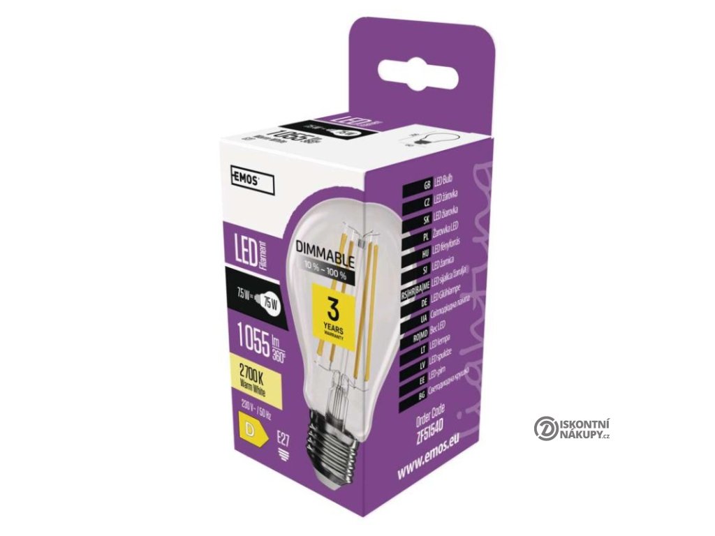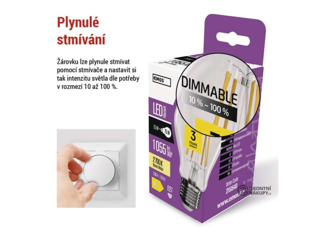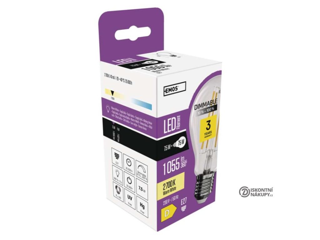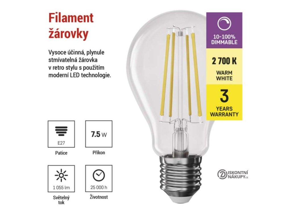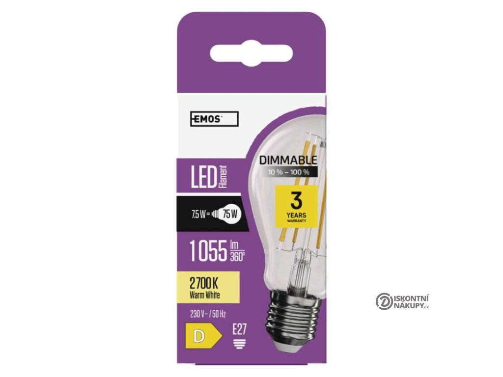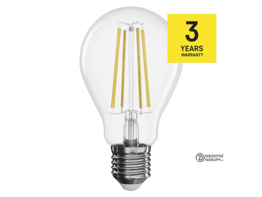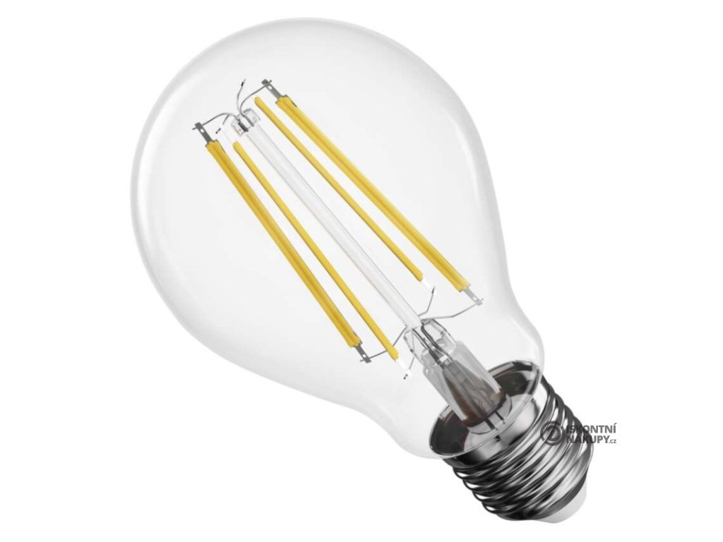 barva světla: teplá bílá|energetická třída: D|index podání barev (CRI): 80|kompatibilita: neuvádí se|náhrada za žárovku: 75 W|napětí: 230 V~/50 Hz|notifikace do mobilní aplikace: neuvádí se|ovládání hlasovými asistenty: neuvádí se|patice (uchycení žárovky): E27|počet čipů: neuvádí se|počet spínacích cyklů: 25 000|podporované OS: neuvádí se|přenosová frekvence: neuvádí se|příkon: 7,5 W|prodejní obal: 1 ks, krabička|protokol: neuvádí se|řada: FILAMENT|rozměr: 60 × 60 × 106 mm|stmívatelná: ano|světelná účinnost: 141 lm/W|světelný tok: 1 055 lm|technologie: LED|teplota chromatičnosti: 2 700 K|tvar: A60|typ čipů: COB|účiník: 0,73|úhel vyzařování: 320°|záruční doba: 3 roky|životnost: 25 000 hodinDoplňkové parametry