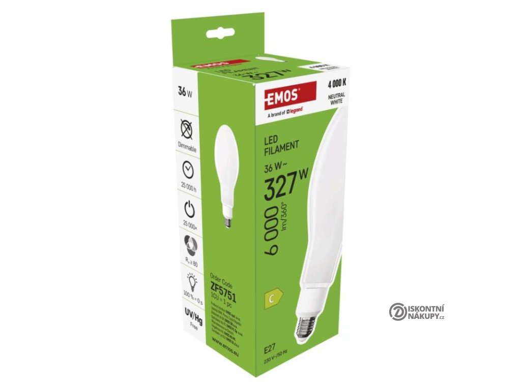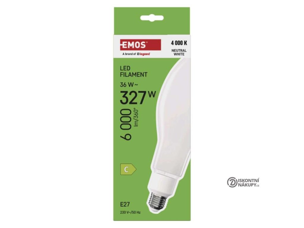 barva světla: neutrální bílá|energetická třída: C|index podání barev (CRI): 80|kompatibilita: neuvádí se|náhrada za žárovku: 327 W|napětí: 230 V~/50 Hz|notifikace do mobilní aplikace: neuvádí se|ovládání hlasovými asistenty: neuvádí se|patice (uchycení žárovky): E27|počet čipů: neuvádí se|počet spínacích cyklů: neuvádí se|podporované OS: neuvádí se|přenosová frekvence: neuvádí se|příkon: 36 W|prodejní obal: 1 ks, krabička|protokol: neuvádí se|řada: FILAMENT|rozměr: 90 × 90 × 245 mm|stmívatelná: ne|světelná účinnost: 167 lm/W|světelný tok: 6 000 lm|technologie: LED|teplota chromatičnosti: 4 000 K|tvar: ED90|typ čipů: COB|účiník: 0,97|úhel vyzařování: 330°|záruční doba: 3 roky|životnost: 25 000 hodinDoplňkové parametry
