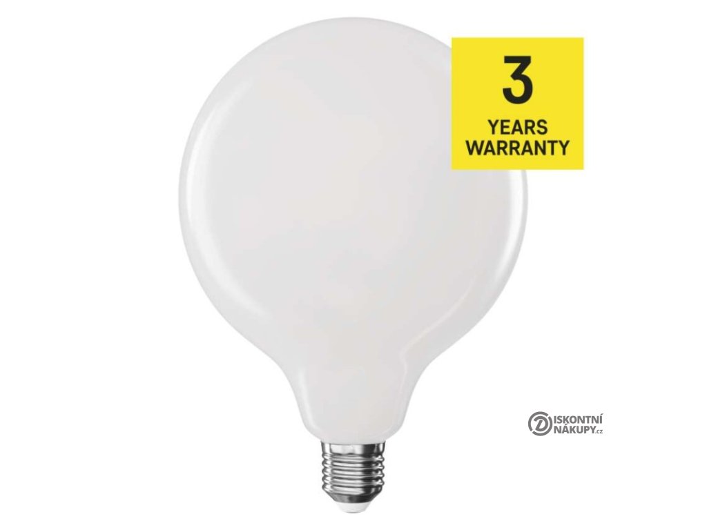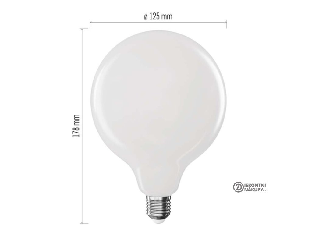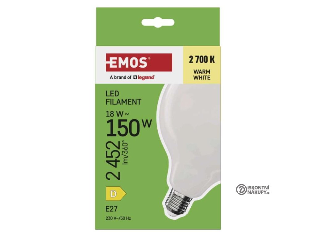 barva světla: teplá bílá|energetická třída: D|index podání barev (CRI): 80|kompatibilita: –|náhrada za žárovku: 150 W|napětí: 230 V~/50 Hz|notifikace do mobilní aplikace: ne|ovládání hlasovými asistenty: ne|patice (uchycení žárovky): E27|počet čipů: 8|počet spínacích cyklů: 25 000|podporované OS: –|přenosová frekvence: –|příkon: 18 W|prodejní obal: 1 ks, krabička|protokol: –|řada: FILAMENT|rozměr: 125 × 125 × 178 mm|stmívatelná: ne|světelná účinnost: 136 lm/W|světelný tok: 2 452 lm|technologie: LED|teplota chromatičnosti: 2 700 K|tvar: G125|typ čipů: COB|účiník: 0,50|úhel vyzařování: 360°|záruční doba: 3 roky|životnost: 25 000 hodinDoplňkové parametry