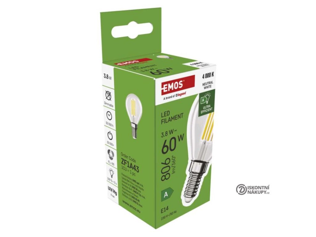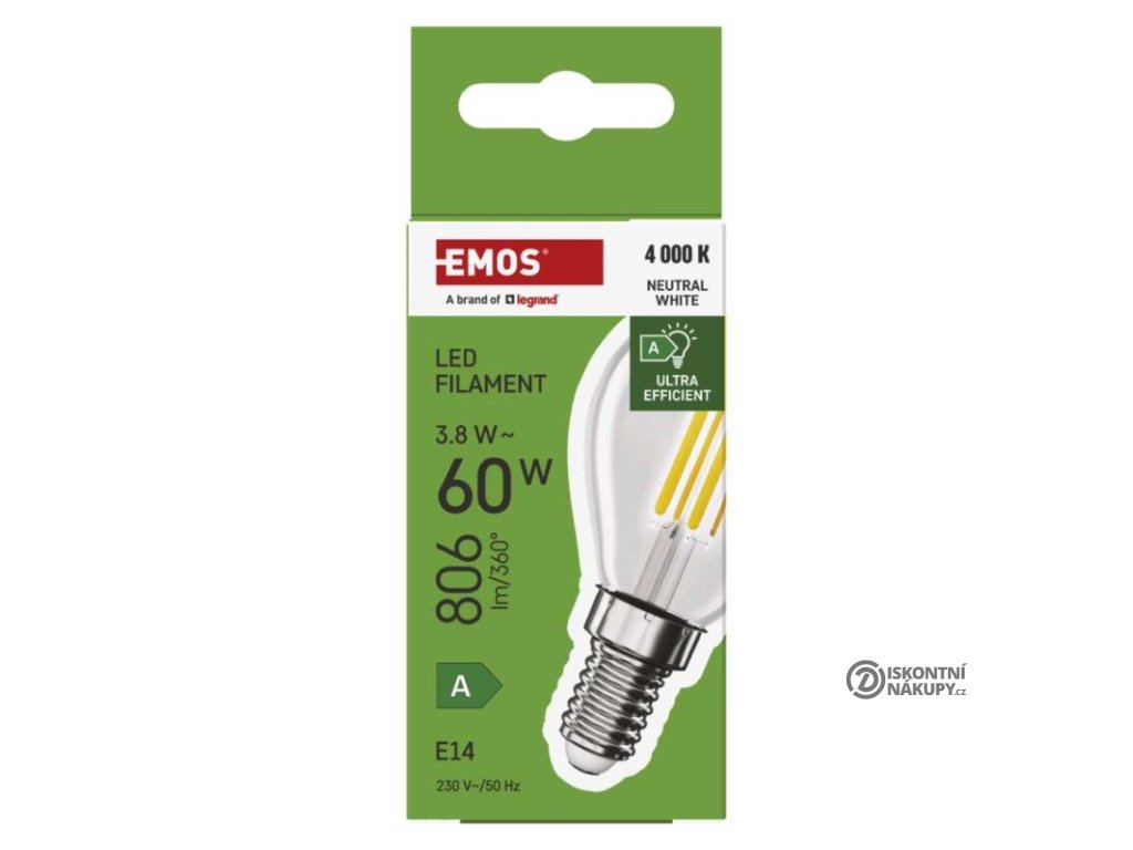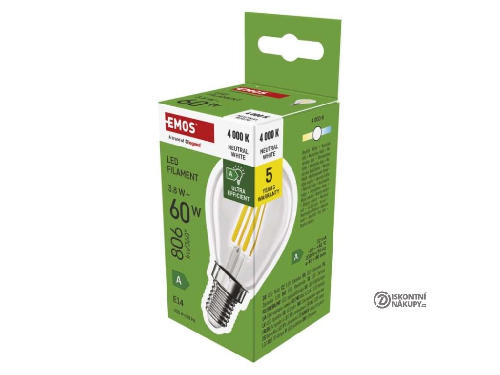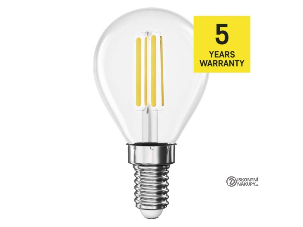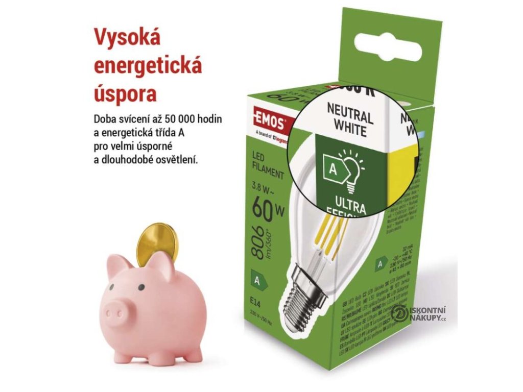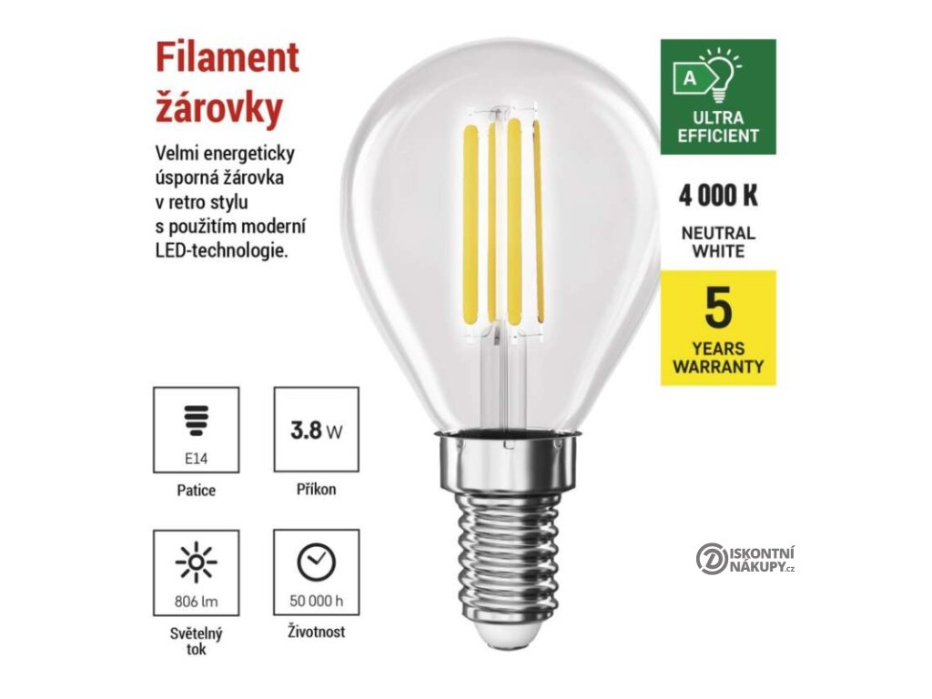 barva světla: neutrální bílá|energetická třída: A|index podání barev (CRI): 80|kompatibilita: neuvádí se|náhrada za žárovku: 60 W|napětí: 230 V~/50 Hz|notifikace do mobilní aplikace: neuvádí se|ovládání hlasovými asistenty: neuvádí se|patice (uchycení žárovky): E14|počet čipů: 4|počet spínacích cyklů: 30 000|podporované OS: neuvádí se|přenosová frekvence: neuvádí se|příkon: 3,8 W|prodejní obal: 1 ks, krabička|protokol: neuvádí se|řada: FILAMENT|rozměr: 45 × 45 × 80 mm|stmívatelná: ne|světelná účinnost: 212 lm/W|světelný tok: 806 lm|technologie: LED|teplota chromatičnosti: 4 000 K|tvar: Mini Globe|typ čipů: COB|účiník: 0,5|úhel vyzařování: 360°|záruční doba: 5 let|životnost: 50 000 hodinDoplňkové parametry