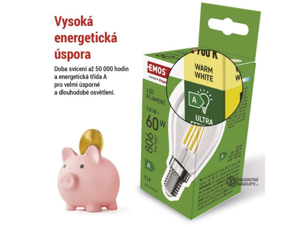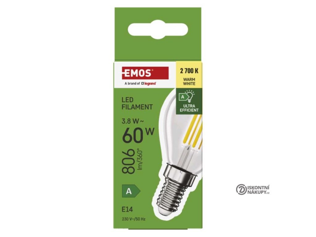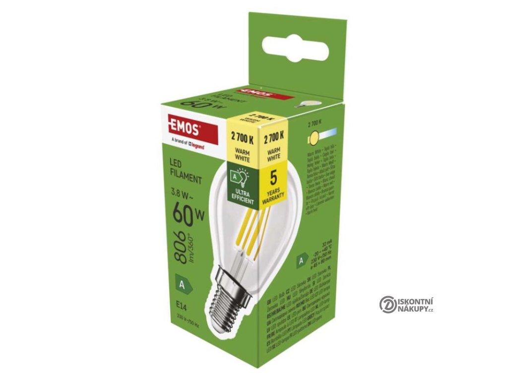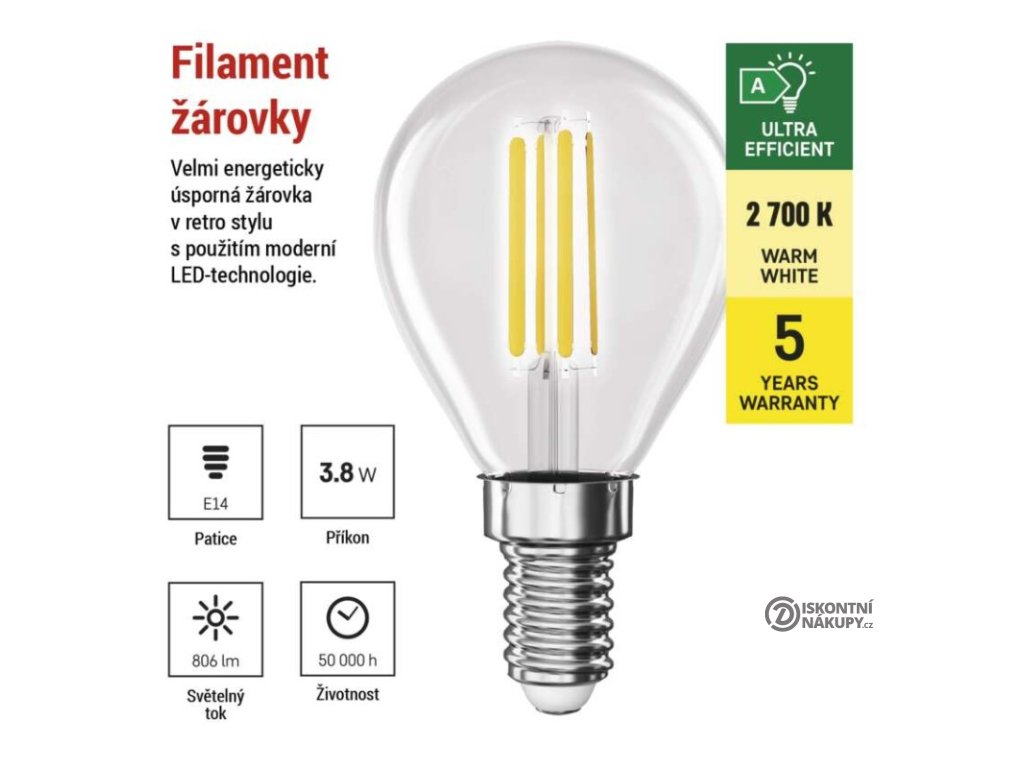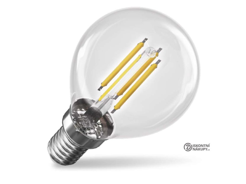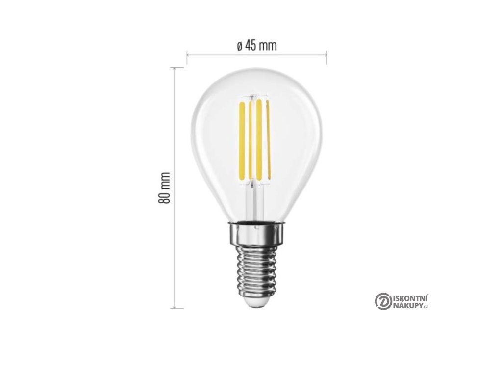 barva světla: teplá bílá|energetická třída: A|index podání barev (CRI): 80|kompatibilita: neuvádí se|náhrada za žárovku: 60 W|napětí: 230 V~/50 Hz|notifikace do mobilní aplikace: neuvádí se|ovládání hlasovými asistenty: neuvádí se|patice (uchycení žárovky): E14|počet čipů: 4|počet spínacích cyklů: 30 000|podporované OS: neuvádí se|přenosová frekvence: neuvádí se|příkon: 3,8 W|prodejní obal: 1 ks, krabička|protokol: neuvádí se|řada: FILAMENT|rozměr: 45 × 45 × 80 mm|stmívatelná: ne|světelná účinnost: 212 lm/W|světelný tok: 806 lm|technologie: LED|teplota chromatičnosti: 2 700 K|tvar: Mini Globe|typ čipů: COB|účiník: 0,5|úhel vyzařování: 360°|záruční doba: 5 let|životnost: 50 000 hodinDoplňkové parametry