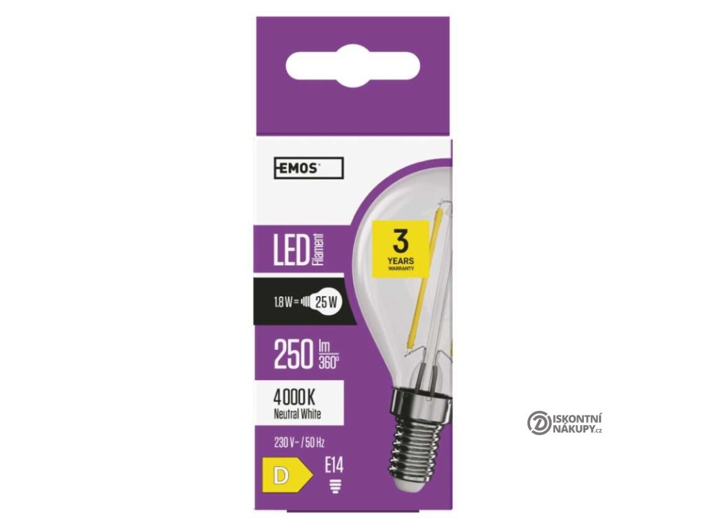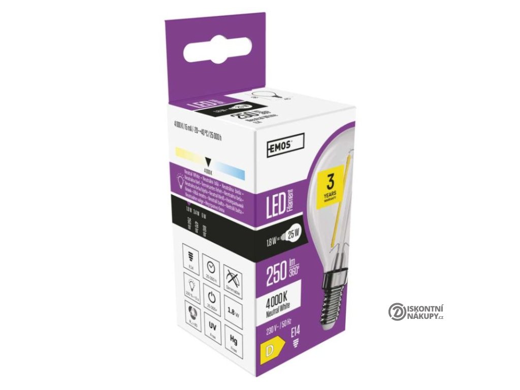 barva světla: neutrální bílá|energetická třída: D|index podání barev (CRI): 80|kompatibilita: –|náhrada za žárovku: 25 W|napětí: 230 V~/50 Hz|notifikace do mobilní aplikace: –|ovládání hlasovými asistenty: –|patice (uchycení žárovky): E14|počet čipů: 2|počet spínacích cyklů: 25 000|podporované OS: –|přenosová frekvence: –|příkon: 1,8 W|prodejní obal: 1 ks, krabička|protokol: –|řada: FILAMENT|rozměr: 80 × 45 × 45 mm|stmívatelná: ne|světelná účinnost: 139 lm/W|světelný tok: 250 lm|technologie: LED|teplota chromatičnosti: 4 000 K|tvar: Mini Globe|typ čipů: COB|účiník: 0,41|úhel vyzařování: 320°|záruční doba: 3 roky|životnost: 25 000 hodinDoplňkové parametry