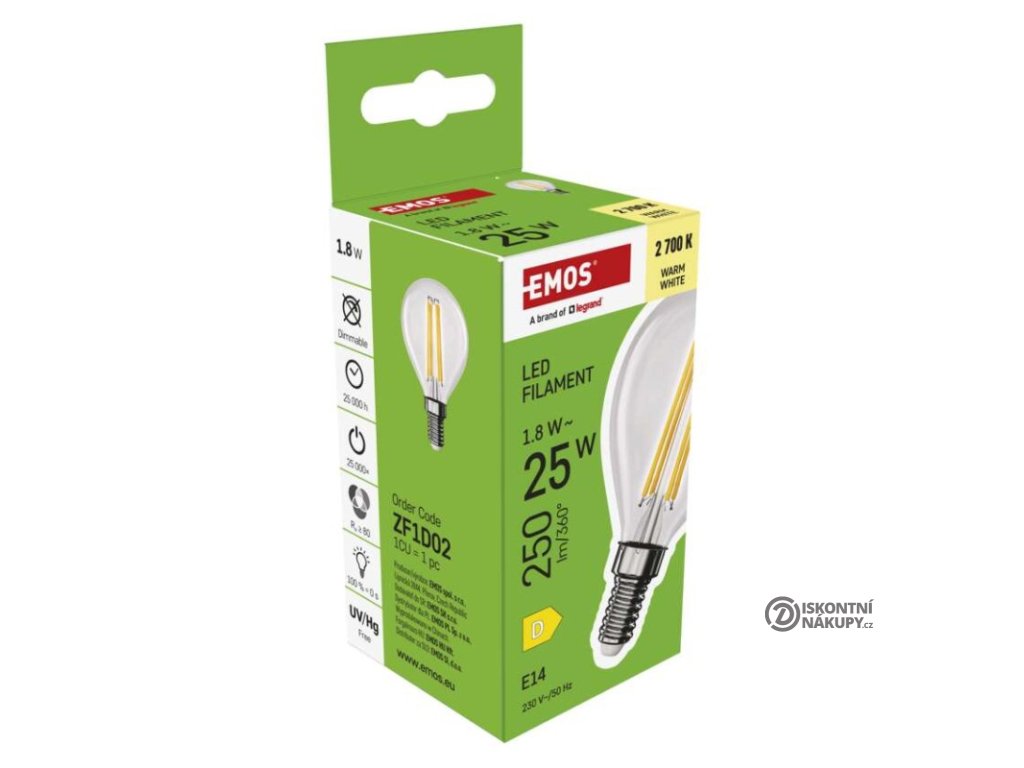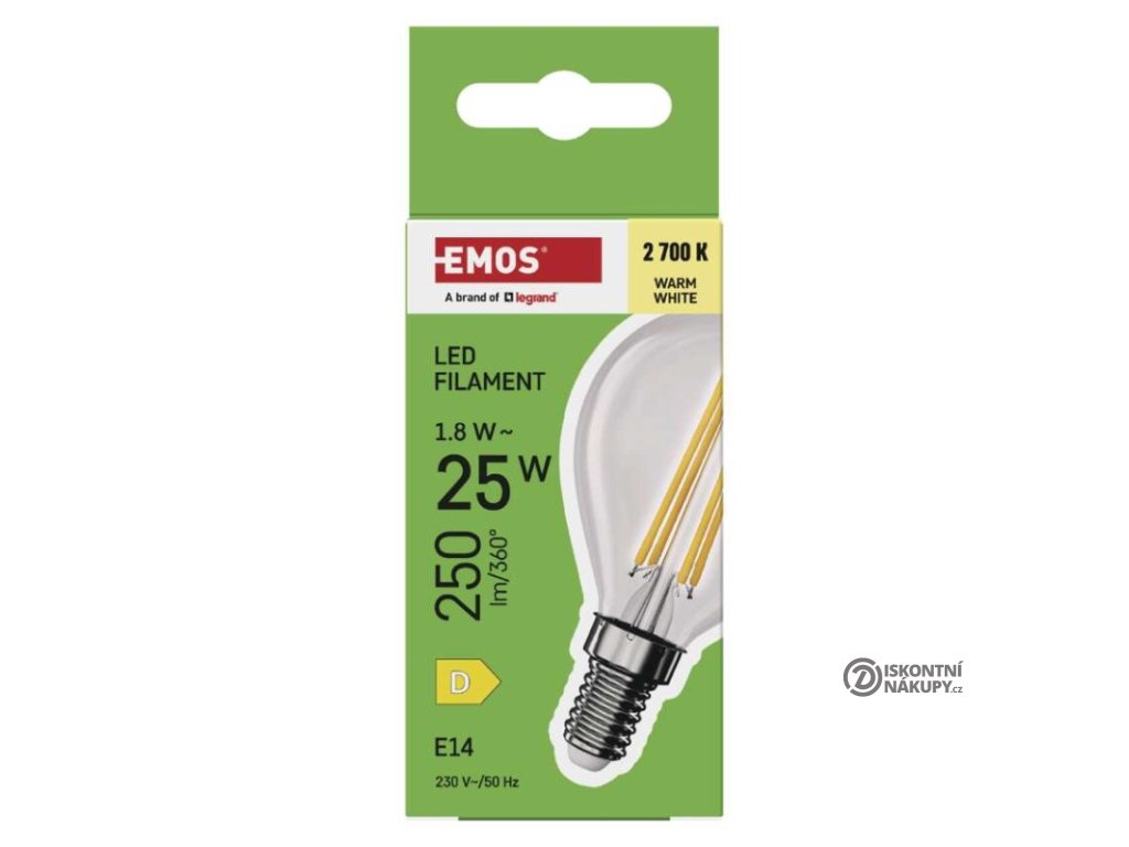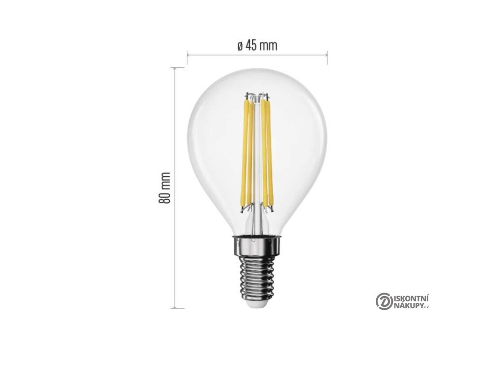 barva světla: teplá bílá|energetická třída: D|index podání barev (CRI): 80|kompatibilita: –|náhrada za žárovku: 25 W|napětí: 230 V~/50 Hz|notifikace do mobilní aplikace: ne|ovládání hlasovými asistenty: ne|patice (uchycení žárovky): E14|počet čipů: 4|počet spínacích cyklů: 25 000|podporované OS: –|přenosová frekvence: –|příkon: 1,8 W|prodejní obal: 1 ks, krabička|protokol: –|řada: FILAMENT|rozměr: 80 × 45 × 45 mm|stmívatelná: ne|světelná účinnost: 139 lm/W|světelný tok: 250 lm|technologie: LED|teplota chromatičnosti: 2 700 K|tvar: Mini Globe|typ čipů: COB|účiník: 0,50|úhel vyzařování: 360°|záruční doba: 3 roky|životnost: 25 000 hodinDoplňkové parametry