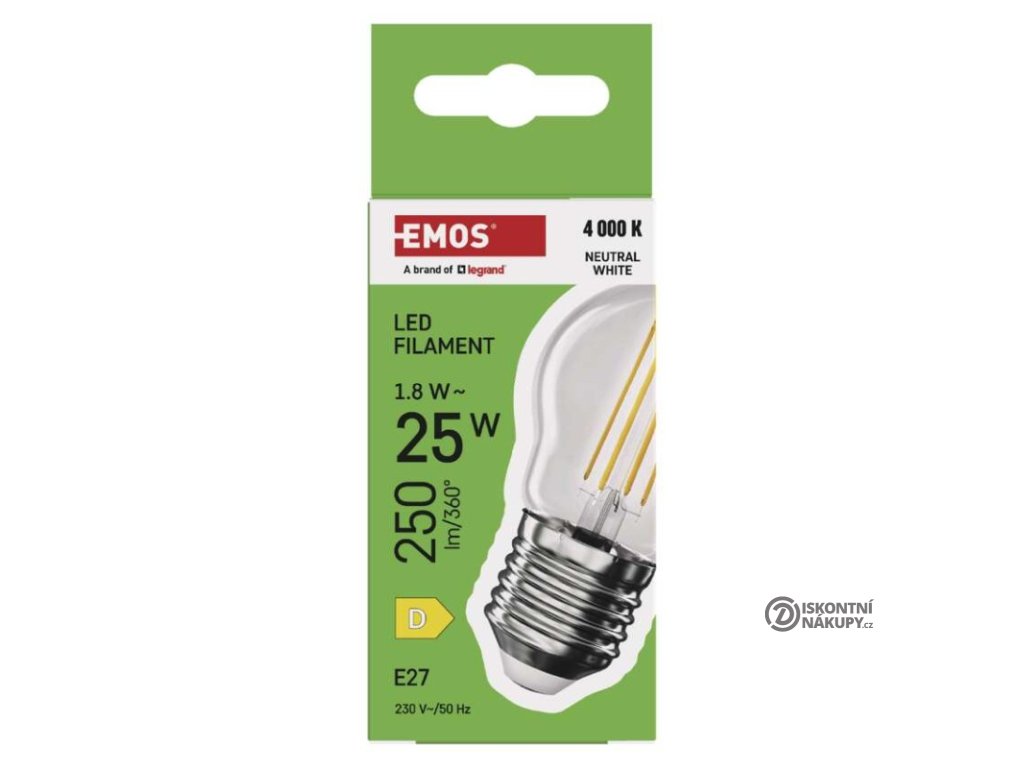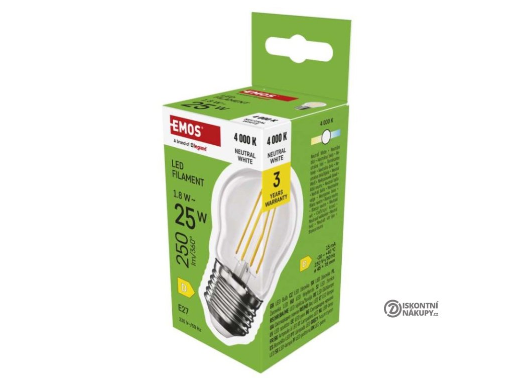 barva světla: neutrální bílá|energetická třída: D|index podání barev (CRI): 80|kompatibilita: –|náhrada za žárovku: 25 W|napětí: 230 V~/50 Hz|notifikace do mobilní aplikace: ne|ovládání hlasovými asistenty: ne|patice (uchycení žárovky): E27|počet čipů: 4|počet spínacích cyklů: 25 000|podporované OS: –|přenosová frekvence: –|příkon: 1,8 W|prodejní obal: 1 ks, krabička|protokol: –|řada: FILAMENT|rozměr: 78 × 45 × 45 mm|stmívatelná: ne|světelná účinnost: 139 lm/W|světelný tok: 250 lm|technologie: LED|teplota chromatičnosti: 4 000 K|tvar: Mini Globe|typ čipů: COB|účiník: 0,50|úhel vyzařování: 360°|záruční doba: 3 roky|životnost: 25 000 hodinDoplňkové parametry