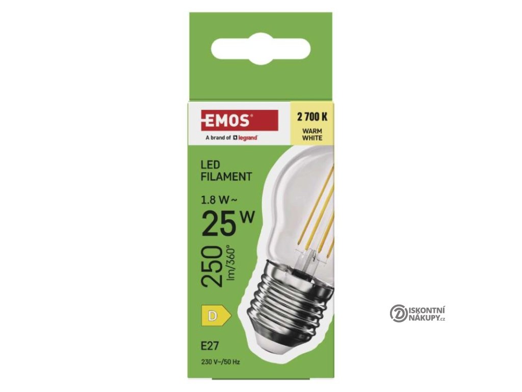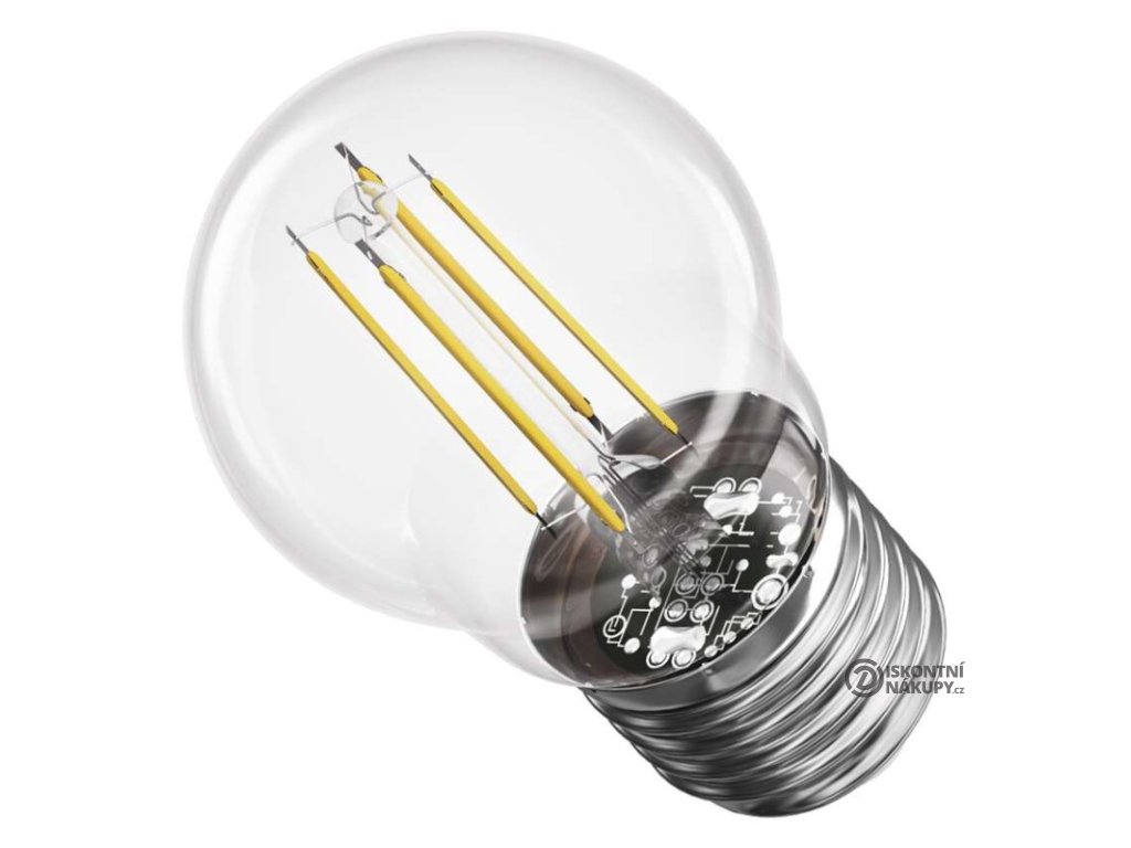 barva světla: teplá bílá|energetická třída: D|index podání barev (CRI): 80|kompatibilita: –|náhrada za žárovku: 25 W|napětí: 230 V~/50 Hz|notifikace do mobilní aplikace: ne|ovládání hlasovými asistenty: ne|patice (uchycení žárovky): E27|počet čipů: 4|počet spínacích cyklů: 25 000|podporované OS: –|přenosová frekvence: –|příkon: 1,8 W|prodejní obal: 1 ks, krabička|protokol: –|řada: FILAMENT|rozměr: 78 × 45 × 45 mm|stmívatelná: ne|světelná účinnost: 139 lm/W|světelný tok: 250 lm|technologie: LED|teplota chromatičnosti: 2 700 K|tvar: Mini Globe|typ čipů: COB|účiník: 0,50|úhel vyzařování: 360°|záruční doba: 3 roky|životnost: 25 000 hodinDoplňkové parametry
