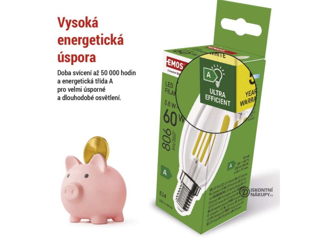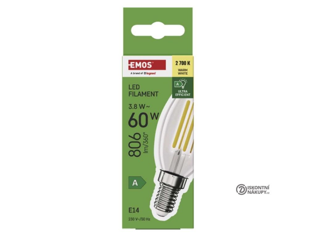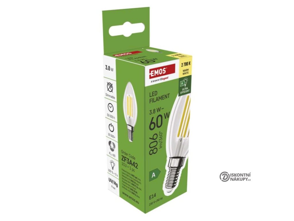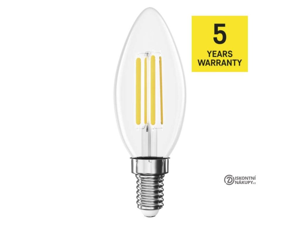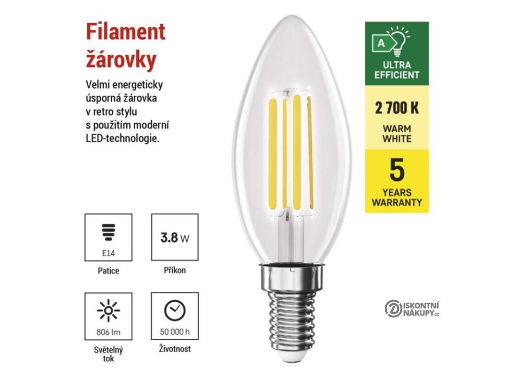 barva světla: teplá bílá|energetická třída: A|index podání barev (CRI): 80|kompatibilita: neuvádí se|náhrada za žárovku: 60 W|napětí: 230 V~/50 Hz|notifikace do mobilní aplikace: neuvádí se|ovládání hlasovými asistenty: neuvádí se|patice (uchycení žárovky): E14|počet čipů: 4|počet spínacích cyklů: 30 000|podporované OS: neuvádí se|přenosová frekvence: neuvádí se|příkon: 3,8 W|prodejní obal: 1 ks, krabička|protokol: neuvádí se|řada: FILAMENT|rozměr: 35 × 35 × 97 mm|stmívatelná: ne|světelná účinnost: 212 lm/W|světelný tok: 806 lm|technologie: LED|teplota chromatičnosti: 2 700 K|tvar: svíčka|typ čipů: COB|účiník: 0,5|úhel vyzařování: 360°|záruční doba: 5 let|životnost: 50 000 hodinDoplňkové parametry