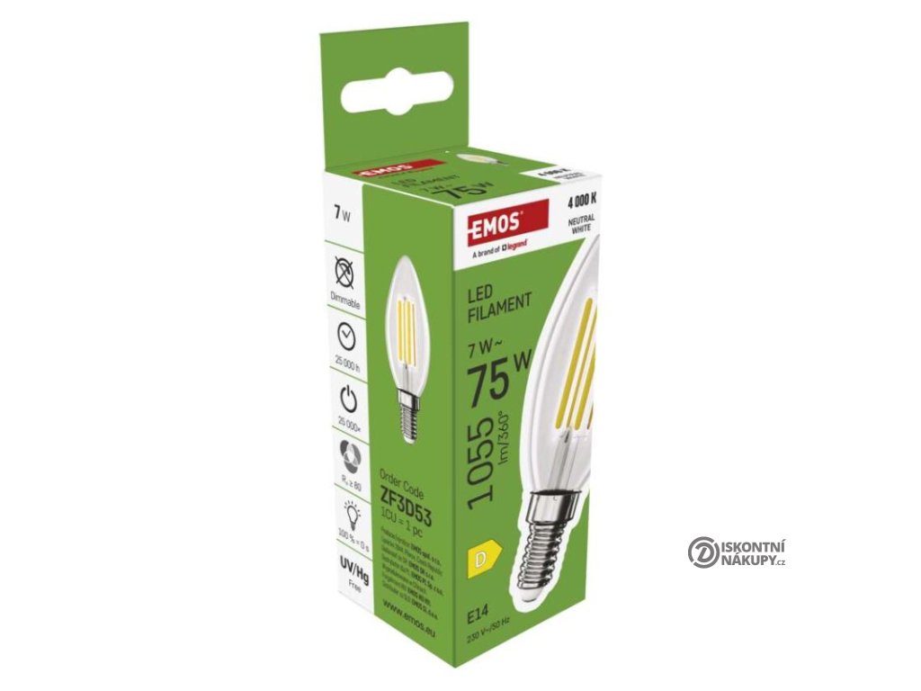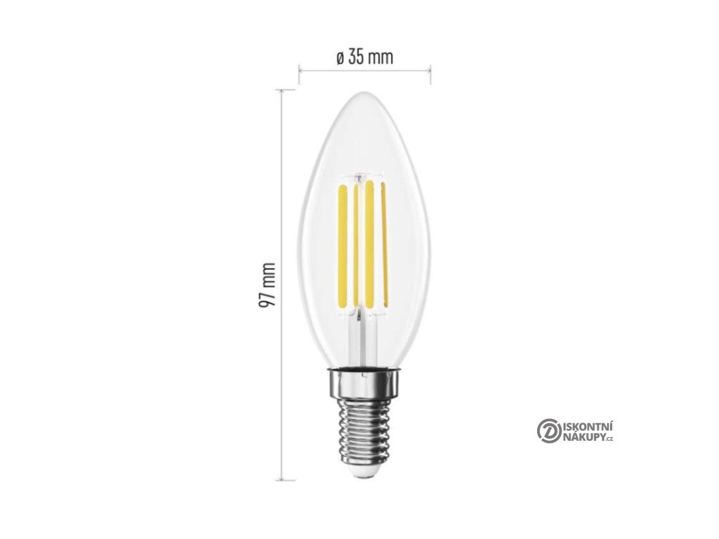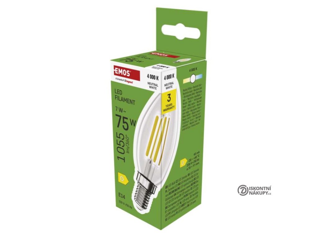 barva světla: neutrální bílá|energetická třída: D|index podání barev (CRI): 80|kompatibilita: neuvádí se|náhrada za žárovku: 75 W|napětí: 230 V~/50 Hz|notifikace do mobilní aplikace: neuvádí se|ovládání hlasovými asistenty: neuvádí se|patice (uchycení žárovky): E14|počet čipů: neuvádí se|počet spínacích cyklů: 25 000|podporované OS: neuvádí se|přenosová frekvence: neuvádí se|příkon: 7 W|prodejní obal: 1 ks, krabička|protokol: neuvádí se|řada: FILAMENT|rozměr: 35 × 35 × 97 mm|stmívatelná: ne|světelná účinnost: 151 lm/W|světelný tok: 1 055 lm|technologie: LED|teplota chromatičnosti: 4 000 K|tvar: svíčka|typ čipů: COB|účiník: 0,5|úhel vyzařování: 360°|záruční doba: 3 roky|životnost: 25 000 hodinDoplňkové parametry