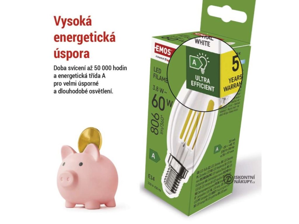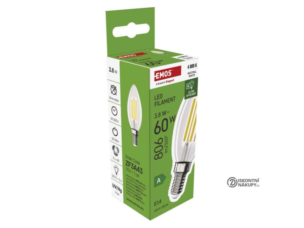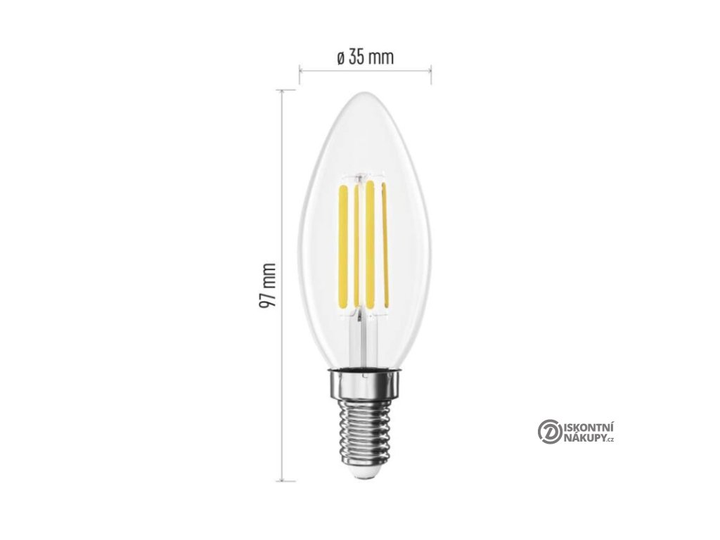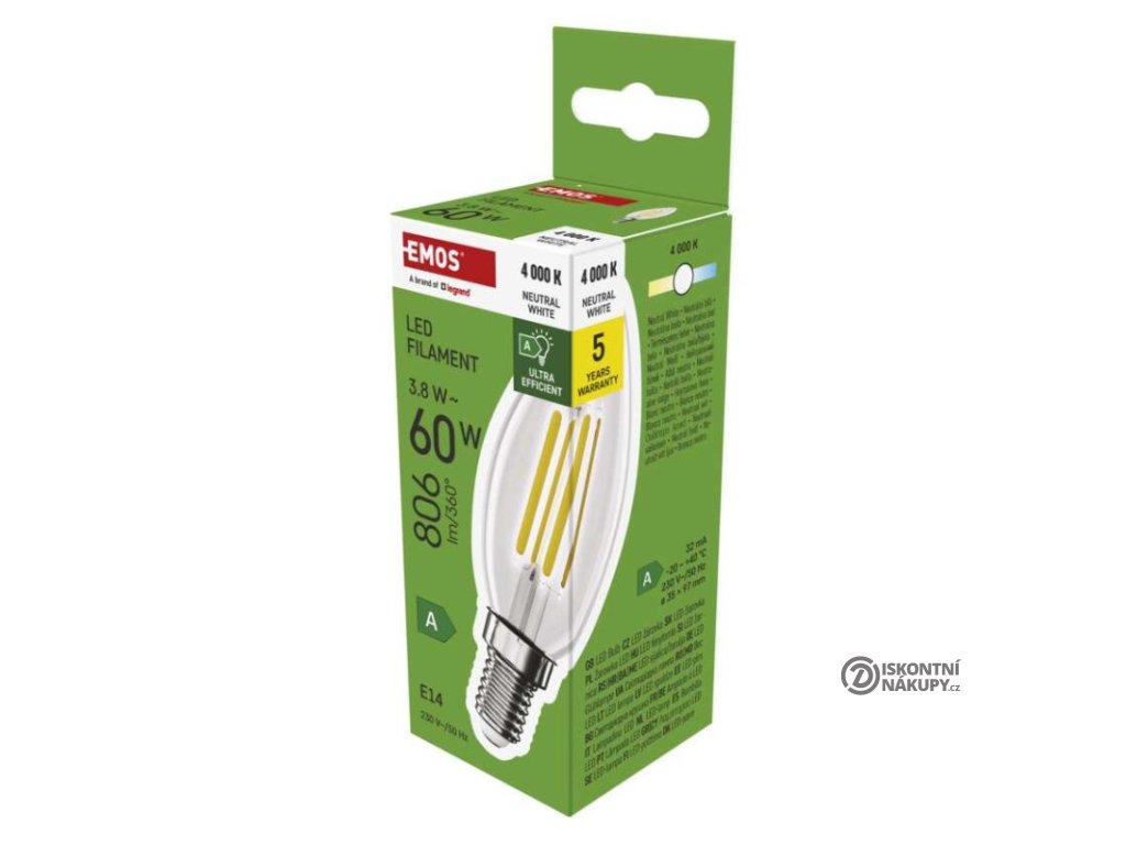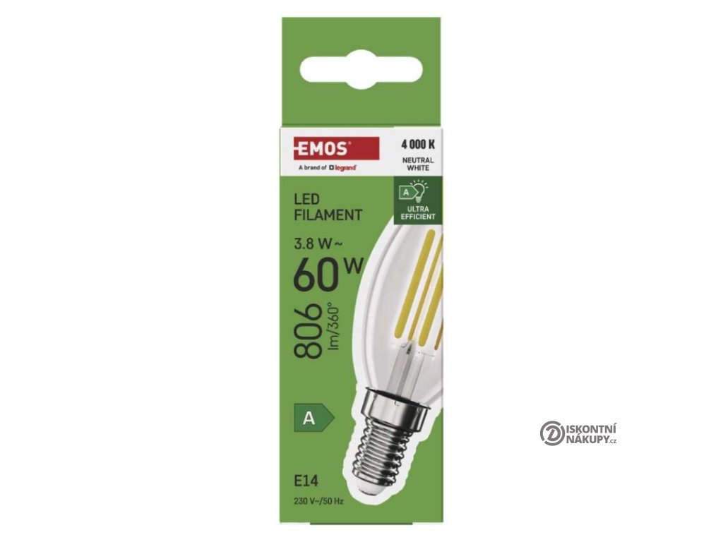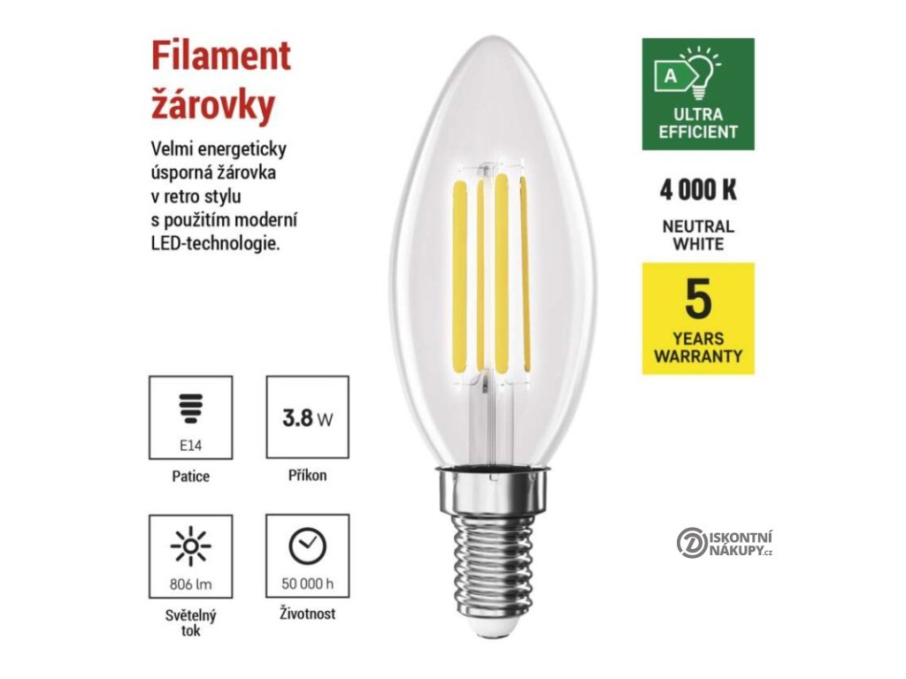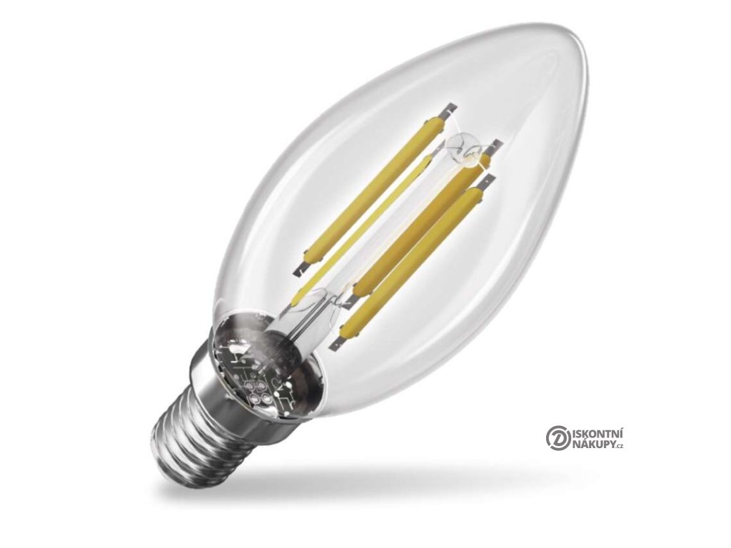 barva světla: neutrální bílá|energetická třída: A|index podání barev (CRI): 80|kompatibilita: neuvádí se|náhrada za žárovku: 60 W|napětí: 230 V~/50 Hz|notifikace do mobilní aplikace: neuvádí se|ovládání hlasovými asistenty: neuvádí se|patice (uchycení žárovky): E14|počet čipů: 4|počet spínacích cyklů: 30 000|podporované OS: neuvádí se|přenosová frekvence: neuvádí se|příkon: 3,8 W|prodejní obal: 1 ks, krabička|protokol: neuvádí se|řada: FILAMENT|rozměr: 35 × 35 × 97 mm|stmívatelná: ne|světelná účinnost: 212 lm/W|světelný tok: 806 lm|technologie: LED|teplota chromatičnosti: 4 000 K|tvar: svíčka|typ čipů: COB|účiník: 0,5|úhel vyzařování: 360°|záruční doba: 5 let|životnost: 50 000 hodinDoplňkové parametry