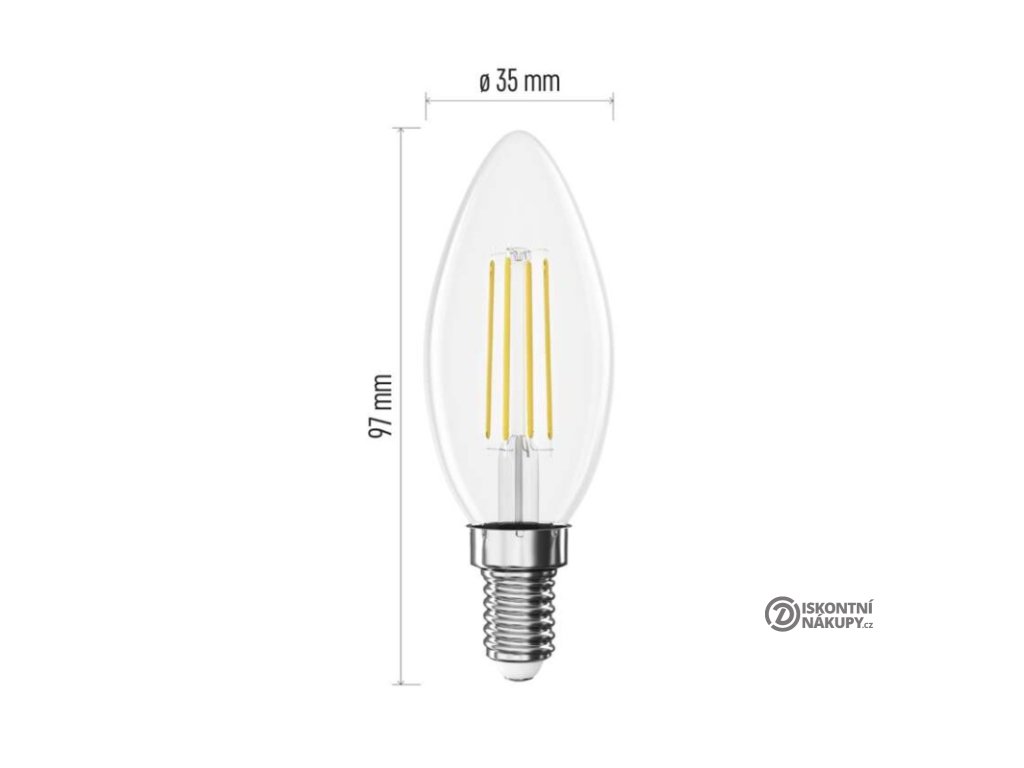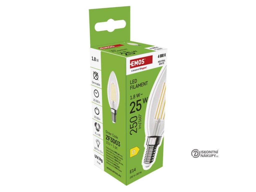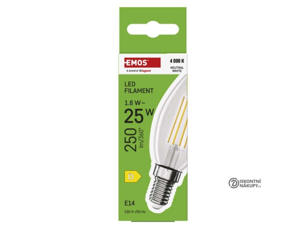 barva světla: neutrální bílá|energetická třída: D|index podání barev (CRI): 80|kompatibilita: –|náhrada za žárovku: 25 W|napětí: 230 V~/50 Hz|notifikace do mobilní aplikace: ne|ovládání hlasovými asistenty: ne|patice (uchycení žárovky): E14|počet čipů: 4|počet spínacích cyklů: 25 000|podporované OS: –|přenosová frekvence: –|příkon: 1,8 W|prodejní obal: 1 ks, krabička|protokol: –|řada: FILAMENT|rozměr: 35 × 35 × 97 mm|stmívatelná: ne|světelná účinnost: 139 lm/W|světelný tok: 250 lm|technologie: LED|teplota chromatičnosti: 4 000 K|tvar: svíčka|typ čipů: COB|účiník: 0,50|úhel vyzařování: 360°|záruční doba: 3 roky|životnost: 25 000 hodinDoplňkové parametry