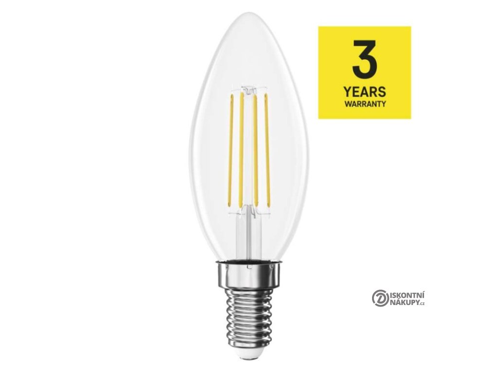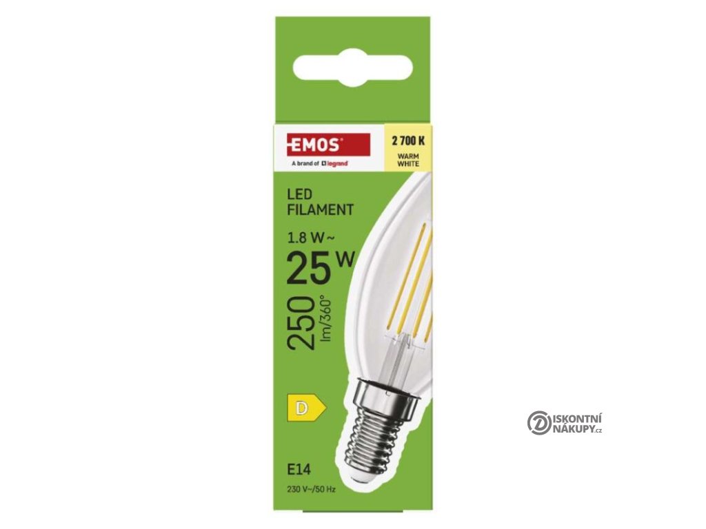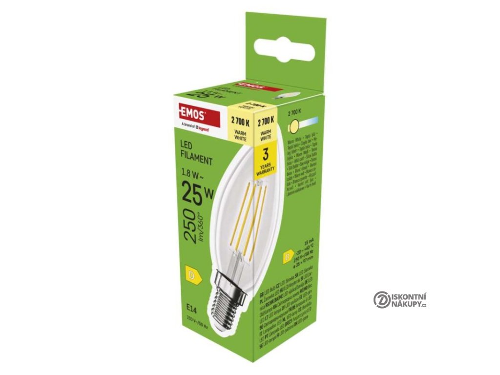 barva světla: teplá bílá|energetická třída: D|index podání barev (CRI): 80|kompatibilita: –|náhrada za žárovku: 25 W|napětí: 230 V~/50 Hz|notifikace do mobilní aplikace: ne|ovládání hlasovými asistenty: ne|patice (uchycení žárovky): E14|počet čipů: 4|počet spínacích cyklů: 25 000|podporované OS: –|přenosová frekvence: –|příkon: 1,8 W|prodejní obal: 1 ks, krabička|protokol: –|řada: FILAMENT|rozměr: 35 × 35 × 97 mm|stmívatelná: ne|světelná účinnost: 139 lm/W|světelný tok: 250 lm|technologie: LED|teplota chromatičnosti: 2 700 K|tvar: svíčka|typ čipů: COB|účiník: 0,50|úhel vyzařování: 360°|záruční doba: 3 roky|životnost: 25 000 hodinDoplňkové parametry