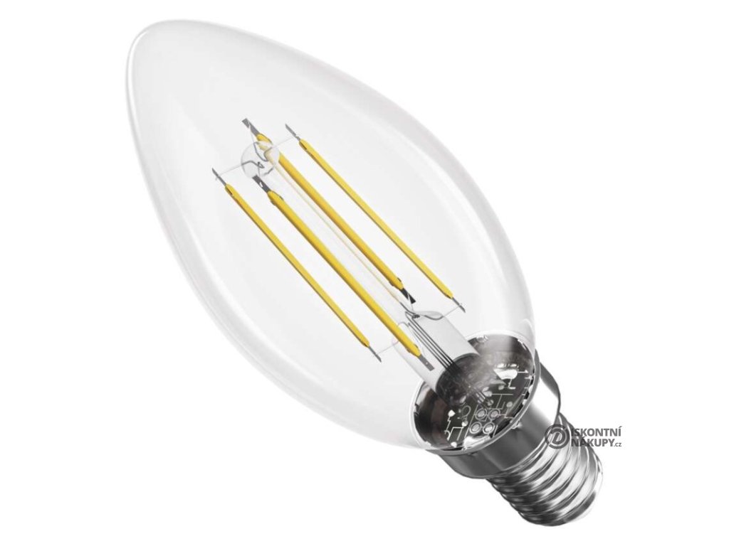 barva světla: teplá bílá|energetická třída: D|index podání barev (CRI): 80|kompatibilita: –|náhrada za žárovku: 40 W|napětí: 230 V~/50 Hz|notifikace do mobilní aplikace: ne|ovládání hlasovými asistenty: ne|patice (uchycení žárovky): E14|počet čipů: 4|počet spínacích cyklů: 25 000|podporované OS: –|přenosová frekvence: –|příkon: 3,4 W|prodejní obal: 1 ks, krabička|protokol: –|řada: FILAMENT|rozměr: 35 × 35 × 97 mm|stmívatelná: ne|světelná účinnost: 138 lm/W|světelný tok: 470 lm|technologie: LED|teplota chromatičnosti: 2 700 K|tvar: svíčka|typ čipů: COB|účiník: 0,50|úhel vyzařování: 360°|záruční doba: 3 roky|životnost: 25 000 hodinDoplňkové parametry