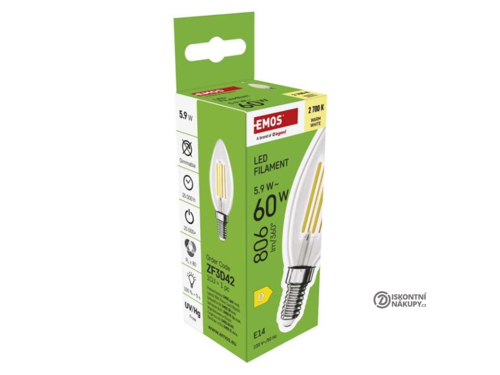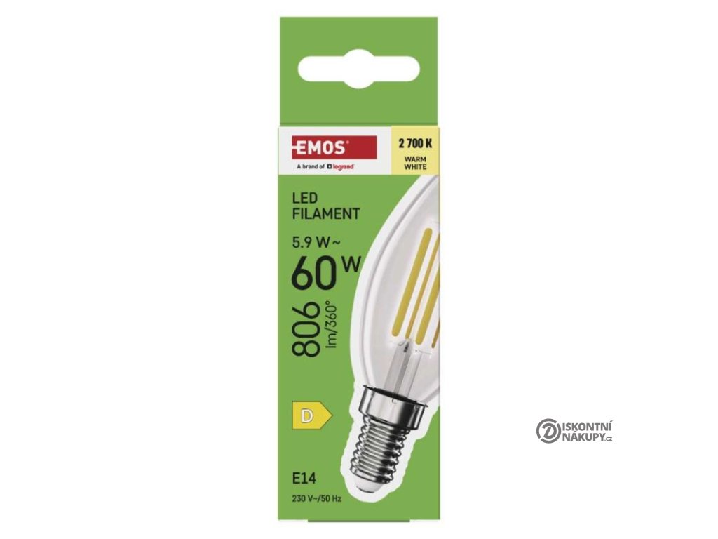 barva světla: teplá bílá|energetická třída: D|index podání barev (CRI): 80|kompatibilita: –|náhrada za žárovku: 60 W|napětí: 230 V~/50 Hz|notifikace do mobilní aplikace: ne|ovládání hlasovými asistenty: ne|patice (uchycení žárovky): E14|počet čipů: 4|počet spínacích cyklů: 25 000|podporované OS: –|přenosová frekvence: –|příkon: 5,9 W|prodejní obal: 1 ks, krabička|protokol: –|řada: FILAMENT|rozměr: 35 × 35 × 97 mm|stmívatelná: ne|světelná účinnost: 137 lm/W|světelný tok: 806 lm|technologie: LED|teplota chromatičnosti: 2 700 K|tvar: svíčka|typ čipů: COB|účiník: 0,50|úhel vyzařování: 360°|záruční doba: 3 roky|životnost: 25 000 hodinDoplňkové parametry